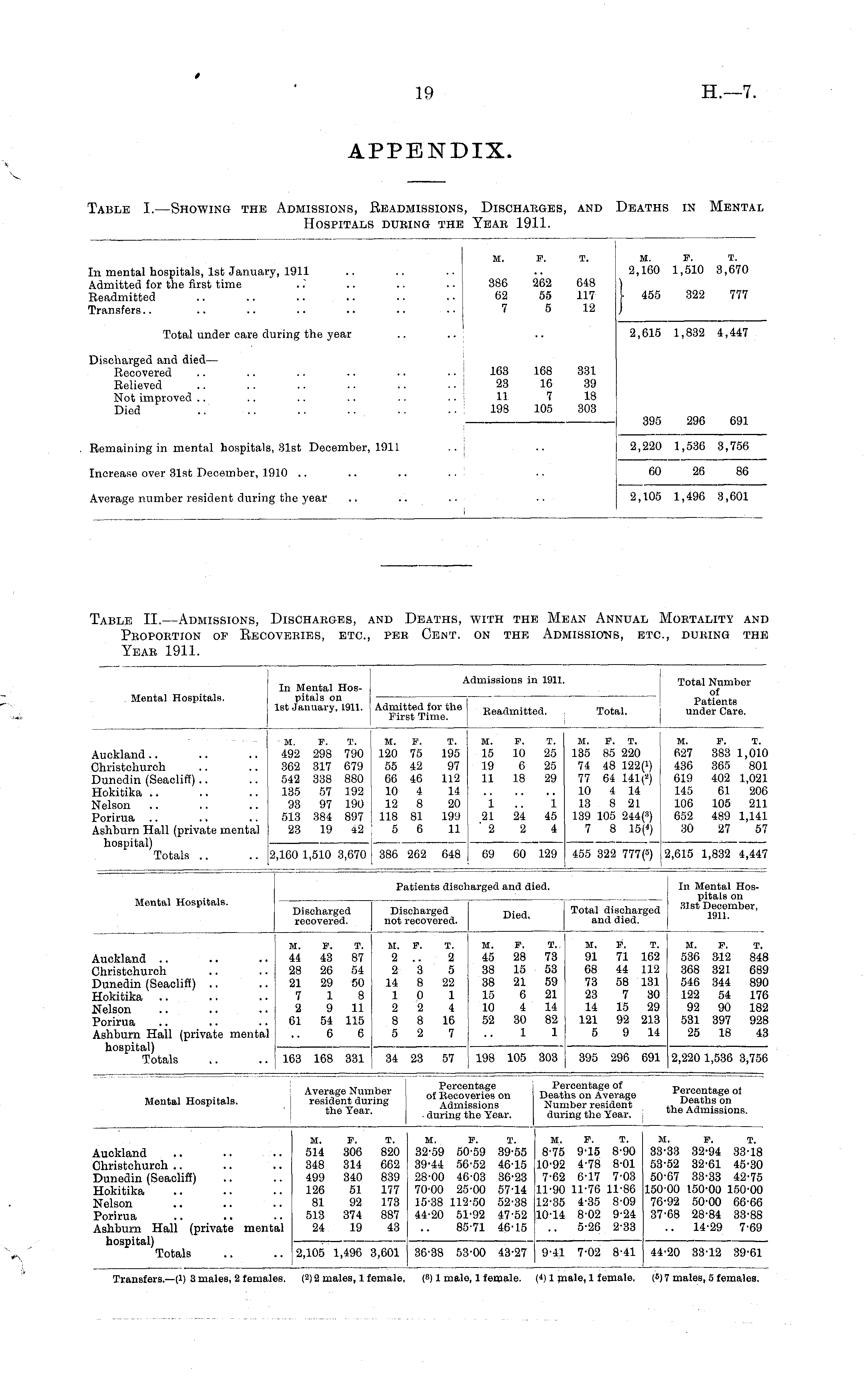 Admissions in 1911. Total Number of Patients under Care. Mental Hospitals. In Mental Hospitals on 1st January, 1911. Admitted for the First Time. Readmitted. Total. tuckland.. Jhristchurch )unedin (Seacliff) lokitika Jelson 'orirua ishburn Hall (private mental hospital) Totals M. F. T. 492 298 790 362 317 679 542 338 880 135 57 192 93 97 190 513 384 897 23 19 42 M. F. 120 75 55 42 66 46 10 4 12 8 118 81 5 6 T. 195 97 112 14 20 199 11 M. 15 19 11 F. 10 6 18 T. 25 25 29 M. F. T. 135 85 220 74 48 122(1) 77 64 141 ( a ) 10 4 14 13 8 21 139 105 244( s ) 7 8 15(*) M. 627 436 619 145 106 652 30 F. T. 383 1,010 365 801 402 1,021 61 206 105 211 489 1,141 27 57 1 21 ' 2 24 2 1 45 4 2,160 1,510 3,670 386 262 648 69 60 129 455 322 777( 5 ) 2,615 1,832 4,447 Patients disci larged and died. In Mental Hospitals on Mental Hospitals. Discharged recovered. Discharged not recovered. Total discharged 31st December, and died. " l ' Died. Auckland Christchurch Dunedin (Seaoliff) Hokitika Nelson Porirua Ashburn Hall (private mental hospital) Totals M. 44 28 21 7 2 61 F. T. 43 87 26 54 29 50 1 8 9 11 54 115 6 6 M. 2 2 14 1 2 8 5 F. 3 8 0 2 8 2 T. 2 5 22 1 4 16 7 M. 45 38 38 15 10 52 F. 28 15 21 6 4 30 1 T. 73 53 59 21 14 82 1 M. 91 68 73 23 14 121 5 F. T. 71 162 44 112 58 131 7 30 15 29 92 213 9 14 M. F. 536 312 368 321 546 344 122 54 92 90 531 397 25 18 T. 848 689 890 176 182 928 43 163 168 331 34 23 57 198 105 303 395 296 691 2,220 1,536 3,756 Mental Hospitals. Average Nun resident dur the Year. iber •ing Peroei of Eecoy Admit during t] ntage 'eries on ssions he Year. Pe: Deatl Nun duri t-centage of is on Average iber resident ing the Year. Percentage of Deaths on the Admissions. Auckland Christchurch Dunedin (Seacliff) Hokitika Nelson Porirua Ashburn Hall (private mental hospital) Totals M. 514 348 499 126 81 513 24 p. 306 314 340 51 92 374 19 T. 820 662 839 177 173 887 43 M. F. T. 32-59 50-59 39-55 39-44 56-52 46-15 28-00 46-03 36-23 70-00 25-00 57-14 15-38 112-50 52-38 44-20 51-92 47-52 85-71 46-15 M. F. T. 8-75 9-15 8-90 10-92 4-78 8-01 7-62 6-17 7-03 11-90 11-76 11-86 12-35 4-35 8-09 10-14 8-02 9-24 .. 5-26 2-33 M. F. T. 33-33 32-94 33-18 53-52 32-61 45-30 50-67 33-33 42-75 150-00 150-00 150-00 76-92 50-00 66-66 37-68 28-84 33-88 14-29 7-69 2,105 1,496 3,601 36-38 53-00 43-27 9-41 7-02 8-41 44-20 33-12 39-61 Transfers.—i 3 males, 2 females. (2) 2 males 1 female. (8) 1 male, 1 female. (4) 1 male, 1 female. (5) 7 males, 6 females.
