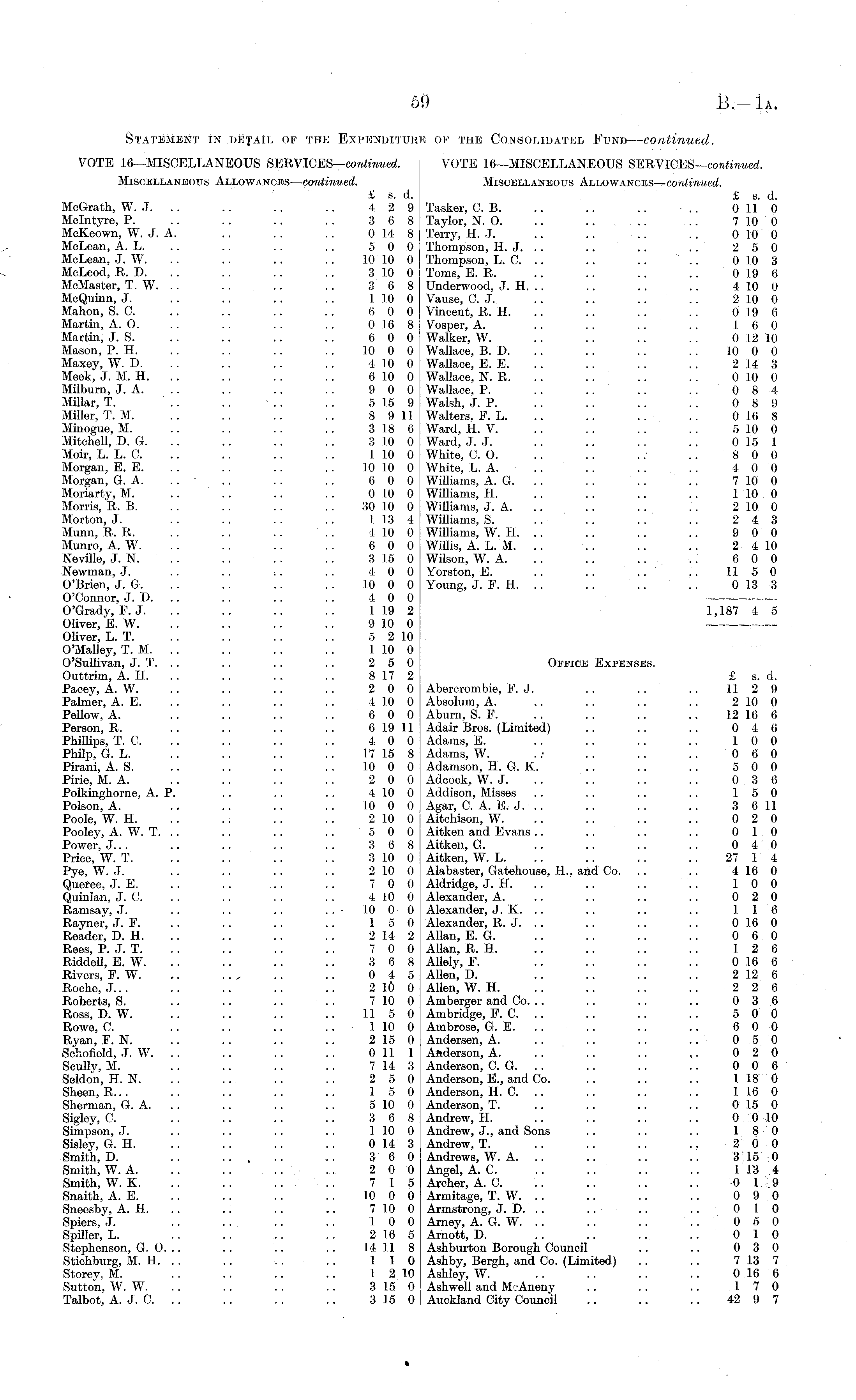 Statement in detail oi. , the Expenditure ok the Consolidated Fund — continued. VOTE 16—MISCELLANEOUS SERVlCES— continued. VOTE 16—MISCELLANEOUS SERVlCES— continued. Miscellaneous Allowances— continued. Miscellaneous Allowances— continued. £ s. d. £ s. d. McGrath, W. J. .. .. .. .. 4 2 9 Tasker, 0. B. .. .. .. .. 011 0 Mclntyre, P. .. . . .. . . .3 6 8 Taylor, N. 0. .. .... .. 710 0 McKeown, W. J. A. .. .. .. 0 J4 8 Terry, H. J. .. .. .. .. 0 10 0 McLean, A. L. .. .. .. . . 5 0 0 Thompson, H. J. .. .. .. .. 2 5 0 McLean, J. W. .. .. .. .. 10 10 0 Thompson, L. C. .. .. .. .. 010 3 MoLeod, R. D. . . .. .. 310 0 Toms, E. R. .. .. .. . . 019 6 MoMaster, T. W. .. . . .. .. 3 6 8 Underwood, J. H. .. .. . . .. 410 0 McQuinn, J. .. .. .. .. 110 0 Vause, C. J. . . .. .. .. 210 0 Mahon, S. C. .. .. .. .. 6 0 0 Vincent, R. H. .. .. .. .. 019 6 Martin, A. O. .. .. . . .. 016 8 Vosper, A. .. ~ .. .. 16 0 Martin, J. S. .. .. .. . . 6 0 0 Walker, W. .. .. .. .. 0 12 10 Mason, P. H. .. .. .. .. 10 0 0 Wallace, B. D. .. .. .. .. 10 0 0 Maxey, W. D. .. .. .. .. 410 0 Wallace, E. E. .. .. .. .. 214 3 Meek, J. M. H. .. .. . . .. 610 0 Wallace, N. R. .. .. .. . . 010 0 Milburn, J. A. .. .. .. .. 9 0 0 Wallace, P. .. .. .. .. 0 8 4 Millar, T. .. .. •.. .. 5 15 9 Walsh, J. P. .. .. .. .. 0 8 9 xMiller, T. M. .. .. .. .. 8 9 11 Walters. F. L. .. .. .. .. 0 16 8 Minogue, M. .. .. .. .. 318 6 Ward, H. V. .. .. . . .. 510 0 Mitchell, D. G. .. .. .. 310 0 Ward, J. J. .. .. . . .. 015 1 Moir, L. L. C. .. .. .. .. 110 0 White, CO. .. .. .: .. 8 0 0 Morgan, E. E. .. .. .. .. 10 10 0 White, L. A. .. .. .. .. 400 Morgan, G. A. . . .. . . .. 6 0 0 Williams, A. G. .. . . .. .. 710 0 Moriarty, M. .. .. .. .. 010 0 Williams, H. .. .. .. .. 110 0 Morris, R. B. . . .. .. . . 30 10 0 Williams, J. A. .. .. .. 2 10 0 Morton, J. .. .. . . .. 113 4 Williams, S. .. .. .. .. 2 4 3 Munn, R. R. .. .. .. .. 4 10 0 Williams, AY. H. .. .. .. .. 9 0 0 Munro, A. W. . . .. .. . . 6 0 0 Willis, A. L. M. .. .. .. .. 2 410 Neville, J. N. . . .. .. .. 315 0 Wilson, W. A. .. .. .. .. 6 0 0 Newman, J. .. .. .. .. 4 0 0 Yorston, E. .. . . .. .. 115 0 O'Brien, J. G. .. .. .. . . 10 0 0 Young, J. F. H. .. .. .. .. 013 3 O'Connor, J. D. .. .. .. .. 4 0 0 O'Grady, F. J. .. .. .. .. 119 2 1,187 4 5 Oliver, E. W. .. .. .. . . 910 0 Oliver, L. T. .. .. .. .. 5 210 O'Malley, T. M. .. .. .. .. 110 0 O'Sullivan, J. T. . . .. . . .. 2 5 0 Office Expenses. Outtrim, A. H. .. .. 817 2 £ s. d. Pacey, A. W. .. .. .. .. 2 0 0 Abercrombie, F. J. .. . . ... 11 2 9 Palmer, A. E. . . .. .. .. 410 0 Absolum, A. .. . . .. .. 210 0 Pellow, A. .. .. .. .. 6 0 0 Aburn, S. F. .. .. .. .. 12 16 6 Person, R. .. .. .. .. 6 19 11 Adair Bros. (Limited) .. .. .. 0 4 6 Phillips, T. C. .. .. .. .. 4 0 0 Adams, E. .. .. .. .. 10 0 Philp, G. L. .. . . . . .. 17 15 8 Adams, W. .: .. .. .. 0 6 0 Pirani, A. S. .. .. .. .. 10 0 0 Adamson, H. G. K. .. .. .. 5 0 0 Pirie, M. A. .. .. . . . . 2 0 0 Adcock, W. J. .. .. .. .. 0 3 6 Polkinghorne, A. P. . . . . .. 410 0 Addison, Misses .. .. .. . . 15 0 Poison, A. .. .. .. .. 10 0 0 Agar, C. A. E. J. .. .. .. .. 3 6 11 Poole, W. H. .. .. .. .. 210 0 Aitchison, W. .. .. .. .. 0 2 0 Pooley, A. W. T. . . .. . . .. 5 0 0 Aitken and Evans .. . . .. .. 0 10 Power, J. .. .. .. .. .. 3 6 8 Aitken, G. . . .. .. .. 0 4 0 Price, W. T. .. .. .. . . 310 0 Aitken, W. L. .. .. .. .. 27 1 4 Pye, W. J. .. .. . . .. 210 0 Alabaster, Gatehouse, H., and Co. .. .. 416 0 Queree, J. E. . . .. .. .. 7 0 0 Aldridge, J. H. . . .. .. .. 10 0 Quinlan, J. 0. . . .. .. .. 410 0 Alexander, A. .. .. .. .. 0 2 0 Ramsay, J. .. .. . . .. - 10 0 0 Alexander, J. K. .. .. .. .. 116 Rayner, J. F. .. .. .. .. 15 0 Alexander, R. J. . . .. . . .. 016 0 Reader, D. H. .. .. .. . . 2 14 2 Allan, E. G. .. . . .. .. 0 6 0 Rees, P. J. T. .. .. .. . . 7 0 0 Allan, R. H. .. .. .. .. 12 6 Riddell, E. W. .. .. .. .. 3 6 8 Allely, F. .. .. . . .. 016 6 Rivers, F. W. .. .. „ .. .. 045 Allen, D. .. .. .. .. 2 12 6 Roche, J. . . .. .. . . .. 210 0 Allen, W. H. .. .. .. .. 2 2 6 Roberts, S. .. .. .. . . 710 0 Amberger and Co. .. .. . . .. 0 3 6 Ross, D. W. .. .. .. .. 11 5 0 Ambridge, F. C. .. .. .. .. 5 0 0 Rowe, C. .. .. .. .. 110 0 Ambrose, G. E. .. .. .. .. 6 0 0 Ryan, F. N. .. .. .. .. 215 0 Andersen, A. .. .. .. .. 0 5 0 Sohofield, J. W. .. .. .. .. 011 1 Anderson, A. .. .. .. ~ 0 2 0 Scully, M. .. .. .. . . 714 3 Anderson, C. G. .. .. .. .. 0 0 6 Seldon, H. N. . . .. .. .. 2 5 0 Anderson, E., and Co. .. .. .. 118 0 Sheen, R... . . .. . . .. 15 0 Anderson, H. C. .. .. .. .. 116 0 Sherman, G. A. .. .. . . .. 5 10 0 Anderson, T. .. .. .. .. 0 15 0 Sigley, C. . . .. .. .. 3 6 8 Andrew, H. .. .. .. .. 0 010 Simpson, J. .. .. .. .. 110 0 Andrew, J., and Sons .. .. .. 18 0 Sisley, G. H. .. . . .. . . 014 3 Andrew, T. .. .. .. .. 2 0 0 Smith, T>. . . . . 3 6 0 Andrews, W. A. .. .. .. .. 315 0 Smith, W. A. .. .. .. .... 2 0 0 Angel, A. C. .. .. .. .. 1 13 i Smith, W. K. .. .. .... 715 Archer, A. C. .. .. . . .. 019 Snaith, A. E. .. .. .. .. 10 0 0 Armitage, T. W. . . .. .. .. 0 9 0 Sneesby, A. H. .. .. . . .. 7 10 0 Armstrong, J. D. .. .. .. .. 0 10 Spiers, J. . . .. .. .. 10 0 Arney, A. G. W. .. .. .. .. 0 5 0 Spiller, L. .. .. .. .. 216 5 Arnott, D. .. .. .. .. 0 10 Stephenson, G. O. .. .. .. .. 14 11 8 Ashburton Borough Council .. .. 0 3 0 Stichburg, M. H. .. .. . . .. 110 Ashby, Bergh, and Co. (Limited) .. .. 713 7 Storey. M. .. . . .. .. 1 210 Ashley, W. .. .. .. .. 016 6 Sutto'n, W.W. .. .. .. .. 315 0 Ashwell and McAneny .. .. .. 17 0 Talbot, A. J. C. .. .. .. .. 315 0 Auckland City Council .. .. .. 42 9 7