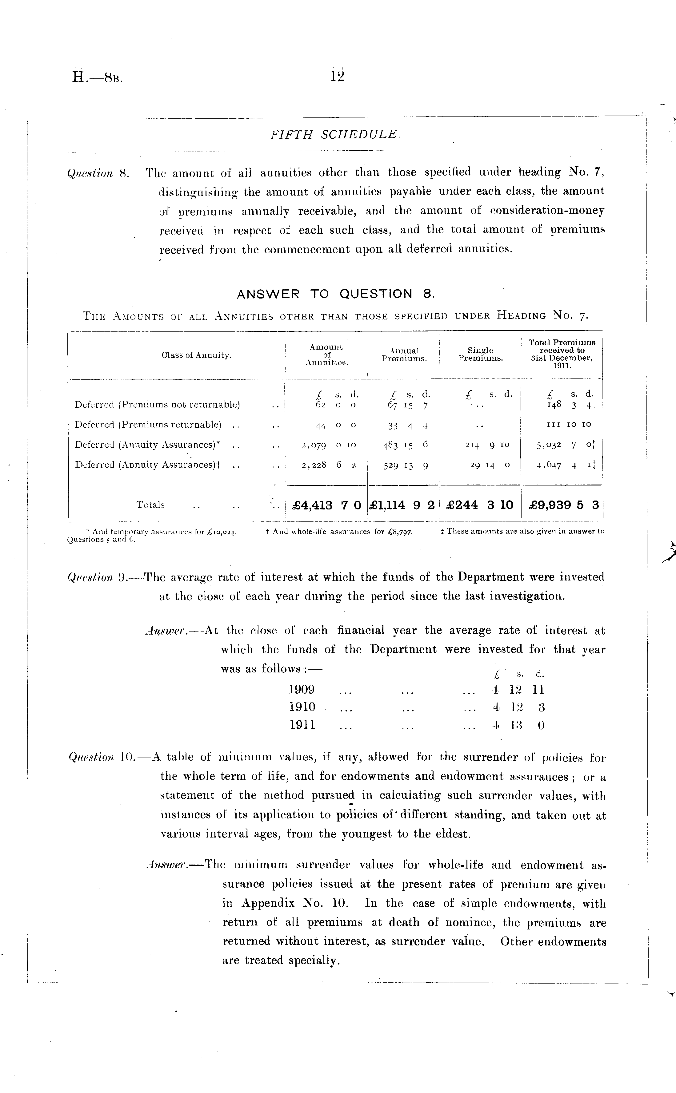 : * And temporary assurances for £10,024. '' And whole-life assurances for £8,797. t These amounts are also given in answer to Questions 5 and 6. Question 'J. —The average rate of interest at which the funds of the Department were invested at the close of each year during the period since the last investigation. Answer. —At the close of each financial year the average rate of interest at which the funds of the Department were invested for that year was as follows : — / s d 1909 ... ... ... 4 12 11 1910 ... ... ... 4 12 8 1911 ... ... ... 4 13 0 Question 10. —A table of minimum values, if any, allowed for the surrender of policies for the whole term of life, and for endowments and endowment assurances ; or a statement of the method pursued in calculating such surrender values, with instances of its application to policies of different standing, and taken out at various interval ages, from the youngest to the eldest. Answer. —The minimum surrender values for whole-life and endowment assurance policies issued at the present rates of premium are given in Appendix No. 10. In the case of simple endowments, with return of all premiums at death of nominee, the premiums are returned without interest, as surrender value. Other endowments arc treated specially.