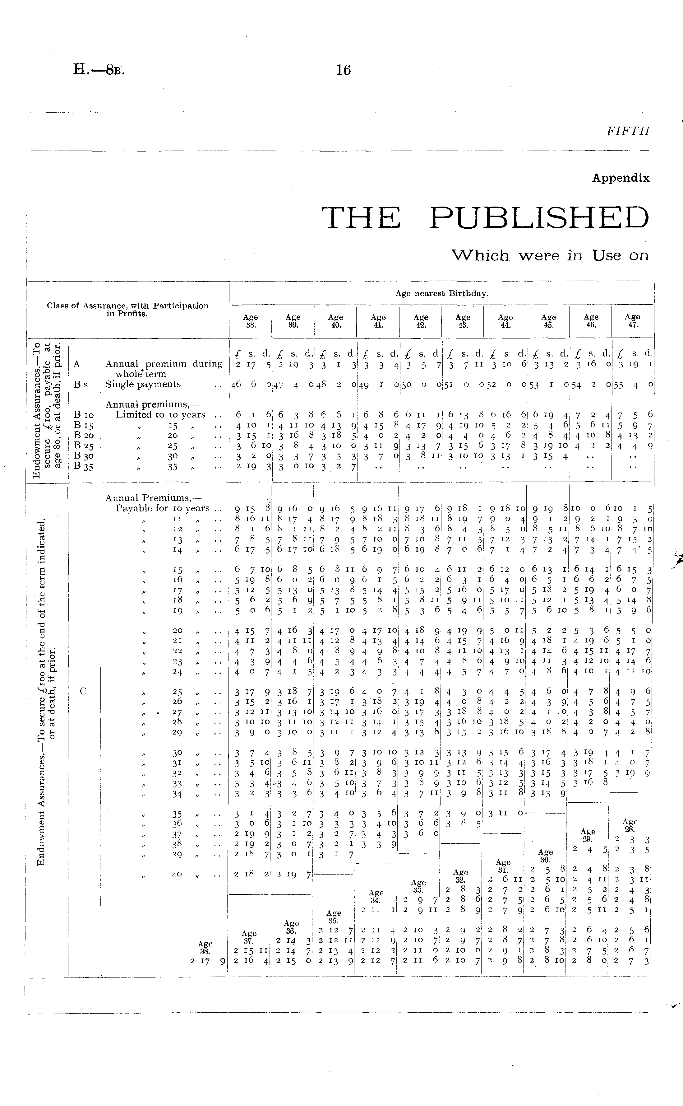 Class of Assurance, with Participation in Profits. Age 38. Age 39. Age 40. Age 41. Ag( Age nearest Birthday. ;e neare Age 42. est Hirthdi Age 43. lay. Age 44. Age 45. Age 46. Age 47. I «) Q, 3 D yi O 2 rt PS*' a £ s. d Annual premium during 2 17 e whole" term Single payments .. 46 6 c £ s. d. \£ s. d.l/ s. d. £ s. d. i 2 19 3 3 1 3 3 3 4 3 5 7 £ s. d.| £ s. d.| £ s. d.j £ s. d.| 3 7 11 3 10 6 3 13 23 16 o [ 3 19 I A Bs 147 4 o 48 2 0I49 1 O|5o 0 oi 51 0 052 o 053 1 0154 2 o] 155 4 o B 10 B15 B20 B2 5 B 30 B35 Annual premiums,— Limited to 10 years .. : 6 1 t „ 15 I, • • ! 4 10 j 20 „ .. : 3 15 i 25 „ 3 6 ic 30 „ ..32c 35 » ■■ 2 19 : i 6 3 8 6 6 16 8 6 6 11 1 4 II J o 4 13 9j 4 J 5 8417 9 3 16 8 3 18 5, 4 o 2i 4 2 o 13 8 4 3 10 o 3 11 9 3 »3 7 1 3 3 7, 3 5 3 3 7 ° 3 8 11 i 3 o 10! 3 2 7 6 13 8 J 6 16 6| 6 .19 4I 7 2 4 4 19 ioi 5 2 25 4 65 6 11 440462484: 4 10 8 3 15 6 3 17 8 3 19 10; 4 2 2 3 10 io, 3 13 ij 3 15 4 7 5 6 5 9 7 4 13 2 4 4 9 I ■d 0 E 1OJ <D .0 o Id a aj a> ■£ * o P 11 u q B 0 t/: < 4) o a W j ; c Annual Premiums, — Payable for 10 years ..1915 8 „ 11 „ .. 8 16 11 12 „ .. 8 1 6 13 „ ...J7 8 5 14 „ .. 6 17 5 15 „ .. 6 7 10 16 „ .. I 5 19 8 17 » •• 5 12 5 18 „ .. 5 6 2 19 „ .. 5 o 6 20 „ .. 4 15 7 „ 21 „ ..14112 22 „ .. ; 4 7 3 23 „ . . 4 3 9 24 „ .. 4 o 7 25 „ .. 3 17 91 „ 26 „ . . 3 15 2< „ . 27 „ . . 3 12 11 28 „ .. 3 10 ioj 29 „ .. 3 9 o 30 „ • ■ 3 7 4 3 1 • •• 3 5 IO 32 » • • 3 4 fi 33 . •■ 3 3 4 34 " ■ ■ 3 2 3 35 » •• 3 1 4 36 „ .. 306 37 » ■ ■ 2 19 9 38 „ .. 2 19 2 „ ■ 39 „ .. 2 18 7, 9 l6 Oj 8 17 4 8 1 11 7 8 11 6 17 10 6 8 5 602 5 13 o 5 6 9 5 1 2 4 16 3| 4 11 11 480 446 ; 4 1 5; 'J 9 16 5; 9 l6 II 8 17 9 8 18 3 8 2 48 2 11 7 9 5 7 10 o l6l8 5! 6 19 O: 6 8 11 6 9 7 "6 o 91 6 I 5 • 5 13 8 5 14 4 5 7 5i 5 8 1 5 1 ioj 5 2 8 ,j 4 17 O 4 I7 10; 4 12 84 13 4 489498 4 5 4 4 6 3 423433 I 9 17 6 9 18 19 18 10 : 8 18 11 8 19 79 o 4 836843850 1 7 10 8 7 11 57 12 3| i| 6 19 87 o 67 1 4 6 10 4! 6 11 2: 6 12 o 62 2 63164 o 1 5 15 2 5 I6 O, 5 17 O 5 8 11 5 9 ni 5 to 11 536546557 i| 4 18 g, 4 19 9; 5 on 4 14 6 4 15 7 4 16 9 4 10 8 4 11 10 4 13 ii 4 7 4 ! 4 8 64 9 10 44445 f 47°| ) 9 19 8 10 o 610 1 5 .912921930 ) 8 5 11 8 6 10 8 7 10 ; 7 13 27 14 II 7 15 2 ■' 7 2 4 7 3 4j 7 4' 5 1613 1614 1 6 15 3 165 1662675 i| 5 18 2 5 19 4! 6 o 7 5 12 15 13 4 5 M 8 5 f> 10 5 8 1 s 9 6 522536550 4 18 1 4 19 65 1 o I 4 14 6 4 15 11 4 17 7 'I 4 11 3 4 12 10 4 14 6 > 4 8 6! 4 10 1 4 Ti 10 i 3 l8 7! ! 3 16 1 3 X 3 101 3 I: Io | 3 Io ° j 3 19 6; 4 O 7 j 3 17 I' 3 18 2 ' 3 14 10 3 16 o I 3 12 11 3 14 1 3 11 1 3 12 4 4 I 8 4 3 oj 4 4 5 3 19 4! 4 o 84 2 2 317 3-318 84 o 2 3 15 43 16 10 3 i8 5] 3 13 8 3 15 2 3 16 io[ 146 O! 47849 6i 439456475! 4 I 10 4 3 8 4 5 7I '402420! 440 J 3 18 84 o 7| 4 2 8 3 8 5! 3 6 11: 3 5 8 - 3 4 6 3 3 6 3 9 7 3 Io IO 382396 3 6 IIj 3 8 3 3 5 10 3 7 3 3 4 i°' 3 6 4 3 12 31 3 13 9 3 15 6 3 10 ii ; 3 12 6 3 14 4; 3 9 9\ 3 rl 5 3 13 3 3 8 9 3 10 6j 3 12 5 3 7 ill 3 9 81311 8 1 3 7 2! 3 9 o 3 11 o3 6 6 3 8 5 ! 360 ! 1 j 3 17 4 j 3 19 44 1 7 3 16 3: 3 18 14 o 7 3 15 3 3 17 5 3 '9 9 j 3 14 5 3 ' fi 8 ' 3 13 9 ] Age Age 28- ; . 29. 2 3 3; Age : 2 4 5i 2 3 5 I ! 30. I 2 5 8: 2 4 8; 2 3 8 2 5 10 2 4 11 2 3 11 26 i ! 252243 2 6 5; 2 5 6| 2 4 8; 2 6 10! 2 5 11 2 5 1 327 3 1 10 3 1 2 307: 301 3 4 O 356 3 3 3 3 4 10 327343 321339 I 3 ' 7 40 „ .. 2 18 2 1 2 19 7 Age j i Age 31. Age 32. 2 6 11 33. 283272 29 7: 28 6j 275 2 9 11 2 8 9; 2 7 9, Age Age 37. 38. 2 15 II 2 17 9 2 l6 4 34. Age j 2 » I Age 3S - Age 36- 2 I2 7 2 II 4 37. 2 14 3j 2 12 II 2 II 9 2 15 II 2 14 7! 2 13 4 2 12 2 2 l6 4j 2 15 O 2 13 9 2 12 7 i I J 2 10 32 9 2: 2 8 2I 2 10 7 | 2 9 7, 2 8 71 2 11 o 2 10 02 9 1 2 11 62 10 72 9 8 27 3; 26 4I 256 2 7 8 2 6 10 2 6 1 28 3, 275267 2 8 io| 280273