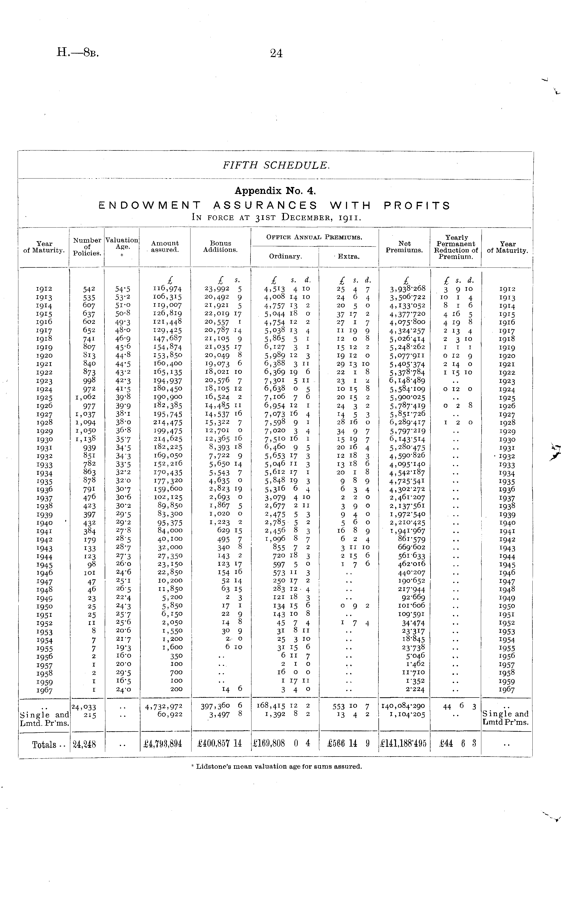 Year of Maturity. Number of Policies. Valuation Age. Amount assured. Additions. Bonus Oitick Annual Pbemiums. Net Premiums. Yearly Permanent Year Reduction of of Maturity. Premium. Ordinary. Extra. 1912 1913 1914 1915 1916 1917 1918 1919 1920 1921 1922 1923 1924 1925 1926 1927 1928 1929 1930 I93i 1932 1933 1934 1935 1936 1937 1938 1939 1940 1941 1942 1943 1944 1945 1946 1947 1948 1949 1950 1951 1952 1953 1954 1955 1956 1957 1958 1959 1967 542 535 607 637 602 652 74i 807 813 840 873 998 972 1,062 977 i,037 1,094 1,050 1,138 939 851 782 863 878 79i 476 423 397 432 384 179 133 123 98 101 54-5 S3- 2 5i-o 50-8 49-3 48-0 46-9 45-6 44-8 44'5 43'2 42-3 41-5 39-8 39-9 38-1 38-o 36-8 35-7 34-5 34'3 33-5 32-2 32'0 30-7 3o-6 30-2 29-5 29-2 27-8 28-5 28-7 27-3 26-0 24-6 25-1 265 22-4 24-3 25-7 25-6 20-6 217 19-3 16-0 £ 116,974 106,315 119,007 126,819 121,448 129,425 147,687 154,874 153,850 160,400 165,135 194.937 180,450 190,900 182,385 195,745 214,475 199,475 214,625 182,225 169,050 152,216 170,435 177,320 159,600 102,125 89,850 83,300 95,375 84,000 40,100 32,000 27,350 23,150 22,850 10,200 11,850 5,200 5,850 6,150 2,050 1,550 1,200 1,600 350 100 £ s. 23.992 5 20,492 9 21,921 5 22,019 17 20,557 1 20,787 .14 21,105 9 21,035 17 20,049 8 19,073 6 18,021 10 20,576 7 18,105 12 16,524 2 14,485 11 14.537 16 15,322 7 12,701 o 12,365 16 8,393 18 7,722 9 5,650 14 5,543 7 4,635 o 2,823 19 2,693 o 1,867 5 1,020 o 1,223 2 629 15 495 7 340 8 143 2 123 17 154 16 52 14 63 15 2 3 17 1 22 9 14 8 3° 9 2. o 6 10 £ s- d. 4,513 4 10 4,008 14 10 4,757 13 2 5,044 18 o 4,754 12 2 5,038 13 4 5,865 5 1 6,127 3 1 5,989 12 3 6,388 3 11 6,369 19 6 7,301 5 11 6,638 o 5 7,106 7 6 6,954 12 1 7,073 16 4 7,598 9 1 7,020 3 4 7,510 16 1 6,460 9 5 5,653 17 3 5,046 11 3 5,612 17 1 5,848 19 3 5,3 l6 6 4 3,079 4 10 2,677 2 11 2,475 5 3 2,785 5 2 2,456 8 3 1,096 8 7 855 7 2 720 18 3 597 5 o 573 11 3 250 17 2 283 12. 4 121 18 3 134 15 6 143 10 8 45 7 4 31 8 11 25 3 10 31 15 6 6 11 7 210 16 o o 1 17 11 3 4 0 £ s. d. 25 4 7 24 6 4 20 5 o 37 17 2 27 1 7 11 19 9 1208 15 12 2 19 12 o 29 13 10 22 "1 8 23 1 2 10 15 8 20 15 2 24 3 2 14 5 3 28 16 o 34 9 7 15 19 7 20 16 4 12 18 3 13 18 6 20 1 8 9 8 9 6 3 4 220 3 9 0 940 560 16 8 9 624 3 I 1 10 2 15 6 176 £ 3,938-268 3,506722 4,133-052 4,377-720 4,075-800 4,324-257 5,026-414 5,248-262 5,077-911 5,405-374 5,378-784 6,148-489 5,584-109 5,900-025 5,787-419 5,851-726 6,289-417 5,797-219 6,143-514 5,280-475 4,590-826 4,095-140 4,542-187 4,725-541 4,302-272 2,461-207 2,137-561 1,972-540 2,210-425 1,941-967 861-579 669-602 561633 462-016 440-207 190-652 217-944 92-669 101-606 £ s. d. 3 9 10 10 1 4 8 1 6 4 16 5 4 19 8 2 13 4 2 3 10 111 0 12 9 2 14 o 1 15 10 O 12 O 0 2 8 I20 1912 1913 1914 1915 1916 1917 1918 1919 1920 1921 1922 1923 1924 1925 1926 1927 1928 1929 1930 1931 ■ 1932 1933 1934 1935 1936 1937 1938 1939 1940 1941 1942 1943 1944 1945 1946 1947 1948 1949 1950 1951 1952 1953 1954 1955 1956 1957 1958 1959 1967 47 46 23 25 25 11 8 092 7 7 2 1 7 4 109-591 34-474 23-3I7 18-845 23-738 5-046 1-462 11-710 1-352 2-224 1 20-O 29-5 16-5 24-0 2 1 700 100 200 14 6 1 Single and [iirttd. Pr'ms. 24,033 215 4.732.972 60,922 397 > 360 6 3,497 8 168,415 12 2 1,392 8 2 553 10 7 13 4 2 140,084-290 1,104-205 44 6 3 Single and Lmtd Pr'ms. Totals ■ 24,248 £4,793,894 £'400,857 14 1169,808 0 4 £566 14 9 £141,188'495 m 6 3 * Lidstonc's meai valuation age for s ims assured.