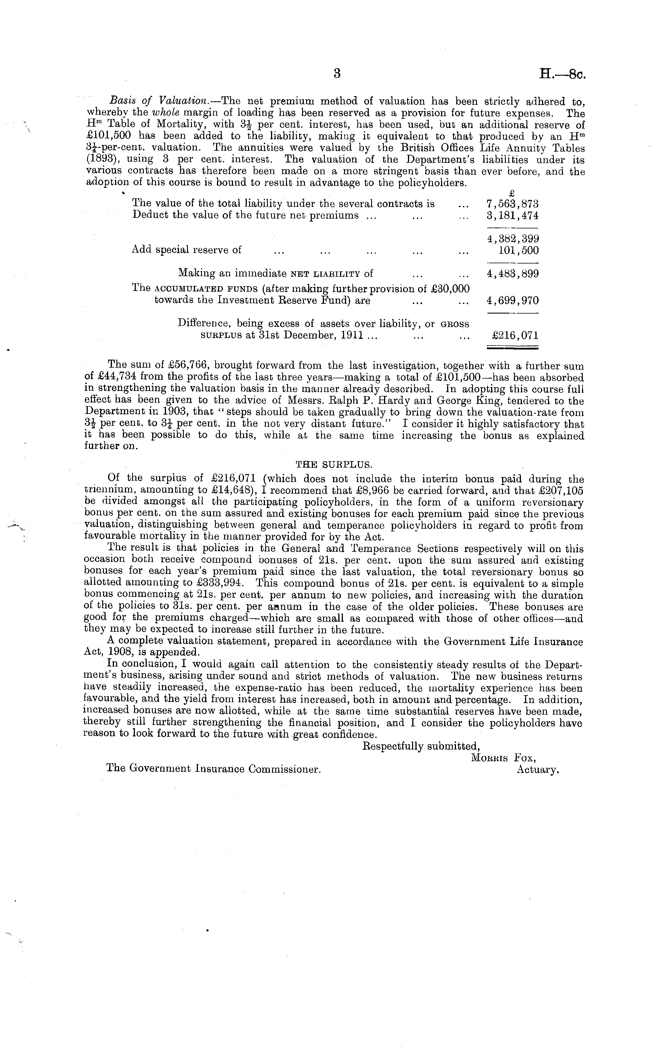 Basis of Valuation. —The net premium method of valuation has been strictly adhered to, whereby the whole margin of loading has been reserved as a provision for future expenses. The H m Table of Mortality, with 3-| per cent, interest, has been used, but an additional reserve of £101,500 has been added to the liability, making it equivalent to that produced by an H m 3J-per-cent. valuation. The annuities were valued by the British Offices Life Annuity Tables (1893), using 3 per cent, interest. The valuation of the Department's liabilities under its various contracts has therefore been made on a more stringent basis than ever before, and the adoption of this course is bound to result in advantage to the policyholders. £ The value of the total liability under the several contracts is ... 7,563,873 Deduct the value of the future net premiums ... ... ... 3,181,474 4,382,399 Add special reserve of ... ... ... ... ... 101,500 Making an immediate net liability of ... ... 4,483,899 The accumulated funds (after making further provision of £30,000 towards the Investment Eeserve Fund) are ... ... 4,699,970 Difference, being excess of assets over liability, or gross surplus at 31st December, 1911 ... ... ... £216,071 The sum of £56,766, brought forward from the last investigation, together with a further sum of £44,734 from the profits of the last three years—making a total of £101,500—has been absorbed in strengthening the valuation basis in the manner already described. In adopting this course full effect has been given to the advice of Messrs. Ealph P. Hardy and George King, tendered to the Department in 1903, that " steps should be taken gradually to bring down the valuation-rate from 3| per cent, to 3J per cent, in the not very distant future." I consider it highly satisfactory that it has been possible to do this, while at the same time increasing the bonus as explained further on. THE SURPLUS. Of the surplus of £216,071 (which does not include the interim bonus paid during the triennium, amounting to £14,648), I recommend that £8,966 be carried forward, and that £207,105 be divided amongst all the participating policyholders, in the form of a uniform reversionary bonus per cent, on the sum assured and existing bonuses for each premium paid since the previous valuation, distinguishing between general and temperance policyholders in regard to profit from favourable mortality in the manner provided for by the Act. The result is that policies in the General and Temperance Sections respectively will on this occasion both receive compound bonuses of 21s. per cent, upon the sum assured and existing bonuses for each year's premium paid since the last valuation, the total reversionary bonus so allotted amounting to £333,994. This compound bonus of 21s. per cent, is equivalent to a simple bonus commencing at 21s. per cent, per annum to new policies, and increasing with the duration of the policies to 31s. per cent, per annum in the case of the older policies. These bonuses are good for the premiums charged—which are small as compared with those of other offices—and they may be expected to increase still further in the future. A complete valuation statement, prepared in accordance with the Government Life Insurance Act, 1908, is appended. In conclusion, I would again call attention to the consistently steady results of the Department's business, arising under sound and strict methods of valuation. The new business returns have steadily increased, the expense-ratio has been reduced, the mortality experience has been favourable, and the yield from interest has increased, both in amount and percentage. In addition, increased bonuses are now allotted, while at the same time substantial reserves have been made, thereby still further strengthening the financial position, and I consider the policyholders have reason to look forward to the future with great confidence. Eespectfully submitted, Morris Fox, The Government Insurance Commissioner. Actuary.