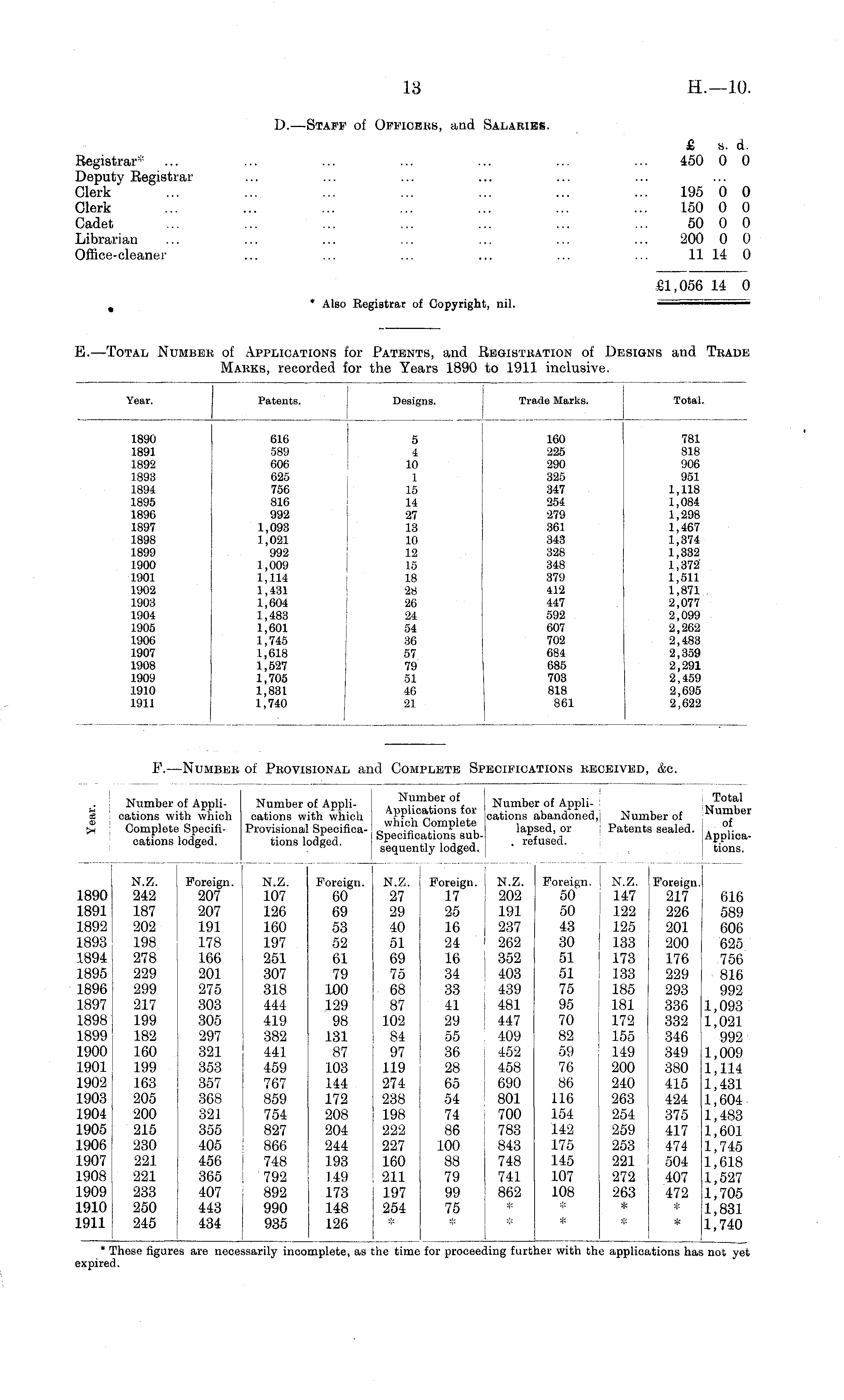 E.—Total Number of Applications for Patents, and Registration of Designs and Trade Marks, recorded for the Years 1890 to 1911 inclusive.