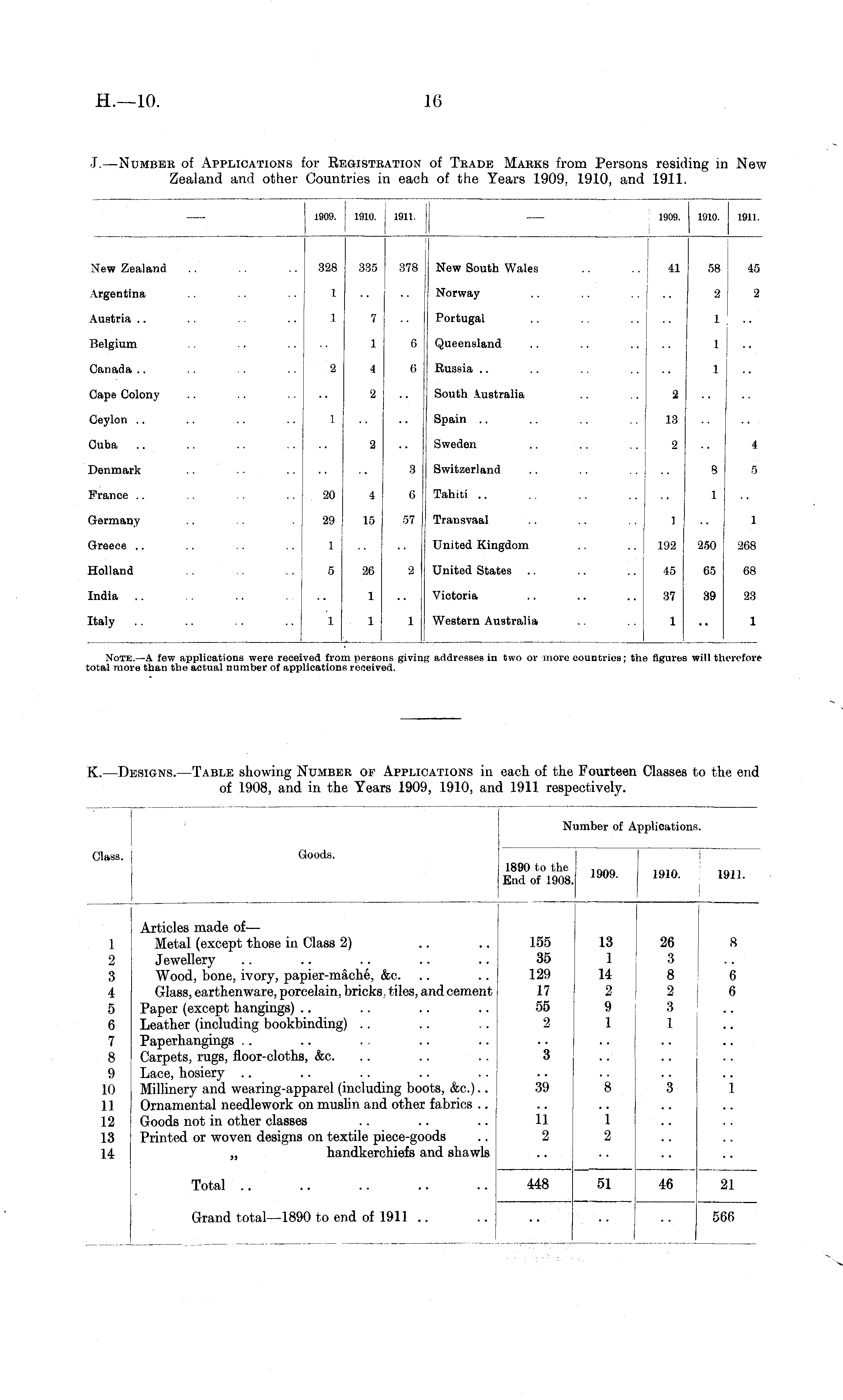 J.—Number of Applications for Registration of Trade Marks from Persons residing in New Zealand and other Countries in each of the Years 1909, 1910, and 1911.