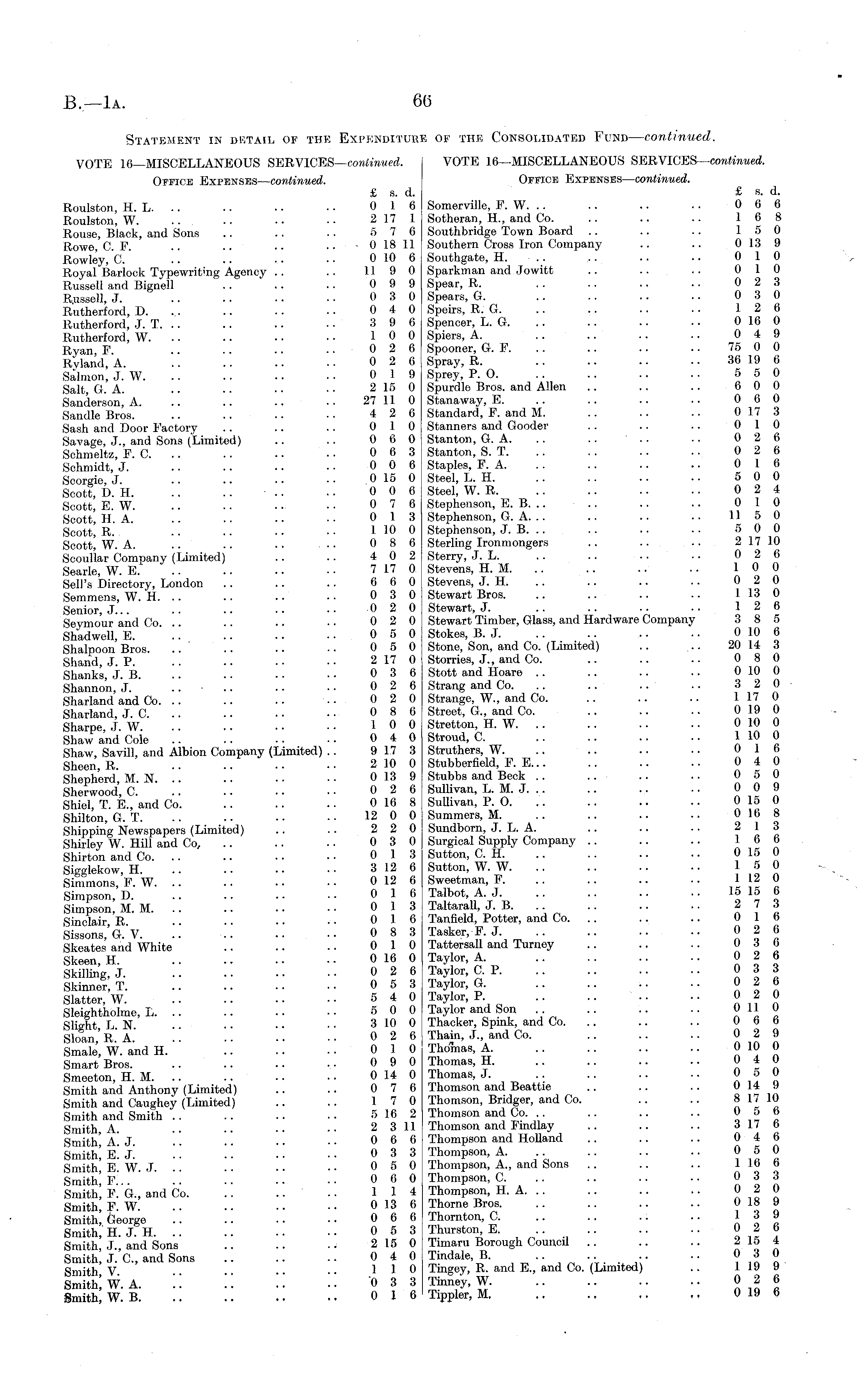 Statement in dktail op the Expenditure op the Consolidated Fund — continued. VOTE 16—MISCELLANEOUS SERVlCES— continued. VOTE 16—MISCELLANEOUS SERVlCES— continued. Okfice Expenses— continued. Office Expenses— continued. £ s. d. £ s. d. Roulston, H. L. .. .. .. • ■ 0 16 Somerville, F. W. .. .. .. .. 0 6 6 Roulston, W. .. .. ■ ■ • • 217 1 Sotheran, H., and Co. .. .. .. 16 8 Rouse, Black, and Sons .. .. .. 5 7 6 Southbridge Town Board .. .. .. 15 0 Rowe C F .. .. •• 0 18 11 Southern Cross Iron Company .. .. 0 13 9 Rowley, C. .. .. ■ ■ ■ • 010 6 Southgate, H. . . .. .. .. 0 10 Royal Barlock Typewriting Agency .. .. 119 0 Sparkman and Jowitt .. .. .. 0 10 Russell and Bignell .. .. .. 0 9 9 Spear, R. .. .. .. -. 0 2 3 Russell, J. .. .. • • • • 0 3 0 Spears, G. .. .. .. .. 0 3 0 Rutherford, D. .. .. .. .. 0 4 0 Speirs, R. G. .. .. .. .. 12 6 Rutherford, J. T. .. .. .. .. 3 9 6 Spencer, L. G. .. .. .. .. 016 0 Rutherford, W. .. .. • • • ■ 10 0 Spiers, A. .. .. .. .. 0 4 9 Rvan F .. .. ..026 Spooner, G. F. .. .. .. .. 75 0 0 Ryland, A 0 2 6 Spray, R. 36 19 6 Salmon, J. W 0 19 Sprey, P. 0 5 5 0 Salt, G. A. .. .. .. ■ • 215 0 Spurdle Bros, and Allen .. .. .. 6 0 0 Sanderson, A. .. .. .. •■ 27 11 0 Stanaway, E. .. .. .. .. 0 6 0 Sandle Bros. .. .. .. • • 4 2 6 Standard, F. and M. .. .. .. 017 3 Sash and Door Factory .. .. .. 0 10 Stanners and Gooder .. .. .. 0 10 Savage, J., and Sons (Limited) .. .. 0 6 0 Stanton, G. A. .. .. .. .. 0 2 6 Sehmeltz, F. C 0 6 3 Stanton, S. T 0 2 6 Schmidt, J 0 0 6 Staples, F. A 0 16 Scorgie J .. .. .. • ■ 015 0 Steel, L. H. .. . . .. .. 5 0 0 Scott, D. H .. .. 0 0 6 Steel, W. R 0 2 4 Scott, E. W. .. . • ■ • • ■ 0 7 6 Stephenson, E. B. .. .. .. .. 0 10 Scott H 4 .. .. .. .. 013 Stephenson, G. A. .. .. .. .. 11 5 0 Scott, R. .. .. • • • • 1 10 0 Stephenson, J. B. .. .. .. .. 5 0 0 Scott, W. A. .. .. . • • • 0 8 6 Sterling Ironmongers .. .. .. 217 10 Scoullar Company (Limited) .. .. 4 0 2 Sterry, J. L. .. .. .. .. 0 2 6 Searle, W. E. .. .. .. .. 717 0 Stevens, H. M. .. .. .. .. 10 0 Sell's Directory, London .. .. .. 6 6 0 Stevens, J. H. .. .. .. .. 0 2 0 Semmens, W. H. .. .. . - ■ • 0 3 0 Stewart Bros. .. .. .. .. 113 0 Senior, J 0 2 0 Stewart, J. 12 6 Seymour and Co .. ..020 Stewart Timber, Glass, and Hardware Company 385 Shadwell, E. 0 5 0 Stokes, B. J 0 10 6 Shalpoon Bros. .. .. .. •• 050 Stone, Son, and Co. (Limited) .. .. 20 14 3 Shand, J. P. .. .. •• •• 2 17 0 Storries, J., and Co. .. .. .. 0 8 0 Shanks, j. B. .. .. .•■• 0 3 6 Stott and Hoare .. .. .. .. 010 0 Shannon, J. .... .. • • 026 Strang and Co. .. .. .. .. 320 Sharland and Co. .. .. .. • • 0 2 0 Strange, W., and Co. .. .. .. 117 0 Sharland, J. C 0 8 6 Street, G., and Co. 0 19 0 Sharpe J W .. ■ • ■•10 0 Stretton, H. W. .. .. .. .. 010 0 Shaw and Cole 0 4 0 Stroud, C. 1 10 0 Shaw, Savill, and Albion Company (Limited) .. 917 3 Struthers, W. .. .. .. • • 0 1b Sheen R .. • • • • 210 0 Stubberfield, F. E... .. .. .. 0 4 0 Shepherd', M. N 0 13 9 Stubbs and Beck .. .. .. .. 050 Sherwood C .. .. • • 0 2 6 Sullivan, L. M. J. .. .. .. .. 0 0 9 Shiel, T. E., and Co 0 16 8 Sullivan, P. 0 0 15 0 Shilton, G. T 12 0 0 Summers, M 0 16 8 Shipping Newspapers (Limited) .. .. 22 0 Sundborn, J. L. A. .. .. .. 213 Shirley W. Hill and Co, .. .. .. 0 3 0 Surgical Supply Company .. .. .. 16 6 Shirton and Co 0 13 Sutton, C. H 0 15 0 Sigglekow, H 3 12 6 Sutton, W. W 15 0 Simmons, F. W 0 12 6 Sweetman, F 1 12 0 Simpson, D 0 16 Talbot, A. J 15 15 6 Simpson, M. M 0 13 Taltarall, J. B 2 7 3 Sinclair R • • ..016 Tanfield, Potter, and Co. .. .. .. 016 Sissons/G.'v 0 8 3 Tasker, F. J 0 2 6 Skeates and White .. .. ■ ■ 0 10 Tattersall and Turney .. .. .. 0 3 b Skeen H .. 016 0 Taylor, A. .. .. .. .. 0 2 6 Ikiihngj. :: :: .. ::.<>■«• ?&<*:& v 033 Skinner, T 0 5 3 Taylor, G 0 2 6 Slatter W .. •• •■ ■• 540 Taylor, P. .. .. .. .. 0 2 0 Sleightholme, D. ! '. .'. .. ■ ■ 5 0 0 Taylor and Son 011 0 Slight L N .. 3 10 0 Thacker, Spink, and Co. .. .. .. 0 6 6 sSJe. , A." :: 02 6 Thain, J., and Co 02 9 Smale, W. and H. 0 10 Thomas, A 0 10 0 Smart Bros 0 9 0 Thomas, H 0 4 0 Smeeton, H. M 0 14 0 Thomas, J. 0 5 0 Smith and Anthony (Limited) .. .. 0 7 6 Thomson and Beattie .. .. .. 0 14 9 Smith and Caughey (Limited) .. .. 17 0 Thomson, Bridger, and Co. .. .. 8 17 10 Smith and Smith 5 16 2 Thomson and Co 0 5 b Smith, A. .. .. ■• •■ 2 3 11 Thomson and Findlay .. .. .. 3 17 b Smith' a' J ..066 Thompson and Holland .. .. .. 046 Smith! e!j! !! .. •• •• 03 3 Thompson, A. . 05 0 Smith E W J ..050 Thompson, A., and Sons .. .. .. 1 lb b Smith! P... ' '.'. '.'■ ■■ •■ 06 0 Thompson, C 03 3 Smith, F. G., and Co 114 Thompson, H. A Smith, F. W 0 13 6 Thorne Bros 0 18 9 Smith, George 0 6 6 Thornton, C .. \ * % Smith, H. J. H 0 5 3 Thurston, E. .. 0 2 6 Smith, J., and Sons 2 15 0 Timaru Borough Council 2 15 4 Smith, J. C, and Sons 0 4 0 Tindale, B. . .. .. 0 3 0 Smith V 110 Tingey, R. and E., and Co. (Limited) .. 119 9 Smith! W. A. I! I. .. .. 03 3 Tinney, W 02 6 Smith, W. B 0 16 Tippler, M 0 19 6