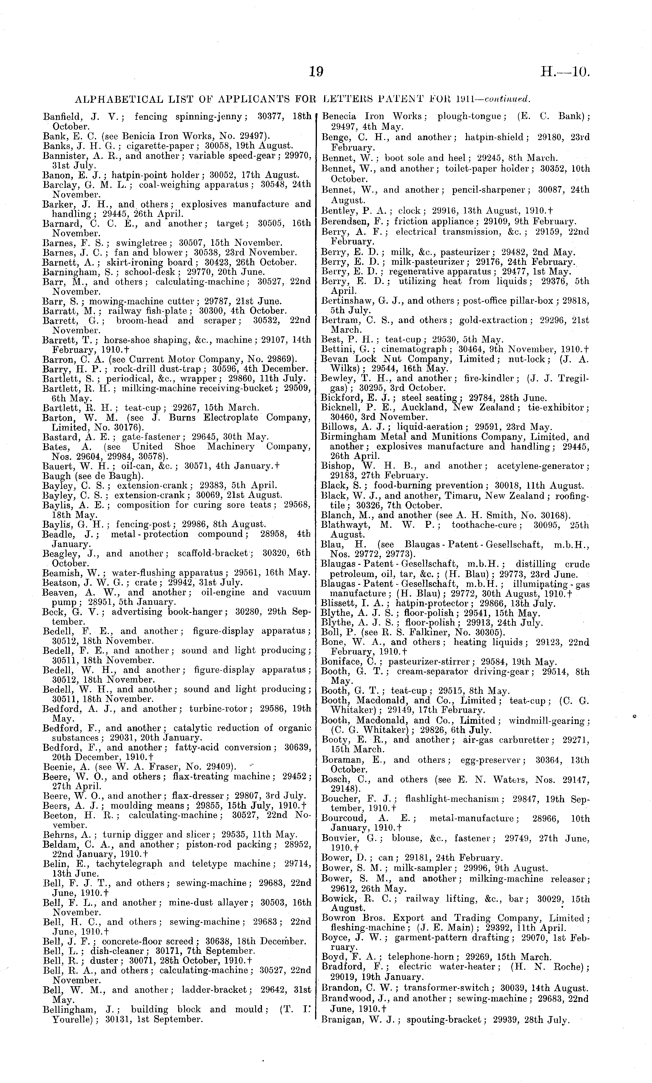 Benecia Iron Works; plough-tongue; (E. C. Bank) ; 29497, 4th May. Benge, C. H, and another; liatpm-shield; 29180, 23rd February. Bennet, W. ; boot sole and heel; 29245, Bth March. Bennet, W., and another; toilet-paper holder; 30352, 10th October. Bennet, W., and another ; pencil-sharpener ; 30087, 24th August. Bentley, P. A.; clock; 29916, 13th August, 1910.t Berendsen, F. ; friction appliance; 29109, 9th February. Berry, A. F. ; electrical transmission, &c. ; 29159, 22nd February. Berry, E. D. ; milk, &c, pasteurizer; 29482, 2nd May. Berry, E. D. ; milk-pasteurizer; 29176, 24th February. Berry, E. D. ; regenerative apparatus; 29477, Ist May. Berry, E. D. ; utilizing heat from liquids; 29376, sth April. Bertinshaw, G. J., and others ; post-office pillar-box ; 29818, sth July. Bertram, C. S., and others; gold-extraction; 29296, 21st March. Best, P. H. ; teat-cup; 29530, sth May. Bettini, G. ; cinematograph; 30464, 9th November, 1910.t Bevan Lock Nut Company, Limited; nut-lock; (J. A. Wilks); 29544, 16th May. Bewley, T. H., and another; fire-kindler ; (J. J. Tregilgas); 30295, 3rd October. Bickford, E. J. ; steel seating ; 29784, 28th June. Bicknell, P. E., Auckland, New Zealand; tie-exhibitor; 30460, 3rd November. Billows, A. J. ; liquid-aeration; 29591, 23rd May. Birmingham Metal and Munitions Company, Limited, and another; explosives manufacture and handling; 29445, 26th April. Bishop, W. H. 8., and another; acetylene-generator; 29183, 27th February. Black, S. ; food-burning prevention ; 30018, 1 lth August. Black, W. J., and another, Timaru, New Zealand; roofingtile ; 30326, 7th October. Blanch, M., and another (see A. H. Smith, No. 30168). Blathwayt, M. W. P.; toothache-cure; 30095, 25th August. Blau, H. (see Blaugas - Patent - Gesellschaft, m.b.H., Nos. 29772, 29773). Blaugas - Patent - Gesellschaft, m.b.H.; distilling crude petroleum, oil, tar, &c.; (H. Blau) ; 29773, 23rd June. Blaugas - Patent - Gesellschaft, m.b.H. ; illuminating - gas manufacture; (H. Blau); 29772, 30th August,' 1910.f Blissett, I. A. ; hatpin-protector; 29866, 13th July. Blythe, A. J. S. ; floor-polish; 29541, 15th May. Blythe, A. J. S. ; floor-polish; 29913, 24th July. 8011, P. (see R. S. Falkiner, No. 30305). Bone, W. A., and others; heating liquids; 29123, 22nd February, 1910. + Boniface, C. ; pasteurizer-stirrer; 29584, 19th May. Booth, G. T. ; cream-separator driving-gear; 29514, Bth May. Booth, G. T. ; teat-cup ; 29515, Bth May. Booth, Macdonald, and Co., Limited; teat-cup; (C. G. Whitaker) ; 29149, 17th February. Booth, Macdonald, and Co., Limited; windmill-gearing; (C. G. Whitaker); 29826, 6th July. Booty, E. R., and another; air-gas carburetter; 29271, 15th March. Boraman, E., and others; egg-preserver; 30364, 13th October. Bosch, C, and others (see E. N. Waters, Nos. 29147, 29148). Boucher, F. J. ; flashlight-mechanism ; 29847, 19th September, 1910. t Bourcoud, A. E. ; metal-manufacture; 28966, 10th January, 1910. + Bouvier, G. ; blouse, &c, fastener; 29749, 27th June, 1910.t Bower, D. ; can; 29181, 24th February. Bower, S. M. ; milk-sampler ; 29996, 9th August. Bower, S. M., and another; milking-machine releaser; 29612, 26th May. Bowick, R. C.; railway lifting, &c, bar; 30029, 15th August. Bowron Bros. Export and Trading Company, Limited ; fleshing-machine ; (J. E. Main); 29392, 11th April. Boyce, J. W. ; garment-pattern drafting; 29070, Ist February. Boyd, F. A. ; telephone-horn; 29269, 15th March. Bradford, F. ; electric water-heater; (H. N. Roche); 29019, 19th January. Brandon, C. W. ; transformer-switch ; 30039, 14th August. Brandwood, J., and another ; sewing-machine ; 29683, 22nd June, 1910. t Branigan, W. J. ; spouting-bracket; 29939, 28th July.