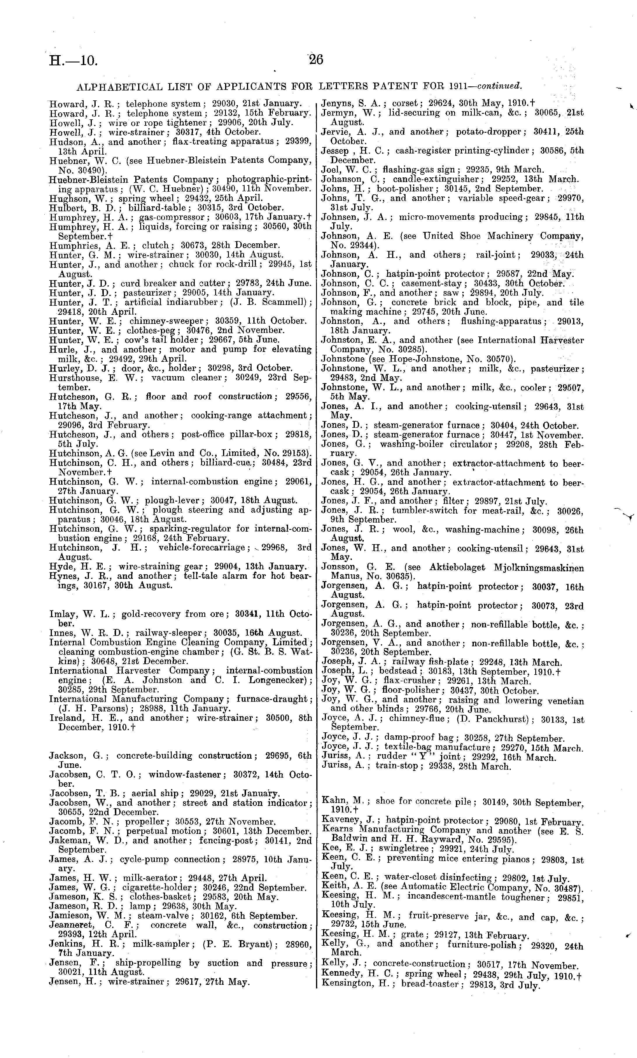 Howard, J. R. ; telephone system; 29030, 21st January. Howard, J. R. ; telephone system ; 29132, 15th February. Howell, J. ; wire or rope tightener; 29906, 20th July. Howell, J. ; wire-strainer; 30317, 4th October. Hudson, A., and another; flax-treating apparatus; 29399, 13th April. Huebner, W. C. (see Huebner-Bleistein Patents Company, No. 30490). Huebner-Bleistein Patents Company; photographic-print-ing apparatus ; (W. C. Huebner) ; 30490, 11th November. Hughson, W. ; spring wheel; 29432, 25th April. Hulbert, B. D.; billiard-table; 30315, 3rd October. Humphrey, H. A.; gas-compressor; 30603, 17th January.t Humphrey, H. A. ; liquids, forcing or raising; 30560, 30th September, t Humphries, A. E. ; clutch; 30673, 28th December. Hunter, G. M. ; wire-strainer; 30030, 14th August. Hunter, J., and another; chuck for rock-drill; 29945, Ist August. Hunter, J. D. ; curd breaker and cutter; 29783, 24th June. Hunter, J. D. ; pasteurizer; 29005, 14th January. Hunter, J. T. ; artificial indiarubber; (J. B. Scammell) ; 29418, 20th April. Hunter, W. E. ; chimney-sweeper; 30359, 11th October. Hunter, W. E. ; clothes-peg; 30476, 2nd November. Hunter, W. E. ; cow's tail holder; 29667, sth June. Hurle, J., and another; motor and pump for elevating milk, 4c ; 29492, 29th April. Hurley, D. J. ; door, 4c, holder; 30298, 3rd October. Hursthouse, E. W. ; vacuum cleaner; 30249, 23rd September. Hutcheson, G. R.; floor and roof construction; 29556, 17th May. Hutcheson, J., and another; cooking-range attachment; 29096, 3rd February. Hutcheson, J., and others; post-office pillar-box; 29818, sth July. Hutchinson, A. G. (see Levin and Co., Limited, No. 29153). Hutchinson, C. H, and others; billiard-cue; 30484, 23rd November. + Hutchinson, G. W. ; internal-combustion engine; 29061, 27th January. Hutchinson, G. W. ; plough-lever; 30047, 18th August. Hutchinson, G. W. ; plough steering and adjusting apparatus ; 30046, 18th August. Hutchinson, G. W. ; sparking-regulator for internal-com-bustion engine ; 29168, 24th February. Hutchinson, J. H. ; vehicle-forecarriage; 29968, 3rd August. Hyde, H. E. ; wire-straining gear; 29004, 13th January. Hynes, J. R., and another; tell-tale alarm for hot bearings, 30167, 30th August. Imlay, W. L. ; gold-recovery from ore; 30341, 11th October. Innes, W. R. D. ; railway-sleeper; 30035, 16th August. Internal Combustion Engine Cleaning Company, Limited; cleaning combustion-engine chamber; (G. St. B. S. Watkins) ; 30648, 21st December. International Harvester Company; internal-combustion engine; (E. A. Johnston and C. I. Longenecker); 30285, 29th September. International Manufacturing Company ; furnace-draught; (J. H. Parsons); 28988, 11th January. Ireland, H. E., and another; wire-strainer; 30500, Bth December, 1910.t Jackson, G. ; concrete-building construction; 29695, 6th June. Jacobsen, C. T. 0. ; window-fastener; 30372, 14th October. Jacobsen, T. B. ; aerial ship; 29029, 21st January. Jacobsen, W., and another; street and station indicator; 30655, 22nd December. Jacomb, F. N. ; propeller; 30553, 27th November. Jacomb, F. N. ; perpetual motion; 30601, 13th December. Jakeman, W. D., and another; fencing-post; 30141, 2nd September. James, A. J. ; cycle-pump connection ; 28975, 10th January. James, H. W. ; milk-aerator; 29448, 27th April. James, W. G. ; cigarette-holder; 30246, 22nd September. Jameson, K. S. ; clothes-basket; 29583, 20th May. Jameson, R. D. ; lamp ; 29638, 30th May. Jamieson, W. M. ; steam-valve; 30162, 6th September. Jeanneret, C. F. ; concrete wall, 4c, construction; 29393, 12th April. Jenkins, H. R. ; milk-sampler; (P. E. Bryant); 28960, 7th January. Jensen, F. ; ship-propelling by suction and pressure; 30021, 11th August. Jensen, H. ; wire-strainer; 29617, 27th May.