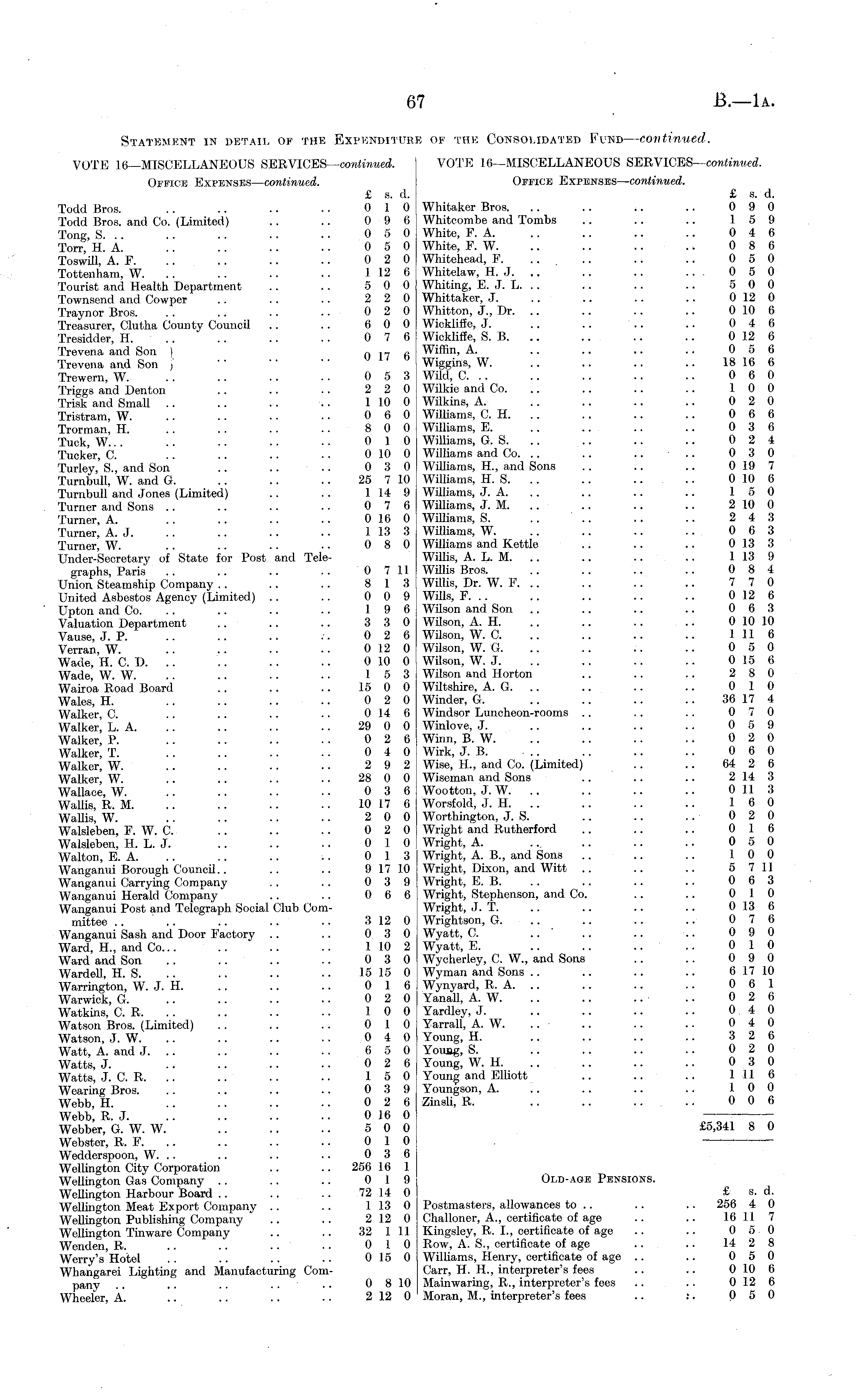Statement in detail of the Expenditure of the Consolidated Fund — continued. VOTE 16—MISCELLANEOUS SERVlCES— continued. VOTE 16—MISCELLANEOUS SERVlCES— continued. Office Expenses— continued. Office Expenses— continued. £ s. d. £ s. d. Todd Bros. .. .. .. .. 0 10 Whitaker Bros. .. .. .. .. 0 9 0 Todd Bros, and Co. (Limited) .. .. 0 9 6 Whitcombe and Tombs .. .. .. 15 9 Tons S .. .. ..050 White, F. A. .. .. .. .. 046 Torr HA. . .. .. .. 0 5 0 White, F. W. .. .. .. .. 0 8 6 Toswill A F .. .. .. 0 2 0 Whitehead, P. .. .. .. .. 0 5 0 Tottenham, W. .. .. .. .. 112 6 Whitelaw, H. J. .. .. .. ... 050 Tourist and Health Department .. .. 5 0 0 Whiting, E. J. L. .. .. .. .. 5 0 0 Townsend and Cowper .. .. .. 2 2 0 Whittaker, J. .. .. .. .. 012 0 Traynor Bros. .. .. .. .. 0 2 0 Whitton, J., Dr. .. .. .. .. 010 6 Treasurer, Clutha County Council .. .. 6 0 0 Wickliffe, J. .. .. .. .. 0 4 6 Tresidder, H. .. .. .. . . 0 7 6 Wickliffe, S. B. .. .. .. .. 012 6 Trevena and Son ) „ „ » Wiffin, A. .. .. .. .. 0 5 6 Trevena and Son j" v l< t> Wiggins> W 18 16 6 Trewern, W 0 5 3 Wild, C 0 6 0 Triggs and Denton .. .. .. 2 2 0 Wilkie and Co. .. .. .. 10 0 Trisk and Small .. 1 10 0 Wilkins, A. 0 2 0 Tristram, W. .. .. . • • ■ 0 6 0 Williams, C. H. .. .. .. .. 0 6 6 Trorman, H. .. .. .. .. 8 0 0 Williams, E. .. .. .. .. 0 3 6 Tuck, W... .. .. .. • • 0 10 Williams, G. S. .. .. .. 0 2 4 Tucker, C. .. .. .. .. 010 0 Williams and Co. .. .. .. .. 0 3 0 Turley,' S., and Son .. .. .. 03 0 Williams, H., and Sons .. .. .. 019 7 Turnbull, W. and G. .. .. .. 25 710 Williams, H. S. .. .. .. .. 010 6 Turnbull and Jones (Limited) .. .. 114 9 Williams, J. A. .. .. .. 15 0 Turner and Sons .. .. .. .. 0 7 6 Williams, J. M. .. .. .. .. 2 10 0 Turner, A. .. .. .. .. 016 0 Williams, S. .. .. .. .. 2 4 3 Turner, A. J. .. .. .. .. 113 3 Williams, W. .. .. .. .. 0 6 3 Turner, W. .. .. ■ • • • 0 8 0 Williams and Kettle .. .. .. 013 3 Under-Secretary of State for Post and Tele- Willis, A. L. M. .. .. .. .. 113 9 graphs, Paris .. .. .. .. 0 711 Willis Bros. .. .. .. .. 0 8 4 Union Steamship Company .. .. .. 8 13 Willis, Dr. W. F. .. .. .. .. 7 7 0 United Asbestos Agency (Limited) .. .. 0 0 9 Wills, F. .. .. .. .. .. 012 6 Upton and Co. .. .. .. .. 19 6 Wilson and Son .. .. .. .. 0 6 3 Valuation Department .. .. .. 3 3 0 Wilson, A. H. .. .. .. .. 010 10 Vause, J. P. .. .. .. .. 0 2 6 Wilson, W. C. .. .. .. .. 1 11 6 Verran, W. .. .. .. .. 012 0 Wilson, W. G. .. .. .. .. 0 5 0 Wade, H. C. D. .. .. .. .. 010 0 Wilson, W. J. .. .. .. .. 015 6 Wade, W. W. .. .. .. .. 15 3 Wilson and Horton .. .. .. 2 8 0 Wairoa Road Board .. .. .. 15 0 0 Wiltshire, A. G. .. .. .. .. 0 10 Wales, H. .. .. .. .. 0 2 0 Winder, G. .. .. .. .. 36 17 4 Walker, C. .. .. .. .. 014 6 Windsor Luncheon-rooms .. . . .. 0 7 0 Walker L. A. .. .. . . .. 29 0 0 Winlove, J. .. .. .. .. 0 5 9 Walker, P. .. .. .. .. 0 2 6 Winn, B. W. .. .. .. .. 0 2 0 Walker, T. .. .. .. .. 0 4 0 Wirk, J. B. .. .. .. .. 0 6 0 Walker, W. .. .. .. .. 2 9 2 Wise, H., and Co. (Limited) .. .. 64 2 6 W. .. .. .. .. 28 0 0 Wiseman and Sons .. .. .. 2 14 3 Wallace W. .. .. .. ■■ 0 3 6 Wootton, J. W. .. .. .. .. 011 3 Wallis, R. M. .. .. .. 10 17 6 Worsfold, J. H. .. .. .. .. 16 0 Wallis, W. .. .. .. .. 2 0 0 Worthington, J. S. .. .. .. 0 2 0 Walsleben, F. W. C. .. .. .. 0 2 0 Wright and Rutherford .. .. .. 0 16 Walsleben, H. L. J. .. .. .. 0 10 Wright, A. ... .. .. .. 0 5 0 Walton, E. A. .. .. .. .. 0 13 Wright, A. 8., and Sons .. .. .. 10 0 Wanganui Borough Council.. .. .. 9 17 10 Wright, Dixon, and Witt .. .. .. 5 7 11 Wanganui Carrying Company .. .. 0 3 9 Wright, E. B. .. .. .. .. 0 6 3 Wanganui Herald Company' .. .. 0 6 6 Wright, Stephenson, and Co. .. .. 0 10 Wanganui Post and Telegraph Social Club Com- Wright, J. T. .. .. .. .. 013 6 mittee .. .. .. .. .. 312 0 Wrightson, G. .. .. .. .. 0 7 6 Wanganui Sash and Door Factory .. .. 0 3 0 Wyatt, C. .. ' .. .. .. 0 9 0 Ward, H., and C 0... .. .. .. 110 2 Wyatt, E. .. .. .. .. 0 10 Ward and Son .. .. .. .. 0 3 0 Wycherley, C. W., and Sons .. .. 0 9 0 Wardell, H. S. .. .. .. . - 15 15 0 Wyman and Sons .. .. .. .. 617 10 Warrington, W. J. 11. .. .. .. 0 16 Wynyard, R. A. .. .. .. .. 0 6 1 Warwick, G 0 2 0 Yanall, A. W ■ .. 0 2 6 Watkins, C. R. .. .. .. .. 10 0 Yardley, J. .. .. .. .. 0 4 0 Watson Bros. (Limited) .. .. . . 0 10 Yarrall, A. W. .. .. .. .. 0 4 0 Watson, J. W. .. .. .. .. 0 4 0 Young, H. .. .. .. .. 3 2 6 Watt, A. and J. .. .. .. .. 6 5 0 Young, S. .. .. .. .. 0 2 0 Watts, J. .. .. .. .. 0 2 6 Young, W. H. .. .. .. .. 0 3 0 Watts, J. C. R. .. .. .. .. 15 0 Young and Elliott .. .. .. 111 6 Wearing Bros. .. .. .. .. 0 3 9 Youngson, A. .. .. .. .. 10 0 Webb, H. .. .. .. .. 0 2 6 Zinsli, R. .. .. ..... 006 Webb, R. J. .. .. .. •. 016 0 Webber, G. W. W. 5 0 0 £5,341 8 0 Webster, R. F. .. .. .. .. 0 10 Wedderspoon, W. .. . . .. .. 0 3 6 Wellington City Corporation .. .. 256 16 1 Wellington Gas Company .. .. .. 0 19 Old-age Pensions. Wellington Harbour Board ...... 72 14 0 £ s. d. Wellington Meat Export Company .. .. 113 0 Postmasters, allowances to .. .. .. 256 4 0 Wellington Publishing Company .. .. 212 0 Challoner, A., certificate of age .. .. 16 11 7 Wellington Tinware Company .. .. 32 111 Kingsley, R. 1., certificate of age .. .. 05 0 Wenden, R. .. .. .. •. 0 10 Row, A. S., certificate of age .. .. 14 2 8 Werry's'Hotel .. .. .. .. 015 0 Williams, Henry, certificate of age .. .. 05 0 Whangarei Lighting and Manufacturing Com- Carr, H. H., interpreter's fees .. .. 0 10 6 pany .. .. .. . . .. 0 810 Mainwaring, R., interpreter's fees .. .. 012 6 Wheeler, A. .. .. .. .. 212 0 Moran, M., interpreter's fees .. :. 0 5 0