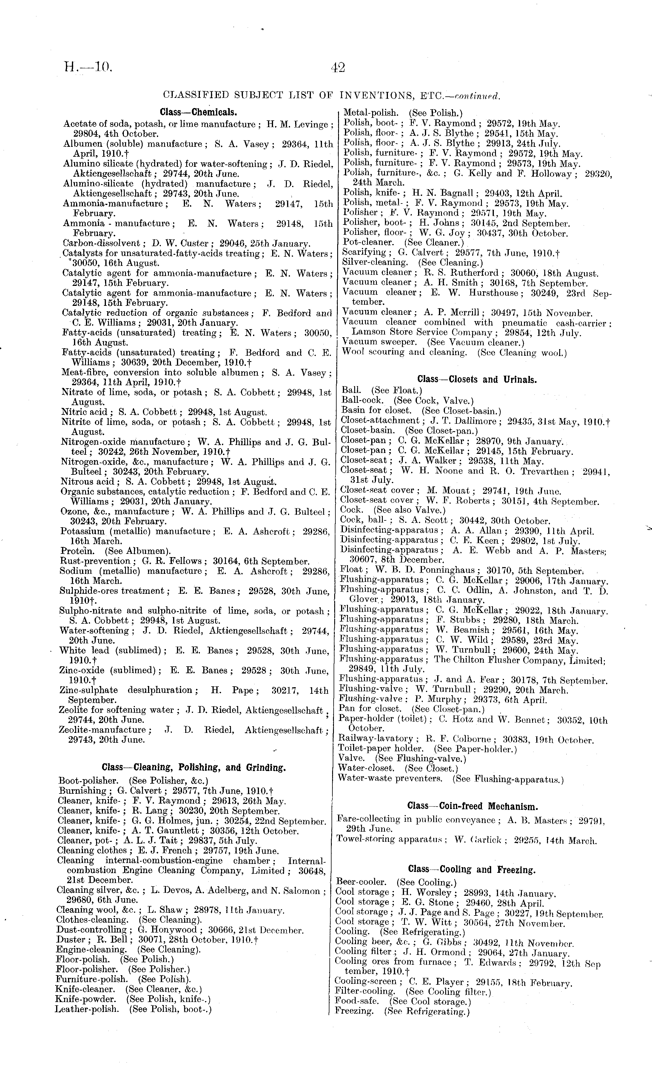 Class—Chemicals. Acetate of soda, potash, or lime manufacture ; H. M. Levinge ; 29804, 4th October. Albumen (soluble) manufacture; S. A. Vasey; 29364, llth April, 1910. + Alumino silicate (hydrated) for water-softening ; J. D. Riedel, Aktiengesellschaft; 29744, 20th June. Alumino-silicate (hydrated) manufacture; J. D. Riedel, Aktiengesellschaft; 29743, 20th June. Ammonia-manufacture; E. N. Waters; 291.47, 15th February. Ammonia - manufacture; E. N. Waters; 29148, J sth February. Carbon-dissolvent; D. W. Custer ; 29046, 25th January. Catalysts for unsaturated-fatty-acids treating; E. N. Waters; "30050, 16th August. Catalytic agent for ammonia-manufacture ; E. N. Waters ; 29147, 15th February. Catalytic agent for ammonia-manufacture ; E. N. Waters ; 29148, 15th February. Catalytic reduction of organic substances ; F. Bedford and C. E. Williams ; 29031, 20th January. Fatty-acids (unsaturated) treating; E. N. Waters; 30050, 16th August. Fatty-acids (unsaturated) treating; F. Bedford and C. E. Williams ; 30639, 20th December, 1910.+ Meat-fibre, conversion into soluble albumen ; S. A. Vasey ; 29364, llth April, 1910.+ Nitrate of lime, soda, or potash; S. A. Cobbett; 29948, Ist August. Nitric acid ; S. A. Cobbett; 29948, Ist August. Nitrite of lime, soda, or potash ;S. A. Cobbett; 29948, Ist August. Nitrogen-oxide manufacture ; W. A. Phillips and J. G. Bulteel; 30242, 26th November, 1910.+ Nitrogen-oxide, 4c, manufacture ; W. A. Phillips and J. G. Bultecl; 30243, 20th February. Nitrous acid ; S. A. Cobbett; 29948, Ist August. Organic substances, catalytic reduction ; F. Bedford and C. E. Williams ; 29031, 20th January. Ozone, 4c, manufacture ; W. A. Phillips and J. G. Bulteel; 30243, 20th February. Potassium (metallic) manufacture ; E. A. Ashcroft; 29286, 16th March. Protein. (See Albumen). Rust-prevention ; G. R. Fellows ; 30164, 6th September. Sodium (metallic) manufacture; E. A. Ashcroft; 29286, 16th March. Sulphide-ores treatment; E. E. Banes ; 29528, 30th June, 1910+. Sulpho-nitrate and sulpho-nitrite of lime, soda, or potash ; S. A. Cobbett; 29948, Ist August. Water-softening ;J. D. Riedel, Aktiengesellschaft; 29744, 20th June. White lead (sublimed) ; E. E. Banes ; 29528, 30th June, 1910.+ Zinc-oxide (sublimed) ; E. E. Banes ; 29528 ; 30th June, 1910.+ Zinc-sulphate desulphuration; H. Pape; 30217, Uth September. Zeolite for softening water ; J. D. Riedel, Aktiengesellschaft . 29744, 20th June. Zeolite-manufacture; J. D. Riedel, Aktiengesellschaft; 29743, 20th June. Class—Cleaning, Polishing, and Grinding. Boot-polisher. (See Polisher, 4c.) Burnishing; G.Calvert; 29577, 7th June, 1910. + Cleaner, knife-; F. V. Raymond ; 29613, 26th May. Cleaner, knife-; R. Lang ; 30230, 20th September." Cleaner, knife- ; G. G. Holmes, jun. ; 30254, 22nd September. Cleaner, knife-; A. T. Gauntlett; 30356, 12th October. Cleaner, pot- ; A. L. J. Tait; 29837, sth July. Cleaning clothes ; E. J. French ; 29757, 19th June. Cleaning internal-combustion-engine chamber; Internalcombustion Engine Cleaning Company, Limited ; 30648, 21st December. Cleaning silver, 4c. ; L. Devos, A. Adelberg, and N. Salomon • 29680, 6th June. Cleaning wool, 4c ;L. Shaw ; 28978, 11th January. Clothes-cleaning. (See Cleaning). Dust-controlling ; G. Honywood ; 30666,215t December. Duster ; R. Bell; 30071, 28th October, 1910.+ Engine-cleaning. (See Cleaning). Floor-polish. (See Polish.) Floor-polisher. (See Polisher.) Furniture-polish. (See Polish). Knife-cleaner. (See Cleaner, 4c.) Knife-powder. (See Polish, knife-.) Leather-polish. (See Polish, boot-.)