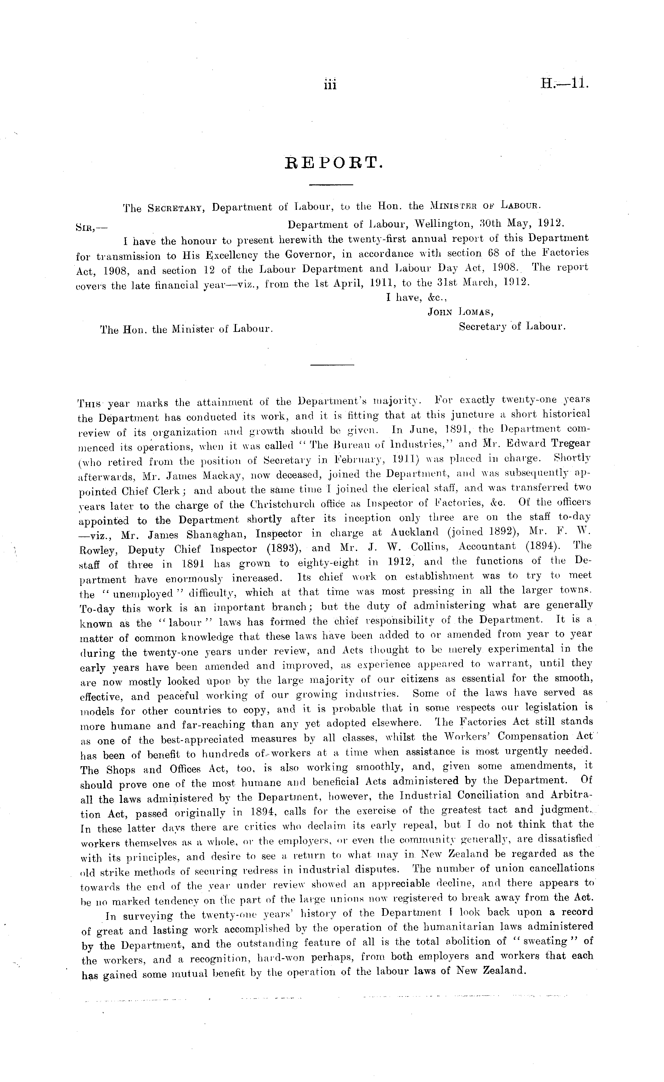 This year marks the attainment of the Department's majority. For exactly twenty-one years the Department has conducted its work, and it is fitting that at this juncture a short historical review of its organization and growth should be given. In June, 1891, the Department commenced its operations, when it was called "The Bureau of Industries," and Mr. Edward Tregear (who retired from the position of Secretary in February, 1911) was placed in charge. Shortly afterwards, Mr. James Maekay, now deceased, joined the Department, and was subsequently appointed Chief Clerk; and about the same time I joined the clerical staff, and was transferred two years later to the charge of the Christchurch office as Inspector of Factories, &c. Of the officers appointed to the Department shortly after its inception only three are on the staff to-day —viz., Mr. James Shanaghan, Inspector in charge at Auckland (joined 1892), Mr. F. W. Rowley, Deputy Chief Inspector (1893), and Mr. J. W. Collins, Accountant (1894). The staff of three in 1891 has grown to eighty-eight in 1912, and the functions of the Department have enormously increased. Its chief work on establishment was to try to meet the " unemployed " difficulty, which at that time was most pressing in all the larger towns. To-day this work is an important branch; but the duty of administering what are generally known as the "labour" laws has formed the chief responsibility of the Department. It is a matter of common knowledge that these laws have been added to or amended from year to year during the twenty-one years under review, and Acts thought to be merely experimental in the early years have been amended and improved, as experience appeared to warrant, until they are now mostly looked upon by the large majority of our citizens as essential for the smooth, effective, and peaceful working of our growing industries. Some of the laws have served as models for other countries to copy, and it is probable that in some respects our legislation is more humane and far-reaching than any yet adopted elsewhere. The Factories Act still stands as one of the best-appreciated measures by all classes, whilst the Workers' Compensation Act has been of benefit to hundreds of. workers at a time when assistance is most urgently needed. The Shops and Offices Act, too. is also working smoothly, and, given some amendments, it should prove one of the most humane and beneficial Acts administered by the Department. Of all the laws administered by the Department, however, the Industrial Conciliation and Arbitration Act, passed originally in 1894, calls for the exercise of the greatest tact and judgment. In these latter days there are critics who declaim its early repeal, but I do not think that the workers themselves as a whole, or the employers, or even the community generally, are dissatisfied with its principles, and desire to see a return to what may in New Zealand be regarded as the old strike methods of securing redress in industrial disputes. The number of union cancellations towards the end of the year under review showed an appreciable decline, and there appears to lie no marked tendency on the part of the large unions now registered to break away from the Act. In surveying the twenty-one years' history of the Department I look back upon a record of great and lasting work accomplished by the operation of the humanitarian laws administered by the Department, and the outstanding feature of all is the total abolition of " sweating " of the workers, and a recognition, hard-won perhaps, from both employers and workers that each has gained some mutual benefit by the operation of the labour laws of New Zealand.