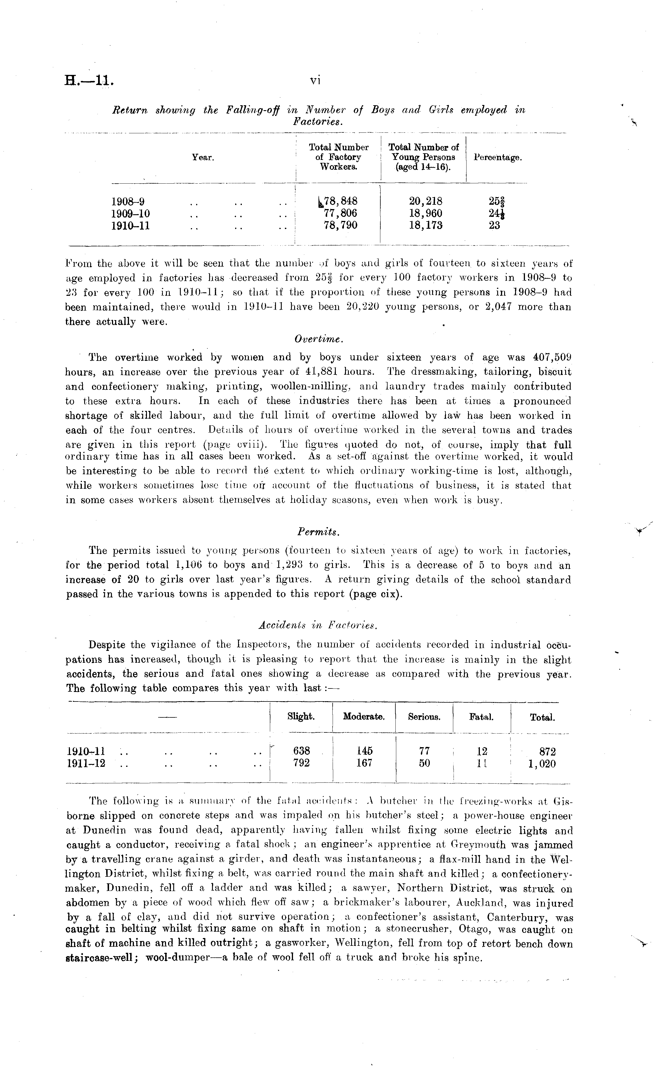 From the above it will be seen that the number of boys and girls of fourteen to sixteen years of age employed in factories lias decreased from 25| for everj- 1.00 factory workers in 1908-9 to 23 for every 100 in 1910-11; so that if the proportion of these young persons in 1908-9 hail been maintained, there would in 1910-11 have been 20,220 young persons, or 2,047 more than there actually were. Overtime. The overtime worked by women and by boys under sixteen years of age was 407,509 hours, an increase over the previous year of 41,881 hours. The dressmaking, tailoring, biscuit and confectionery making, printing, woollen-milling, and laundry trades mainly contributed to these extra hours. In each of these industries there has been at times a pronounced shortage of skilled labour, and the full limit of overtime allowed by law has been worked in each of the four centres. Details of hours of overtime worked in the several towns and trades are given in this report (page cviii). The figures looted do not, of course, imply that full ordinary time has in all cases been worked. As a set-off against the overtime worked, it would be interesting to be able to record the extent to which ordinary working-time is lost, although, while workers sometimes lose time on account of the fluctuations of business, it is stated that in some cases workers absent themselves at holiday seasons, even when work is busj-. Permits. The permits issued to young 1 persons (fourteen to sixteen years of age) to work in factories, for the period total 1,106 to boys and 1,293 to girls. This is a decrease of 5 to boys and an increase of 20 to girls over last year's figures. A return giving details of the school standard passed in the various towns is appended to this report (page cix). Accidents in Factories. Despite the vigilance of the Inspectors, the number of accidents recorded in industrial occupations has increased, though it is pleasing to report that the increase is mainly in the slight accidents, the serious and fatal ones showing a decrease as compared with the previous year. The following table compares this year with last: —