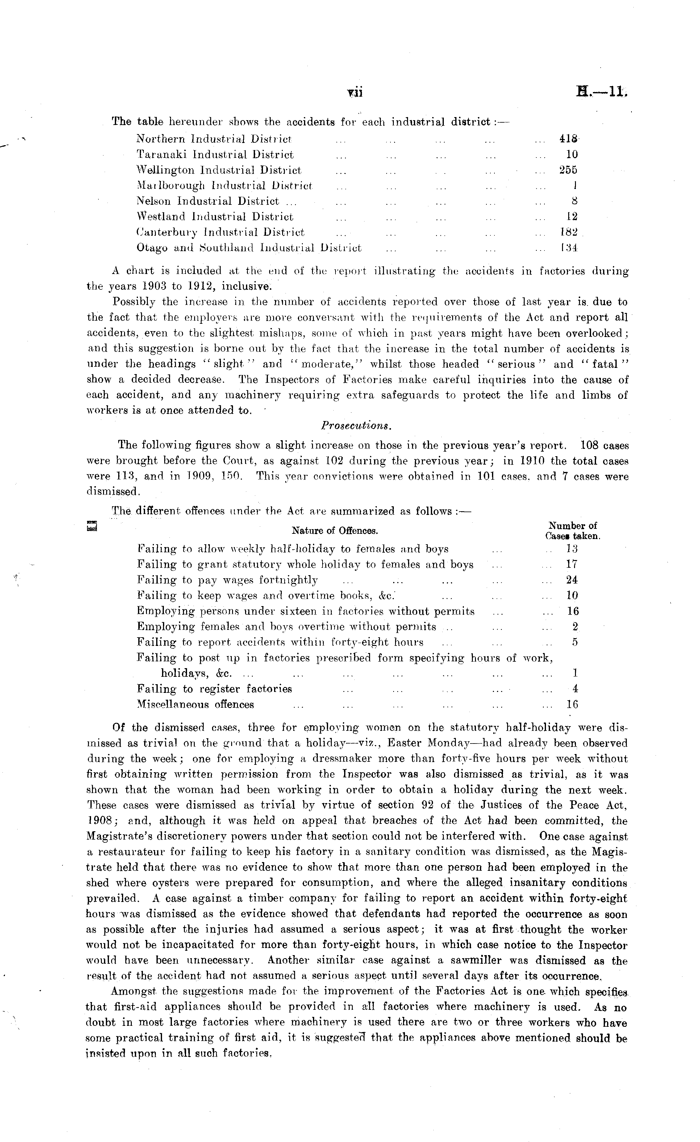 The table hereunder shows the accidents for each industrial district :— Northern Industrial District ... ... ... ... ... 418 Taranaki Industrial District ... ... ... ... ... 10 Wellington Industrial District ... ... ... ... 255 Marlborough Industrial District ... ... ... ... 1 Nelson Industrial District ... ... ... ... ... ... 8 Westland Industrial District ... ... ... ... ... 12 Canterbury Industrial District ... ... ... ... 182 Otago and Southland Industrial District ... ... ... ... 134 A chart is included at the end of the report illustrating the accidents in factories during the years 1903 to 1912, inclusive. Possibly the increase in the number of accidents reported over those of last year is. due to the fact that the employers are more conversant with the requirements of the Act and report all accidents, even to the slightest mishaps, some of which in past years might have been overlooked; and this suggestion is borne out by the fact that the increase in the total number of accidents is under the headings "slight" and "moderate," whilst those headed "serious" and "fatal" show a decided decrease. The Inspectors of Factories make careful inquiries into the cause of each accident, and any machinery requiring extra safeguards to protect the life and limbs of workers is at once attended to. Prosecutions. The following figures show a slight increase on those in the previous year's report. 108 cases were brought before the Court, as against 102 during the previous year; in 1910 the total cases were 113, and in 1909, 150. This year convictions were obtained in 101 cases, and 7 cases were dismissed. The different offences under the Act are summarized as follows :— 3 Nature of Offences. Number of Oasei taken. bailing to allow weekly half-holiday to females and boys ... 13 Failing to grant statutory whole holiday- to females and boys ... ... 17 Failing to pay wages fortnightly ... ... ... ... ... 24 Failing to keep wages and overtime books, k<s. ... ... ... 10 Employing persons under sixteen in factories without permits ... ... 16 Employing females and boys overtime without permits ... ... 2 Failing to report accidents within forty-eight hours ... ... .. 5 Failing to post up in factories prescribed form specifying hours of work, holidays, &c. ... ... ... ... ... ... ... 1 Failing to register factories ... ... ... ... 4 Miscellaneous offences ... ... ... ... ... ... 16 Of the dismissed cases, three for employing women on the statutor}- half-holiday were dismissed as trivial on the ground that a holiday—-viz., Easter Monday—had already been observed during the week; one for employing a dressmaker more than forty-five hours per week without first obtaining written permission from the Inspector was also dismissed as trivial, as it was shown that the woman had been working in order to obtain a holiday during the next week. These cases were dismissed as trivial by virtue of section 92 of the Justices of the Peace Act, 1908; and, although it was held on appeal that breaches of the Act had been committed, the Magistrate's discretionery powers under that section could not be interfered with. One case against a restaurateur for failing to keep his factory in a sanitary condition was dismissed, as the Magistrate held that there was no evidence to show that more than one person had been employed in the shed where oysters were prepared for consumption, and where the alleged insanitary conditions prevailed. A case against a timber company for failing to report an accident within forty-eight hours was dismissed as the evidence showed that defendants had reported the occurrence as soon as possible after the injuries had assumed a serious aspect; it was at first thought the worker would not be incapacitated for more than forty-eight hours, in which case notice to the Inspector would have been unnecessary. Another similar case against a sawmiller was dismissed as the result of the accident had not assumed a serious aspect until several days after its occurrence. Amongst the suggestions made for the improvement of the Factories Act is one which specifies that first-aid appliances should be provided in all factories where machinery is used. As no doubt in most large factories where machinery is used there are two or three workers who have some practical training of first aid, it is suggestecT that the appliances above mentioned should be insisted upon in all such factories.