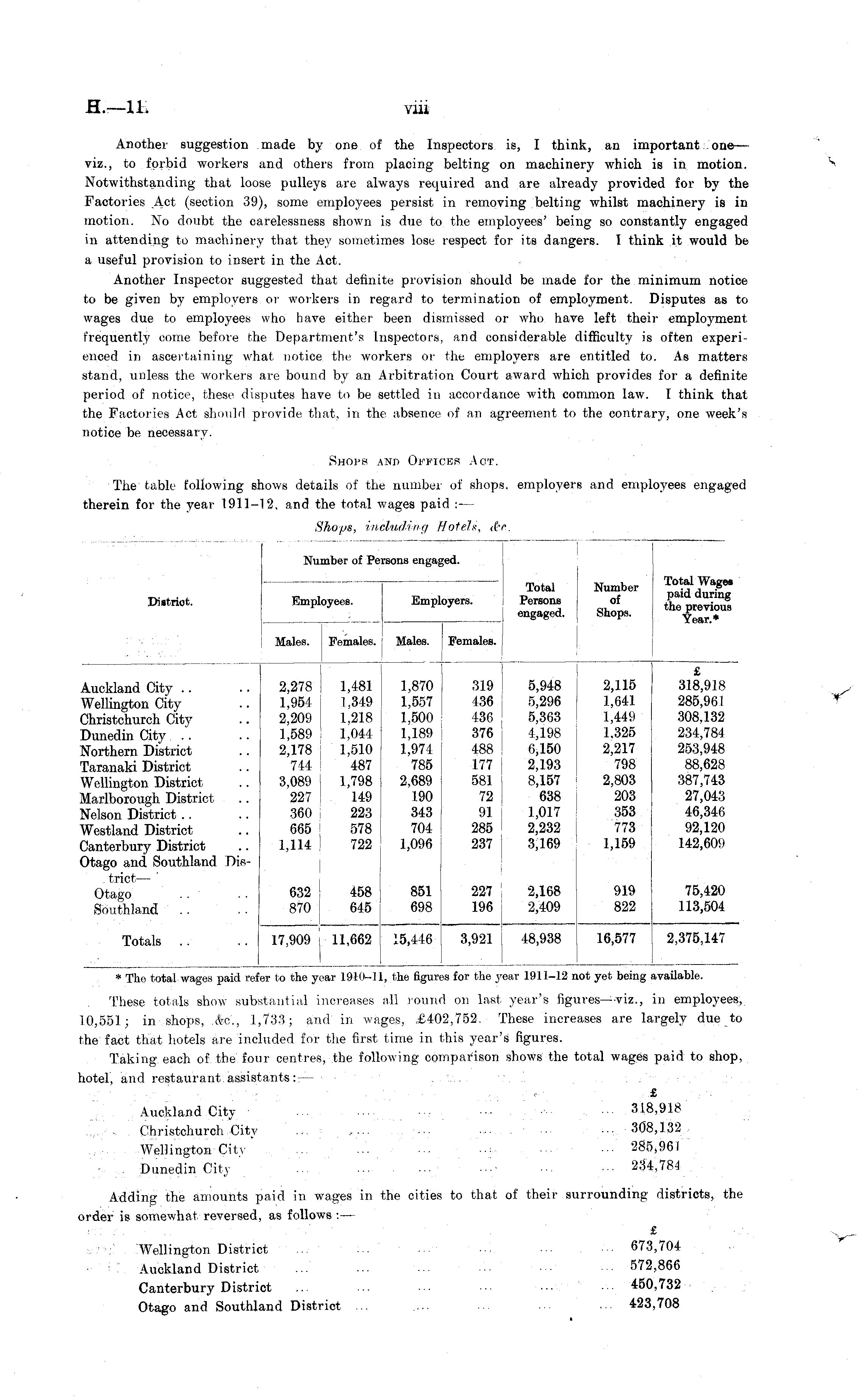 Another suggestion made by one of the Inspectors is, I think, an important . one — viz., to forbid workers and others from placing belting on machinery which is in motion. Notwithstanding that loose pulleys are always required and are already provided for by the Factories ,Act (section 39), some employees persist in removing belting whilst machinery is in motion. No doubt the carelessness shown is due to the employees' being so constantly engaged in attending to machinery that they sometimes lose respect for its dangers. I think it would be a useful provision to insert in the Act. Another Inspector suggested that definite provision should be made for the minimum notice to be given by employers or workers in regard to termination of employment. Disputes as to wages due to employees who have either been dismissed or who have left their employment frequently come before the Department's Inspectors, and considerable difficulty is often experienced in ascertaining what, notice the workers or the employers are entitled to. As matters stand, unless the workers are bound by an Arbitration Court award which provides for a definite period of notice, these disputes have to be settled in accordance with common law. I think that the Factories Act should provide that, in the absence of an agreement to the contrary, one week's notice be necessary. Shops and Offices Act. The table following shows details of the number of shops, employers and employees engaged therein for the year 1911-12, and the total wages paid : —