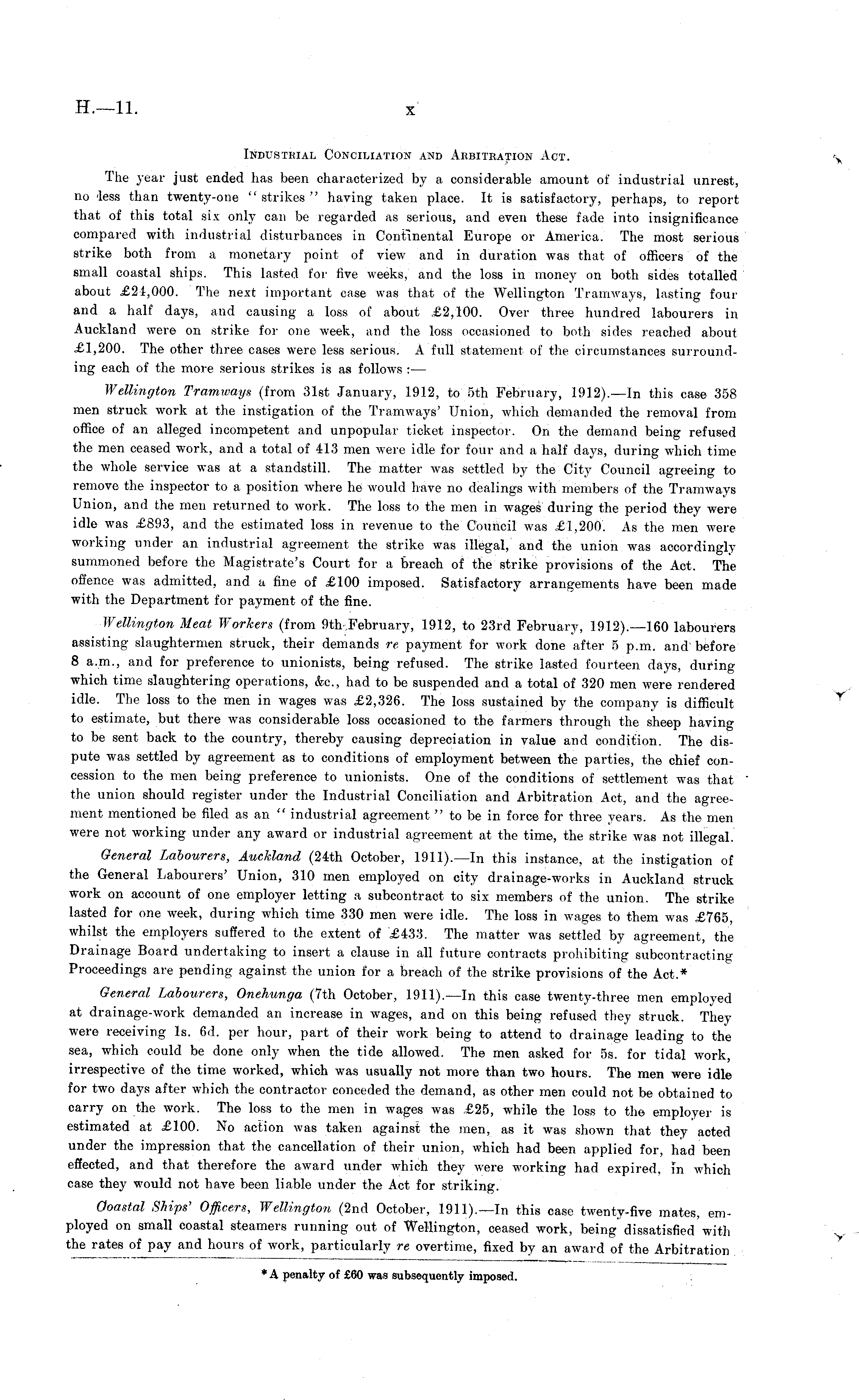 Industrial Conciliation and Arbitration Act. The year just ended has been characterized by a considerable amount of industrial unrest, no less than twenty-one "strikes" having taken place. It is satisfactory, perhaps, to report that of this total six only can be regarded as serious, and even these fade into insignificance compared with industrial disturbances in Continental Europe or America. The most serious strike both from a monetary point of view and in duration was that of officers of the small coastal ships. This lasted for five weeks, and the loss in money on both sides totalled about £24,000. The next important case was that of the Wellington Tramways, lasting four and a half days, and causing a loss of about £2,100. Over three hundred labourers in Auckland were on strike for one w-eek, and the loss occasioned to both sides reached about £1,200. The other three cases were less serious. A full statement of the circumstances surrounding each of the more serious strikes is as follows :— Wellington Tramwaxjs (from 31st January, 1912, to sth February, 1912). —In this case 358 men struck work at the instigation of the Tramways' Union, which demanded the removal from office of an alleged incompetent and unpopular ticket inspector. On the demand being refused the men ceased work, and a total of 413 men were idle for four and a half days, during which time the whole service was at a standstill. The matter was settled by the City Council agreeing to remove the inspector to a position where he would have no dealings with members of the Tramways Union, and the men returned to work. The loss to the men in wages during the period they were idle was £893, and the estimated loss in revenue to the Council was £1,200. As the men were working under an industrial agreement the strike was illegal, and the union was accordingly summoned before the Magistrate's Court for a breach of the strike provisions of the Act. The offence was admitted, and a fine of £100 imposed. Satisfactory arrangements have been made with the Department for payment of the fine. Wellington Meat Workers (from 9th February, 1912, to 23rd February, 1912).—160 labourers assisting slaughtermen struck, their demands re payment for work done after 5 p.m. and before 8 a.m., and for preference to unionists, being refused. The strike lasted fourteen days, during which time slaughtering operations, &c, had to be suspended and a total of 320 men were rendered idle. The loss to the men in wages was £2,326. The loss sustained by the company is difficult to estimate, but there was considerable loss occasioned to the farmers through the sheep having to be sent back to the country, thereby causing depreciation in value and condition. The dispute was settled by agreement as to conditions of employment between the parties, the chief concession to the men being preference to unionists. One of the conditions of settlement was that the union should register under the Industrial Conciliation and Arbitration Act, and the agreement mentioned be filed as an " industrial agreement " to be in force for three years. As the men were not working under any award or industrial agreement at the time, the strike was not illegal. General Labourers, Auckland (24th October, 1911).—In this instance, at the instigation of the General Labourers' Union, 310 men employed on city drainage-works in Auckland struck work on account of one employer letting a subcontract to six members of the union. The strike lasted for one week, during which time 330 men were idle. The loss in wages to them was £765, whilst the employers suffered to the extent of £433. The matter was settled by agreement, the Drainage Board undertaking to insert a clause in all future contracts prohibiting subcontracting Proceedings are pending against the union for a breach of the strike provisions of the Act.* General Labourers, Onehunga (7th October, 1911). —In this case twenty-three men employed at drainage-work demanded an increase in wages, and on this being refused they struck. They were receiving Is. 6d. per hour, part of their work being to attend to drainage leading to the sea, which could be done only when the tide allowed. The men asked for ss. for tidal work, irrespective of the time worked, which was usually not more than two hours. The men were idle for two days after which the contractor conceded the demand, as other men could not be obtained to carry on the work. The loss to the men in wages was £25, while the loss to the employer is estimated at £100. No action was taken against the men, as it was shown that they acted under the impression that the cancellation of their union, which had been applied for, had been effected, and that therefore the award under which they were working had expired, in which case they would not have been liable under the Act for striking. Coastal Ships' Officers, Wellington (2nd October, 1911).—In this case twenty-five mates, employed on small coastal steamers running out of Wellington, ceased work, being dissatisfied with the rates of pay and hours of work, particularly re overtime, fixed by an award of the Arbitration
