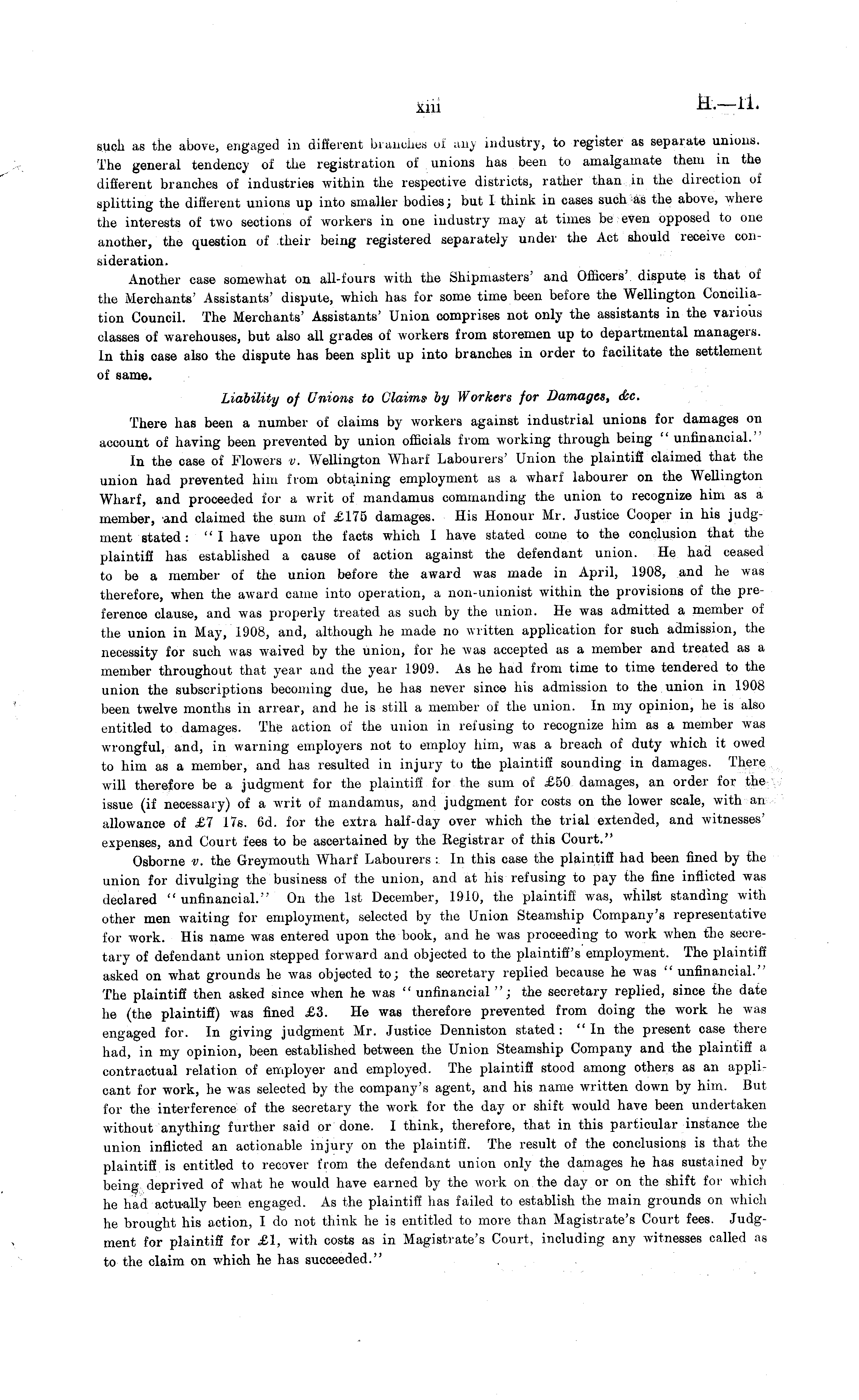 such as the above, engaged in different branches of any industry, to register as separate unions. The general tendency of the registration of unions has been to amalgamate them in the different branches of industries within the respective districts, rather than in the direction of splitting the different unions up into smaller bodies; but I think in cases such as the above, where the interests of two sections of workers in one industry may at times be even opposed to one another, the question of their being registered separately under the Act should receive consideration. Another case somewhat on all-fours with the Shipmasters' and Officers' dispute is that of the Merchants' Assistants' dispute, which has for some time been before the Wellington Conciliation Council. The Merchants' Assistants' Union comprises not only the assistants in the various classes of warehouses, but also all grades of workers from storemen up to departmental managers. In this case also the dispute has been split up into branches in order to facilitate the settlement of same. Liability of Unions to Claims by Workers for Damages, &c. There has been a number of claims by workers against industrial unions for damages on account of having been prevented by union officials from working through being " unfinancial." In the case of Flowers v. Wellington Wharf Labourers' Union the plaintiff claimed that the union had prevented him from obtaining employment as a wharf labourer on the Wellington Wharf, and proceeded for a writ of mandamus commanding the union to recognize him as a member, and claimed the sum of £175 damages. His Honour Mr. Justice Cooper in his judgment stated: " I have upon the facts which I have stated come to the conclusion that the plaintiff has established a cause of action against the defendant union. He had ceased to be a member of the union before the award was made in April, 1908, and he was therefore, when the award came into operation, a non-unionist within the provisions of the preference clause, and was properly treated as such by the union. He was admitted a member of the union in May, 1908, and, although he made no written application for such admission, the necessity for such was waived by the union, for he was accepted as a member and treated as a member throughout that year and the year 1909. As he had from time to time tendered to the union the subscriptions becoming due, he has never since his admission to the union in 1908 been twelve months in arrear, and he is still a member of the union. In my opinion, he is also entitled to damages. The action of the union in refusing to recognize him as a member was wrongful, and, in warning employers not to employ him, was a breach of duty which it owed to him as a member, and has resulted in injury to the plaintiff sounding in damages. There will therefore be a judgment for the plaintiff for the sum of £50 damages, an order for the issue (if necessary) of a writ of mandamus, and judgment for costs on the lower scale, with an allowance of £7 17s. 6d. for the extra half-day over which the trial extended, and witnesses' expenses, and Court fees to be ascertained by the Registrar of this Court." Osborne v. the Greymouth Wharf Labourers : In this case the plaintiff had been fined by the union for divulging the business of the union, and at his refusing to pay the fine inflicted was declared "unfinancial." On the Ist December, 1910, the plaintiff was, whilst standing with other men waiting for employment, selected by the Union Steamship Company's representative for work. His name was entered upon the book, and he was proceeding to work when the secretary of defendant union stepped forward and objected to the plaintiff's employment. The plaintiff asked on what grounds he was objected to; the secretary replied because he was "unfinancial." The plaintiff then asked since when he was " unfinancial "; the secretary replied, since the date he (the plaintiff) was fined £3. He was therefore prevented from doing the work he was engaged for. In giving judgment Mr. Justice Denniston stated: "In the present case there had, in my opinion, been established between the Union Steamship Company and the plaintiff a contractual relation of employer and employed. The plaintiff stood among others as an applicant for work, he was selected by the company's agent, and his name written down by him. But for the interference of the secretary the work for the day or shift would have been undertaken without anything further said or done. I think, therefore, that in this particular instance the union inflicted an actionable injury on the plaintiff. The result of the conclusions is that the plaintiff is entitled to recover from the defendant union only the damages he has sustained by being deprived of what he would have earned by the work on the day or on the shift for which he had actually been engaged. As the plaintiff has failed to establish the main grounds on which he brought his action, Ido not think he is entitled to more than Magistrate's Court fees. Judgment for plaintiff for £1, with costs as in Magistrate's Court, including any witnesses called as to the claim on which he has succeeded."