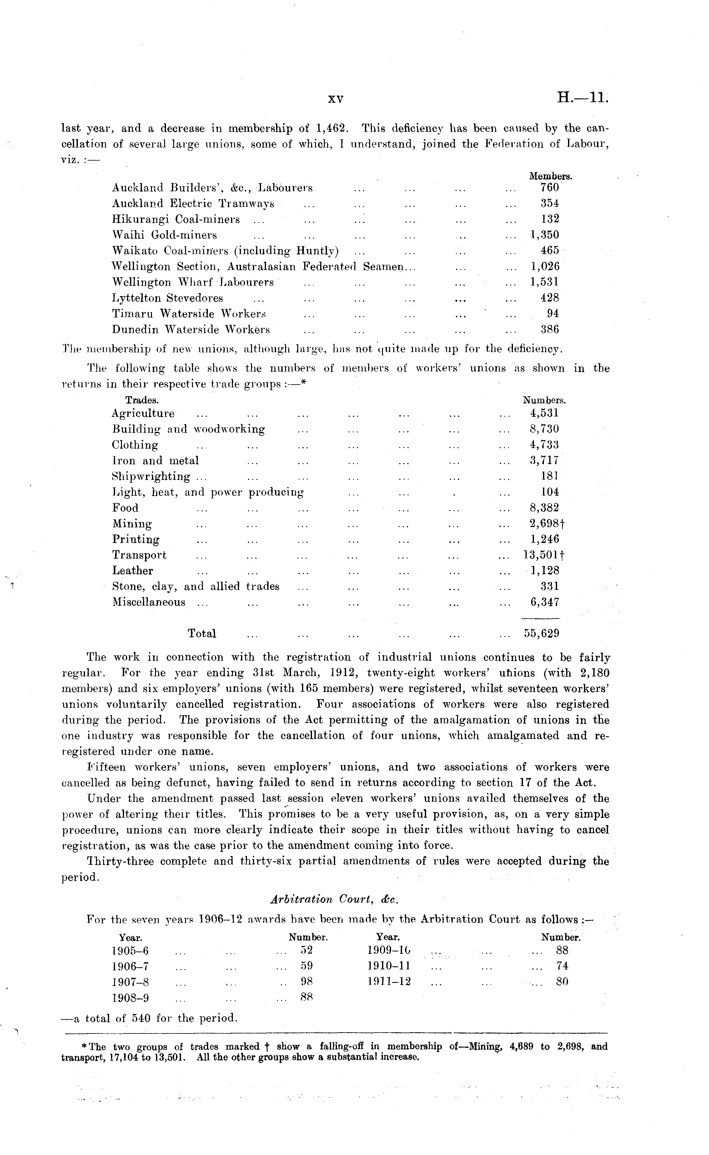 last 3-ear, and a decrease in membership of 1,462. This deficiency has been caused by the cancellation of several large unions, some of which, I understand, joined the Federation of Labour, viz. :— Members. Auckland Builders', &c, Labourers ... ... ... ... 760 Auckland Electric Tramways ... ... ... ... ... 354 Hikurangi Coal-miners ... ... ... ... ... ... 132 Waihi Gold-miners ... ... ... ... ... ... 1,350 Waikato Coal-miners (including Huntly) ... ... ... ... 465 Wellington Section, Australasian Federated Seamen... ... ... 1,026 Wellington Wharf Labourers ... ... ... ... ... 1,531 Lyttelton Stevedores ... ... ... ... ... ... 428 Timaru Waterside Workers ... ... ... ... ... 94 Dunedin Waterside Workers ... ... ... ... ... 386 The membership of new unions, although large, has not quite made up for the deficiency. The following table shows the numbers of members of workers' unions as shown in the returns in their respective trade groups : —* Trades. Numbers. Agriculture ... ... ... ... ... ... ... 4,531 Building and woodworking ... ... ... ... ... 8,730 Clothing ... ... ... ... ... ... ... 4,733 Iron and metal ... ... ... ... ... ... 3,717 Shipwrighting ... ... ... ... ... ... ... 181 Light, heat, and power producing ... ... . ... 104 Food ... ... ... ... ... ... ... 8,382 Mining ... ... ... ... ... ... ... 2,698+ Printing ... ... ... ... ... ... ... 1,246 Transport ... ... ... ... ... ... ... 13,501 + Leather ... ... ... ... ... ... ... 1,128 Stone, clay, and allied trades ... ... ... ... ... 331 Miscellaneous ... ... ... ... ... ... ... 6,347 Total ... ... ... ... ... ... 55,629 The work in connection with the registration of industrial unions continues to be fairly regular. For the year ending 31st March, 1912, twenty-eight workers' unions (with 2,180 members) and six employers' unions (with 165 members) were registered, whilst seventeen workers' unions voluntarily cancelled registration. Four associations of workers were also registered during the period. The provisions of the Act permitting of the amalgamation of unions in the one industry was responsible for the cancellation of four unions, which amalgamated and reregistered under one name. Fifteen workers' unions, seven employers' unions, and two associations of workers were cancelled as being defunct, having failed to send in returns according to section 17 of the Act. Under the amendment passed last session eleven workers' unions availed themselves of the power of altering their titles. This promises to be a very useful provision, as, on a very simple procedure, unions can more clearly indicate their scope in their titles without having to cancel registration, as was the case prior to the amendment coming into force. Thirty-three complete and thirty-six partial amendments of rules were accepted during the period. Arbitration Court, dec. For the seven years 1906-12 awards have been made by the Arbitration Court as follows :— Year. Number. Year. Number. 1905-6 ... ... ... 52 1909-10 ... ... ... 88 1906-7 ... ... ... 59 1910-11 .".'.' ... ... 74 1907-8 ... ... .. 98 1911-12 ... ... ... 80 1908-9 ... ... ... 88 —a total of 540 for the period.