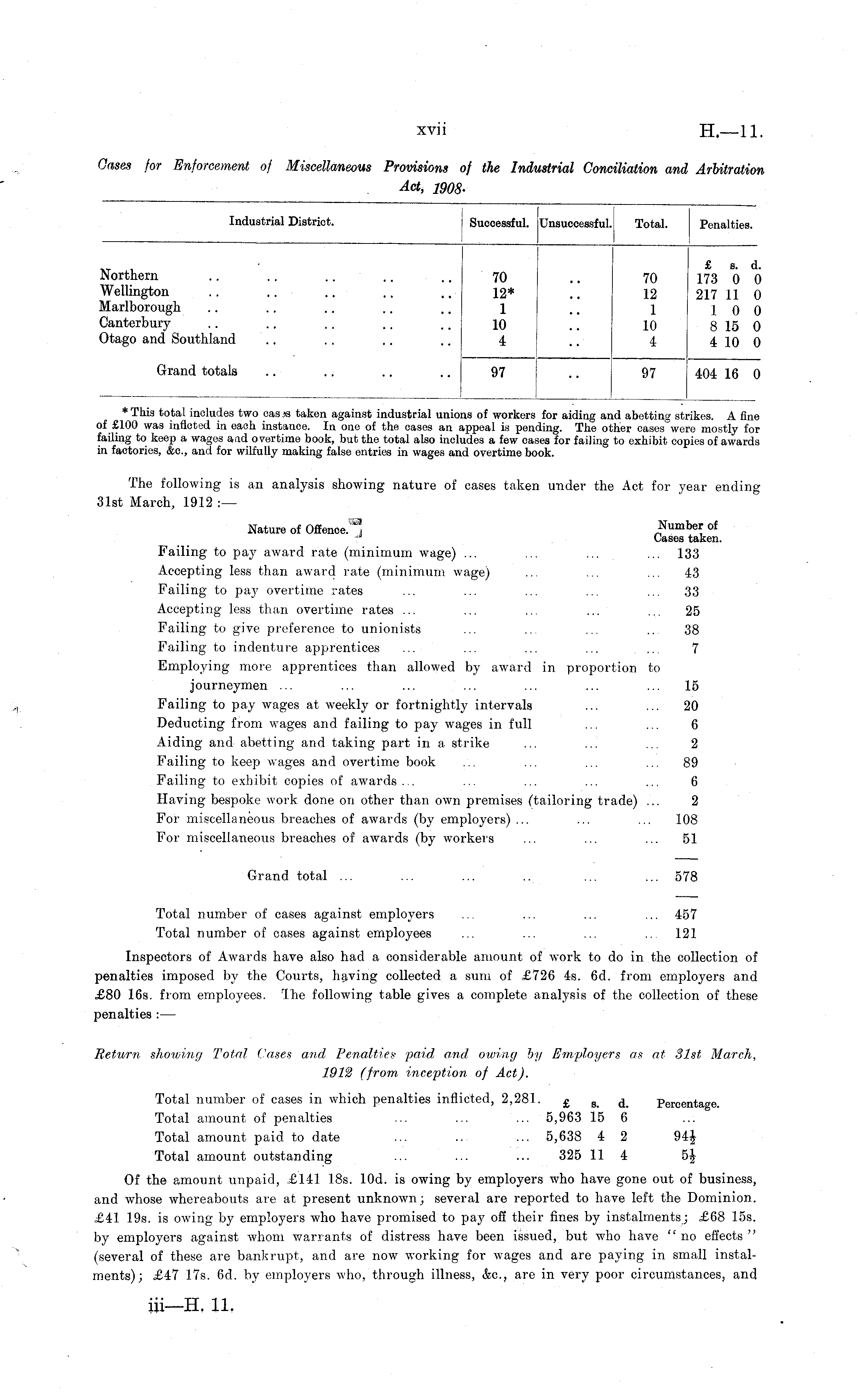 The following is an analysis showing nature of cases taken under the Act for year ending 31st March, 1912 :— Nature of Offence. Number of Cases taken. Failing to pay award rate (minimum wage) ... ... ... ... 133 Accepting less than award rate (minimum wage) ... ... ... 43 Failing to pay overtime rates ... ... ... ... ... 33 Accepting less than overtime rates ... ... ... ... ... 25 Failing to give preference to unionists ... ... ... ... 38 Failing to indenture apprentices ... ... ... ... ... 7 Employing more apprentices than allowed by award in proportion to journeymen ... ... ... ... ... ... ... 15 Failing to pay wages at weekly or fortnightly intervals ... ... 20 Deducting from wages and failing to pay wages in full ... ... 6 Aiding and abetting and taking part in a strike ... ... ... 2 Failing to keep wages and overtime book ... ... ... ... 89 Failing to exhibit copies of awards... ... ... ... ... 6 Having bespoke work done on other than own premises (tailoring trade) ... 2 For miscellaneous breaches of awards (by employers) ... ... ... 108 For miscellaneous breaches of awards (by workers ... ... ... 51 Grand total ... ... ... .. ... ... 578 Total number of cases against employers ... ... ... ... 457 Total number of cases against employees ... ... ... ... 121 Inspectors of Awards have also had a considerable amount of work to do in the collection of penalties imposed by the Courts, having collected a sum of £726 4s. 6d. from employers and £80 16s. from employees. The following table gives a complete analysis of the collection of these penalties :— Return showing Total Cases and Penalties paid and owing by Employers as at 31st March, 1912 (from inception of Act). Total number of cases in which penalties inflicted, 2,281. £ s Percentage. Total amount of penalties ... ... ... 5,963 15 6 Total amount paid to date ... ... ... 5,638 4 2 94| Total amount outstanding ... ... ... 325 11 4 5| Of the amount unpaid, £141 18s. lOd. is owing by employers who have gone out of business, and whose whereabouts are at present unknown; several are reported to have left the Dominion. £41 19s. is owing by employers who have promised to pay off their fines by instalments; £68 15s. by employers against whom warrants of distress have been issued, but who have " no effects " (several of these are bankrupt, and are now working for wages and are paying in small instalments); £47 17s. 6d. by employers who, through illness, ifcc, are in very poor circumstances, and