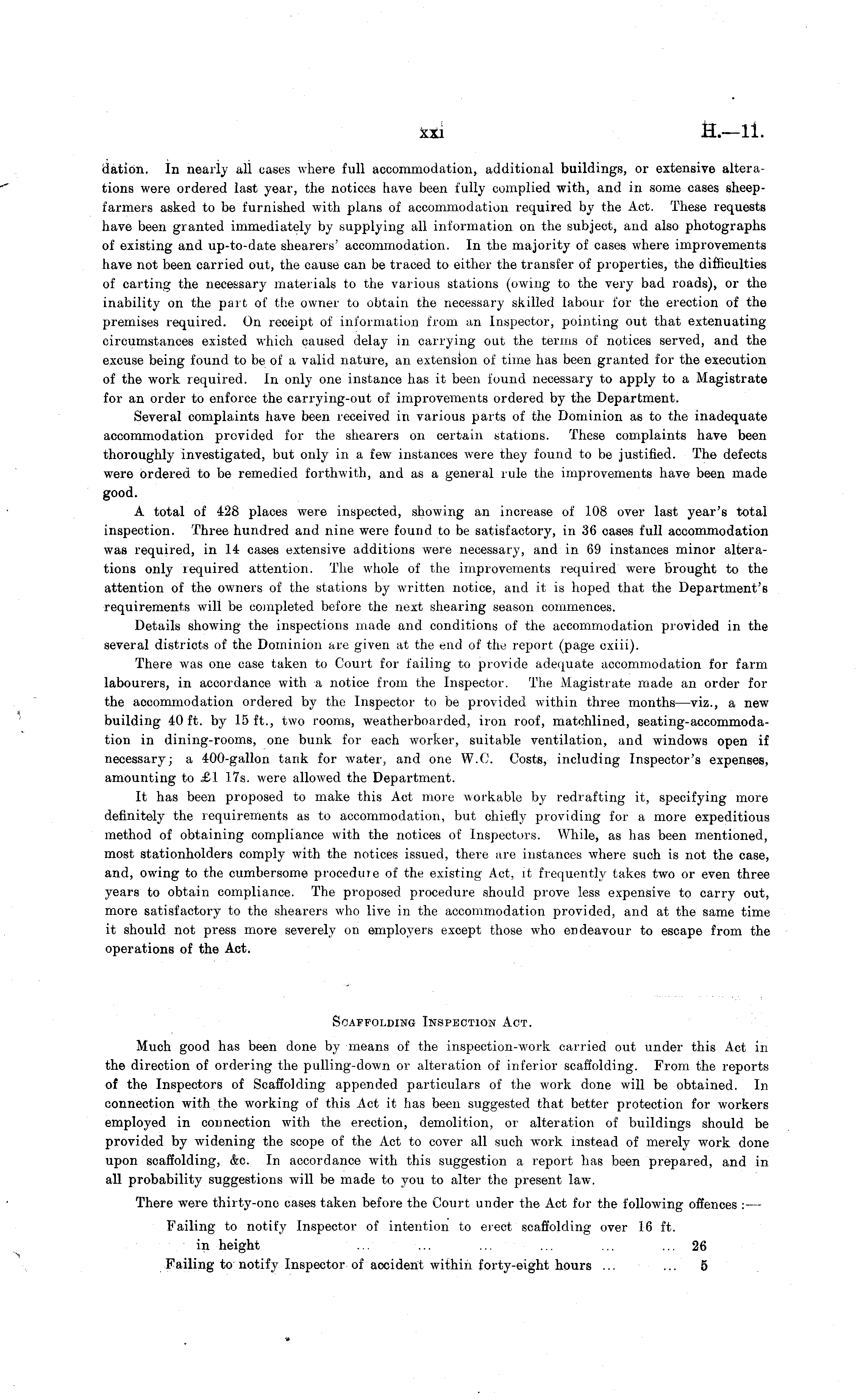 datidn. In nearly all cases where full accommodation, additional buildings, or extensive alterations were ordered last year, the notices have been fully complied with, and in some cases sheepfarmers asked to be furnished with plans of accommodation required by the Act. These requests have been granted immediately by supplying all information on the subject, and also photographs of existing and up-to-date shearers' accommodation. In the majority of cases where improvements have not been carried out, the cause can be traced to either the transfer of properties, the difficulties of carting the necessary materials to the various stations (owing to the very bad roads), or the inability on the part of the owner to obtain the necessary skilled labour for the erection of the premises required. On receipt of information from an Inspector, pointing out that extenuating circumstances existed which caused delay in carrying out the terms of notices served, and the excuse being found to be of a valid nature, an extension of time has been granted for the execution of the work required. In only one instance has it been found necessary to apply to a Magistrate for an order to enforce the carrying-out of improvements ordered by the Department. Several complaints have been received in various parts of the Dominion as to the inadequate accommodation provided for the shearers on certain stations. These complaints have been thoroughly investigated, but only in a few instances were they found to be justified. The defects were ordered to be remedied forthwith, and as a general rule the improvements have been made good. A total of 428 places were inspected, showing an increase of 108 over last year's total inspection. Three hundred and nine were found to be satisfactory, in 36 cases full accommodation was required, in 14 cases extensive additions were necessary, and in 69 instances minor alterations only required attention. The whole of the improvements required were brought to the attention of the owners of the stations by written notice, and it is hoped that the Department's requirements will be completed before the next shearing season commences. Details showing the inspections made and conditions of the accommodation provided in the several districts of the Dominion are given at the end of the report (page cxiii). There was one case taken to Court for failing to provide adequate accommodation for farm labourers, in accordance with a notice from the Inspector. The Magistrate made an order for the accommodation ordered by the Inspector to be provided within three months —viz., a new building 40 ft. by 15 ft., two rooms, weatherboarded, iron roof, matohlined, seating-accommoda-tion in dining-rooms, one bunk for each worker, suitable ventilation, and windows open if necessary; a 400-gallon tank for water, and one W.C. Costs, including Inspector's expenses, amounting to £1 17s. were allowed the Department. It has been proposed to make this Act more workable by redrafting it, specifying more definitely the requirements as to accommodation, but chiefly providing for a more expeditious method of obtaining compliance with the notices of Inspectors. While, as has been mentioned, most stationholders comply with the notices issued, there are instances where such is not the case, and, owing to the cumbersome procedure of the existing Act, it frequently takes two or even three years to obtain compliance. The proposed procedure should prove less expensive to carry out, more satisfactory to the shearers who live in the accommodation provided, and at the same time it should not press more severely on employers except those who endeavour to escape from the operations of the Act. Scaffolding Inspection Act. Much good has been done by means of the inspection-work carried out under this Act in the direction of ordering the pulling-down or alteration of inferior scaffolding. From the reports of the Inspectors of Scaffolding appended particulars of the work done will be obtained. In connection with the working of this Act it has been suggested that better protection for workers employed in connection with the erection, demolition, or alteration of buildings should be provided by widening the scope of the Act to cover all such work instead of merely work done upon scaffolding, 6Vc. In accordance with this suggestion a report has been prepared, and in all probability suggestions will be made to you to alter the present law. There were thirty-one cases taken before the Court under the Act for the following offences :— Failing to notify Inspector of intention to erect scaffolding over 16 ft. in height ... ... ... ... ... 26 Failing to notify Inspector of accident within forty-eight hours ... ... 5