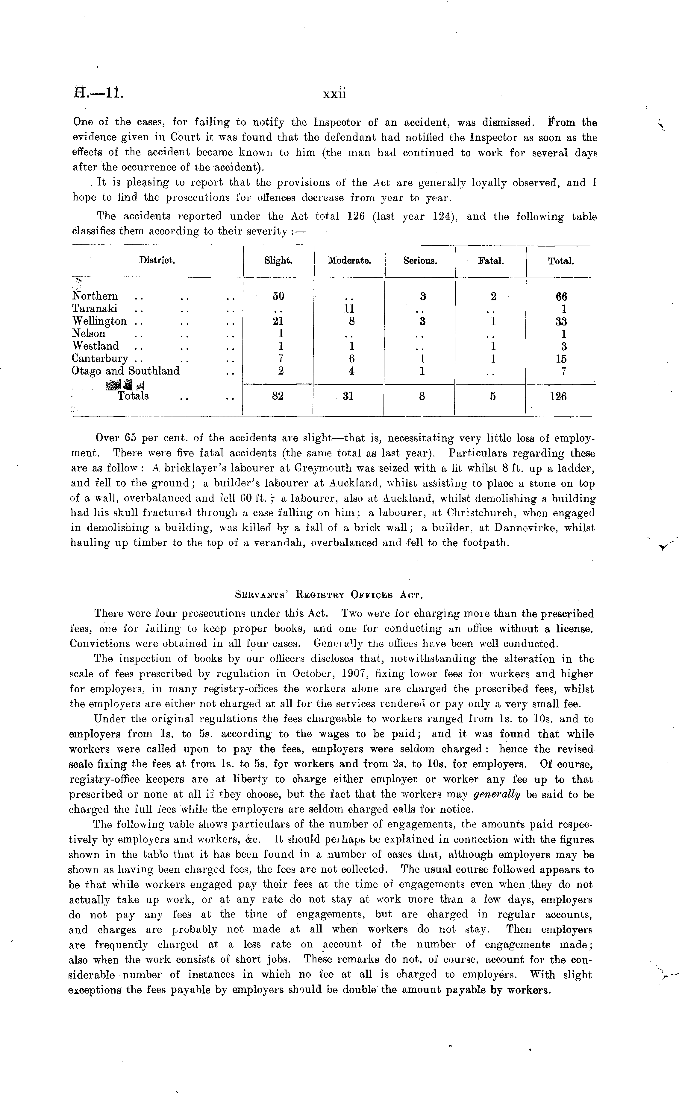 Over 65 per cent, of the accidents are slight —that is, necessitating very little loss of employment. There were five fatal accidents (the same total as last year). Particulars regarding these are as follow : A bricklayer's labourer at Greymouth was seized with a fit whilst 8 ft. up a ladder, and fell to the ground; a builder's labourer at Auckland, whilst assisting to place a stone on top of a wall, overbalanced and fell 60 ft. ; a labourer, also at Auckland, whilst demolishing a building had his skull fractured through a case falling on him; a labourer, at Ohristchurch, when engaged in demolishing a building, was killed by a fall of a brick wall; a builder, at Dannevirke, whilst hauling up timber to the top of a verandah, overbalanced and fell to the footpath. Servants' Registry Offices Act. There were four prosecutions under this Act. Two were for charging more than the prescribed fees, one for failing to keep proper books, and one for conducting an office without a license. Convictions were obtained in all four cases. Generally the offices have been well conducted. The inspection of books by our officers discloses that, notwithstanding the alteration in the scale of fees prescribed by regulation in October, 1907, fixing lower fees for workers and higher for employers, in many registry-offices the workers alone are charged the prescribed fees, whilst the employers are either not charged at all for the services rendered or pay only a very small fee. Under the original regulations the fees chargeable to workers ranged from Is. to 10s. and to employers from Is. to ss. according to the wages to be paid; and it was found that while workers were called upon to pay the fees, employers were seldom charged : hence the revised scale fixing the fees at from Is. to ss. for workers and from 2s. to 10s. for employers. Of course, registry-office keepers are at liberty to charge either employer or worker any fee up to that prescribed or none at all if they choose, but the fact that the workers may generally be said to be charged the full fees while the employers are seldom charged calls for notice. The following table shows particulars of the number of engagements, the amounts paid respectively by employers and workers, &c. It should perhaps be explained in connection with the figures shown in the table that it has been found in a number of cases that, although employers may be shown as having been charged fees, the fees are not collected. The usual course followed appears to be that while workers engaged pay their fees at the time of engagements even when they do not actually take up w-ork, or at any rate do not stay at work more than a few days, employers do not pay any fees at the time of engagements, but are charged in regular accounts, and charges are probably not made at all when workers do not stay. Then employers are frequently charged at a less rate on account of the number of engagements made; also when the work consists of short jobs. These remarks do not, of course, account for the considerable number of instances in which no fee at all is charged to employers. With slight exceptions the fees payable by employers should be double the amount payable by workers.