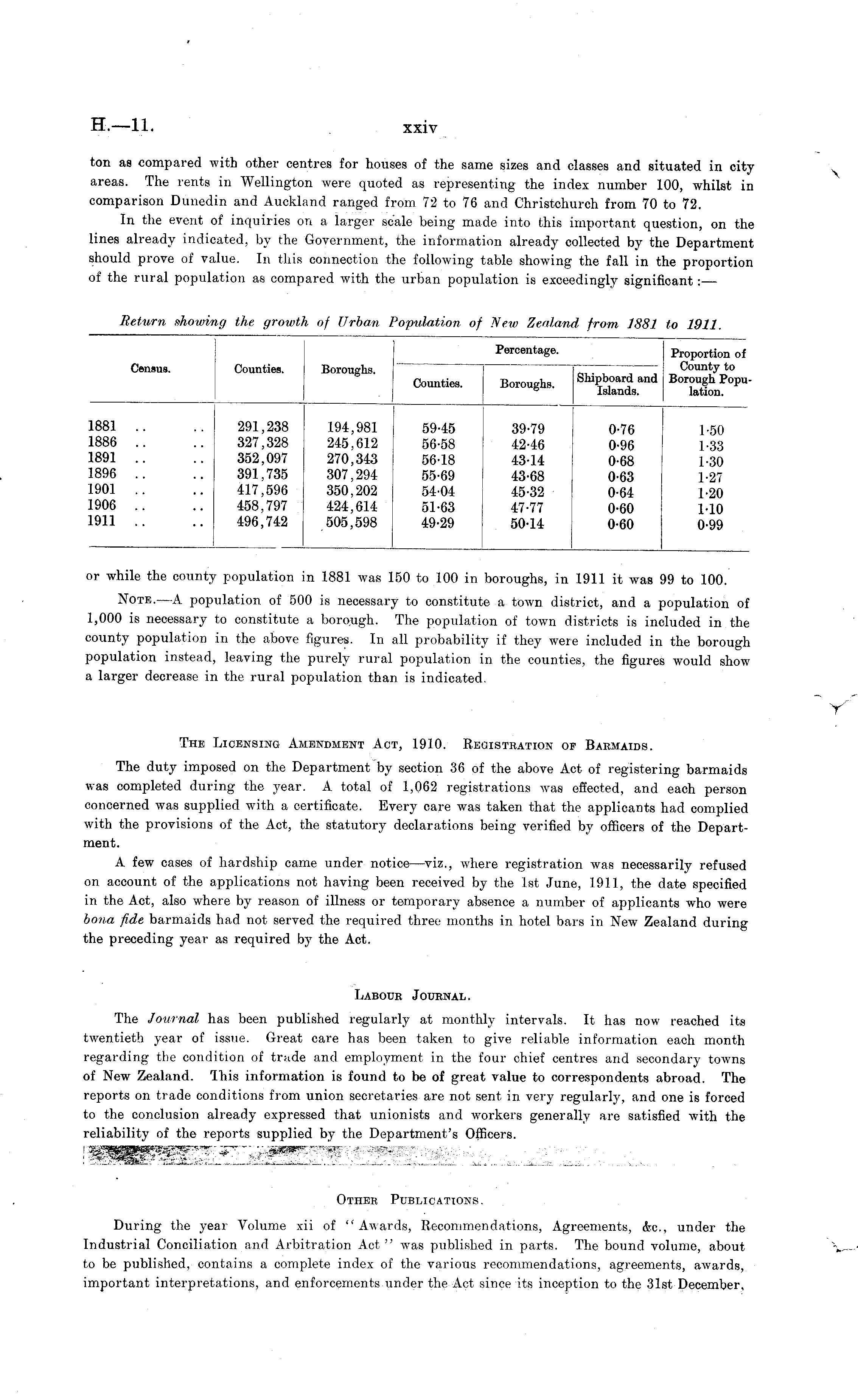 or while the county population in 1881 was 150 to 100 in boroughs, in 1911 it was 99 to 100. Note. —A population of 500 is necessary to constitute a town district, and a population of 1,000 is necessary to constitute a borough. The population of town districts is included in the county population in the above figures. In all probability if they were included in the borough population instead, leaving the purely rural population in the counties, the figures would show a larger decrease in the rural population than is indicated. The Licensing Amendment Act, 1910. Registration of Barmaids. The duty imposed on the Department by section 36 of the above Act of registering barmaids was completed during the year. A total of 1,062 registrations was effected, and each person concerned was supplied with a certificate. Every care was taken that the applicants had complied with the provisions of the Act, the statutory declarations being verified by officers of the Department. A few cases of hardship came under notice —viz., where registration was necessarily refused on account of the applications not having been received by the Ist June, 1911, the date specified in the Act, also where by reason of illness or temporary absence a number of applicants who were bona fide barmaids had not served the required three months in hotel bars in New Zealand during the preceding year as required by the Act. Labour Journal. The Journal has been published regularly at monthly intervals. It has now reached its twentieth year of issue. Great care has been taken to give reliable information each month regarding the condition of trade and employment in the four chief centres and secondary towns of New Zealand. This information is found to be of great value to correspondents abroad. The reports on trade conditions from union secretaries are not sent in very regularly, and one is forced to the conclusion already expressed that unionists and workers generally are satisfied with the reliability of the reports supplied by the Department's Officers. isggpfi ~ "• - ;■ . . . ... .... . .. '... ;..;.... ;....., . . ...... _~ .._;.,. ;, , Other Publications. During the year Volume xii of " Awards, Recommendations, Agreements, &c, under the Industrial Conciliation and Arbitration Act " was published in parts. The bound volume, about to be published, contains a complete index of the various recommendations, agreements, awards, important interpretations, and enforcements under the Act since its inception to the 31st December,