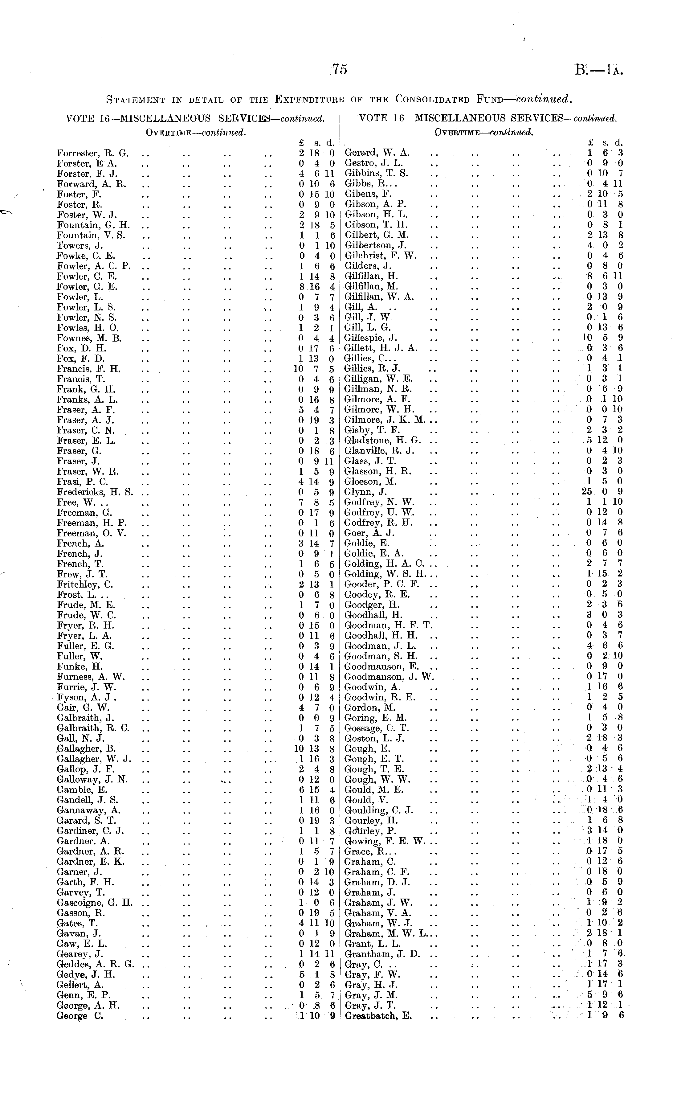 Statement in detail of the Expenditure of the Consolidated Fund— continued. VOTE 16-MISCELLANEOUS SERVlCES— continued. | VOTE 16—MISCELLANEOUS SERVlCES— continued. Overtime— continued. Overtime — continued. £ s. d. . £ s. d. Forrester, R. G. .. .. .. .. . 2 18 0 Gerard, W. A. .. .. .. .. 16 3 Forster, EA. .. .. .. .. 0 4 0 Gestro, J. h. .. .. .. .. 0 9 0 Forster, F. J. .. .. .. .. 4 6 11 Gibbins, T. S. .. .. .. .. 0 10 7 Forward, A. R. .. .. .. .. 010 6 Gibbs, R... .. .. .. ... 0 411 Foster, F. .. .. .. .. 015 10 Gibens, F. .. .. .. .. 210 5 Foster, R. .. .. .. .. 0 9 0 Gibson, A. P. ..- .. .. .. 0 11 8 Foster, W. J. .. .. .. .. 2 910 Gibson, H. L. .. .. .. .. 0 3 0 Fountain, G. H. .. .. .. .. 218 5 Gibson, T. H. .. .. .. .. 0 8 1 Fountain, V. S. .. .. .. 116 Gilbert, G. M. .. .. .. .. 2 13 8 Towers, J. .. .. .. .. 0 110 Gilbertson, J. .. .. .. .. 4 0 2 Fowke, C. E. .. .. .. .. 0 4 0 Gilchrist, F. W. .. .. .. .. 0 4 6 Fowler, A. C. P. .. .. .. .. 16 6 Gilders, J. .. .. .. .. 0 8 0 Fowler, C. E. .. .. .. .. 1 14 8 Gilfillan, H. .. .. .. .. 8 6 11 Fowler, G. E. .. .. .. .. 816 4 Gilfillan, M. .. .. .. .. 0 3 0 Fowler, L. .. .. .. .. 0 7 7 Gilfillan, W. A. .. .. .. .. 013 9 Fowler, L. S. .. .. .. ~ 19 4 Gill, A. .. .. .. .. .. 2 0 9 Fowler, N. S. .. .. .. .. 0 3 6 Gill, J. W. .. .. .. .. 0 16 Fowles, H. O. .. .. .. .. 12 1 Gill, L. G. .. .. .. .. 013 6 Fownes, M. B. .. .. .. .. 0 4 4 Gillespie, J. .. .. .. .. 10 5 9 Fox, D. H. .. .. .. .. 0 17 6 Gillett, H. J. A. .. .. .. ...0 3 6 Fox, F. D. .. .. .. .. 113 0 Gillies, C... .. .. .. .. 0 4 1 Francis, F. H. .. .. .. .. 10 7 5 Gillies, R. J. .. .. .. .. 13 1 Francis, T. .. .. .. .. 0 4 6 Gilligan, W. E. .. .. .. .. 0 3 1 Frank, G. H. .. .. .. .. 0 9 9 Gillman, N. R. .. .. .. .. 0 6 9 Franks, A. L. .. .. .. .. 016 8 Gilmore, A. F. .. .. .. .. 0 110 Fraser, A. F. .. .. .. .. 5 4 7 Gilmore, W. H. .. .. .. .. 0 010 Fraser, A. J. .. .. .. .. 019 3 Gilmore, J. K. M. .. .. .. .. 0 7 3 Fraser, C. N. .. .. .. .. 0 18 Gisby, T. F. .. .. .. .. 2 3 2 Fraser, E. L. .. .. .. .. 0 2 3 Gladstone, H. G. .. .. .. .. 512 0 Fraser, G. .. .. .. .. 018 6 Glanville, R. J. .. .. .. .. 0 410 Fraser, J. .. .. .. .. 0 9 11 Glass, J. T. .. .. 023 Fraser, W. R. .. .. .. .. 15 9 Glasson, H. R. .. .. ... .. 030 Frasi, P. C. .. .. .. .. 414 9 Gleeson, M. .. .. .. .. 15 0 Fredericks, H. S. .. .. .. .. 0 5 9 Glynn, J. .. .. .. .. 25 0 9 Free, W. .. .. .. .. .. 7 8 5 Godfrey, N. W. .. .. .... 1 1 10 Freeman, G. .. .. .. .. 017 9 Godfrey, U. W. .. .. .. .. 012 0 Freeman, H. P. .. .. .. .. 0 16 Godfrey, R. H. .. .. .. .. 014 8 Freeman, O. V. .. .. .. .. 011 0 Goer, A. J. .. .. .. ..076 French, A. .. .. .. .. 314 7 Goldie, E. .. .. .. .. 0 6 0 French, J. .. .. .. .. 0 9 1 Goldie, E. A. .. .. .. .. 0 6 0 French, T. .. .. .. .. 16 5 Golding, H. A. C. .. .. .. .. 2 7 7 Frew, J. T. .. .. .. .. 0 5 0 Golding, W. S. H. .. .. .. .. 1 15 2 Fritchley, C. .. .. .. .. 213 1 Gooder, P. C. F. .. .. .. .. 0 2 3 Frost, L. .. .. .. .. .. 0 6 8 Goodey, R. E. .. .. .. .. 0 5 0 Frude, M. E. .. .. .. .. 17 0 Goodger, H. .. .. .. .. 2 3 6 Frude, W. C. .. .. .. .. 0 6 0 Goodhall, H. .. .. .. .. 3 0 3 Fryer, R. H. .. .. .. .. 015 0 Goodman, H. F. T. .. .. .. 0 4 6 Fryer, L. A. .. .. .. .. 011 6 Goodhall, H. H. .. .. .. .. 0 3 7 Fuller, E. G. .. .. .. .. 0 3 9 Goodman, J. L. .. .. .. .. 4 6 6 Fuller, W. .. .. .. .. 0 4 6 Goodman, S. H. .. .. .. .. 0 210 Funke, H. .. .. .. .. 014 1 Goodmanson, E. .. .. .. .. 0 9 0 Furness, A. W. .. .. .. .. 011 8 Goodmanson, J. W. ... .. .. 017 0 Furrie, J. W. .. .. .. .. 0 6 9 Goodwin, A. .. .. .. .. 116 6 Fyson, A. J . .. .. .. .. 012 4 Goodwin, R. E. .. .. .. .. 12 5 Gair, G. W. .. .. .. .. 4 7 0 Gordon, M. .. .. .. .. 0 4 0 Galbraith, J. .. .. .. .. 0 0 9 Goring, E. M. .. .. .. .. 15 8 Galbraith, R. C. .. .. .. .. 17 5 Gossage, C. T. .. .. .. .. 0 3 0 GaU, N. J. .. .. .. .. 0 3 8 Goston, L. J. .. .. .. .. 218 3 Gallagher, B. .. .. .. .. 10 13 8 Gough, E. .. .. .. . ..046 Gallagher, W. J. .. .. .. .. 116 3 Gough, E. T. .. .. .. .. 0 5 6 Gallop, J. F. .. .. .. .. 2 4 8 Gough, T. E. .. .. .. .. 213 4 Galloway, J. N. .. .. ».. .. 012 0 Gough, W. W. .. .. .. .. 0 4 6 Gamble, E. .. .. .. .. 6 15 4 Gould, M. E. .. .. .. .. 011 3 Gandell, J. S. .. .. .. .. 1 11 6 Gould, V. .. .. .. ...:': 1 4 0 Gannaway, A. .. .. .. .. 1 16 0 Goulding, C. J. .. .. .. .... -0 18 6 Garard, S. T. .. .. .. .. 019 3 Gourley, H. .. .. .. ..168 Gardiner, C. J. .. .. .. .. 118 Gdtirley, P. .. .. .. .. 314 0 Gardner, A. .. .. .. .. 0 11 7 Gowing, F. E. W. .. .. .. .. 118 0 Gardner, A. R. .. .. .. .. 15 7 Grace, R... .. .. .. .. 017 5 Gardner, E. K. .. .. .. 0 19 Graham, C. ... .. .. .. 0 12 6 Gamer, J. .. .. .. .. 0 210 Graham, C. F. .. .. .. .. 018 0 Garth, F. H. .. .. .. .. 0 14 3 Graham, D. J. .. .. .. ... 0 5 9 Garvey, T. .. .. .. .. 012 0 Graham, J. .. .. .. .. 0 6 0 Gascoigne, G. H. .. .. .. .. 10 6 Graham, J. W. .. .. ~. .. 19 2 Gasson, R. .. .. .. .. 019 5 Graham, V. A. .. .. .. .. 0 2 6 Gates, T. .. ...... .. 411 10 Graham, W. J. .. .. .. .. 110 2 Gavan, J. .. .. .. .. 0 19 Graham, M. W. L... .. .. .. 2 18 1 Gaw, E. L. .. .. .. .. 0 12 0 Grant, L. L. .. .. .. ...080 Gearey, J. .. .. .. .. 1 14 11 Grantham, J. D. .. .. .. ... ' . 1 7. 8. Geddes, A. R. G. .. .. .. .. 0 2 6 Gray, C. .. .. ;. .. .. .117 3 Gedye, J. H. .. .. .. .. 5 18 Gray, F. W. .. .. .. .. OH 6 Gellert, A. .. .. .. .. 0 2 6 Gray, H. J. .. .. ... .. 117 1 Germ, E. P. .. .. .. .. 15 7 Gray, J. M. .. .. .. .... 5 9 6 George, A. H. .. .. .. .. 0 8 6 Gray, J. T. .. .. .. .. 1 12 1 George C. .. .. .. .. 110 9 Greatbatch, E. .. .. ~ ..196