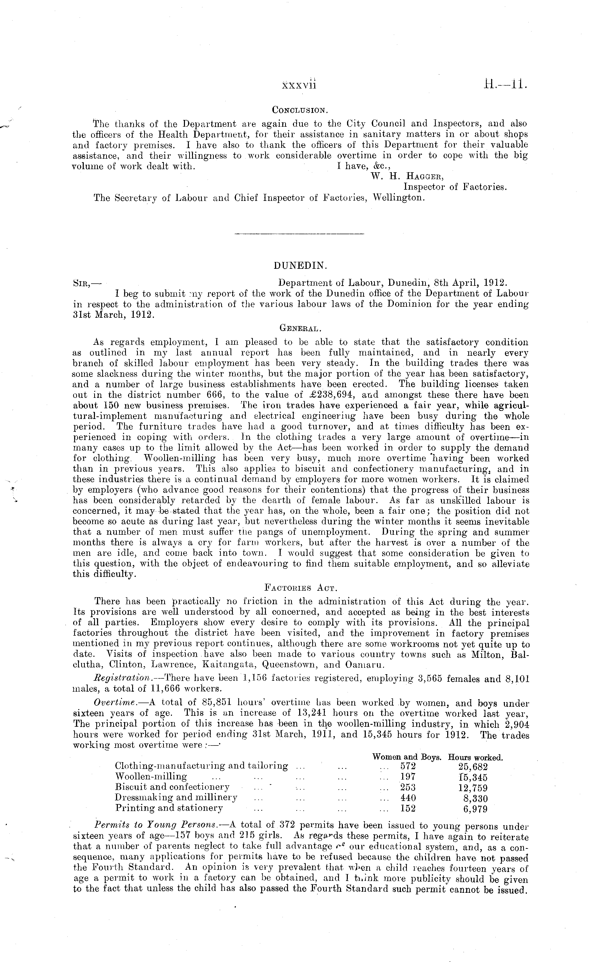 Conclusion. The thanks of the Department are again due to the City Council and Inspectors, and also the officers of the Health Department, for their assistance in sanitary matters in or about shops and factory premises. I have also to thank the officers of this Department for their valuable assistance, and their willingness to work considerable overtime in order to cope with the big volume of work dealt with. I have, &c, W. H. Hagger, Inspector of Factories. The Secretary of Labour and Chief Inspector of Factories, Wellington.