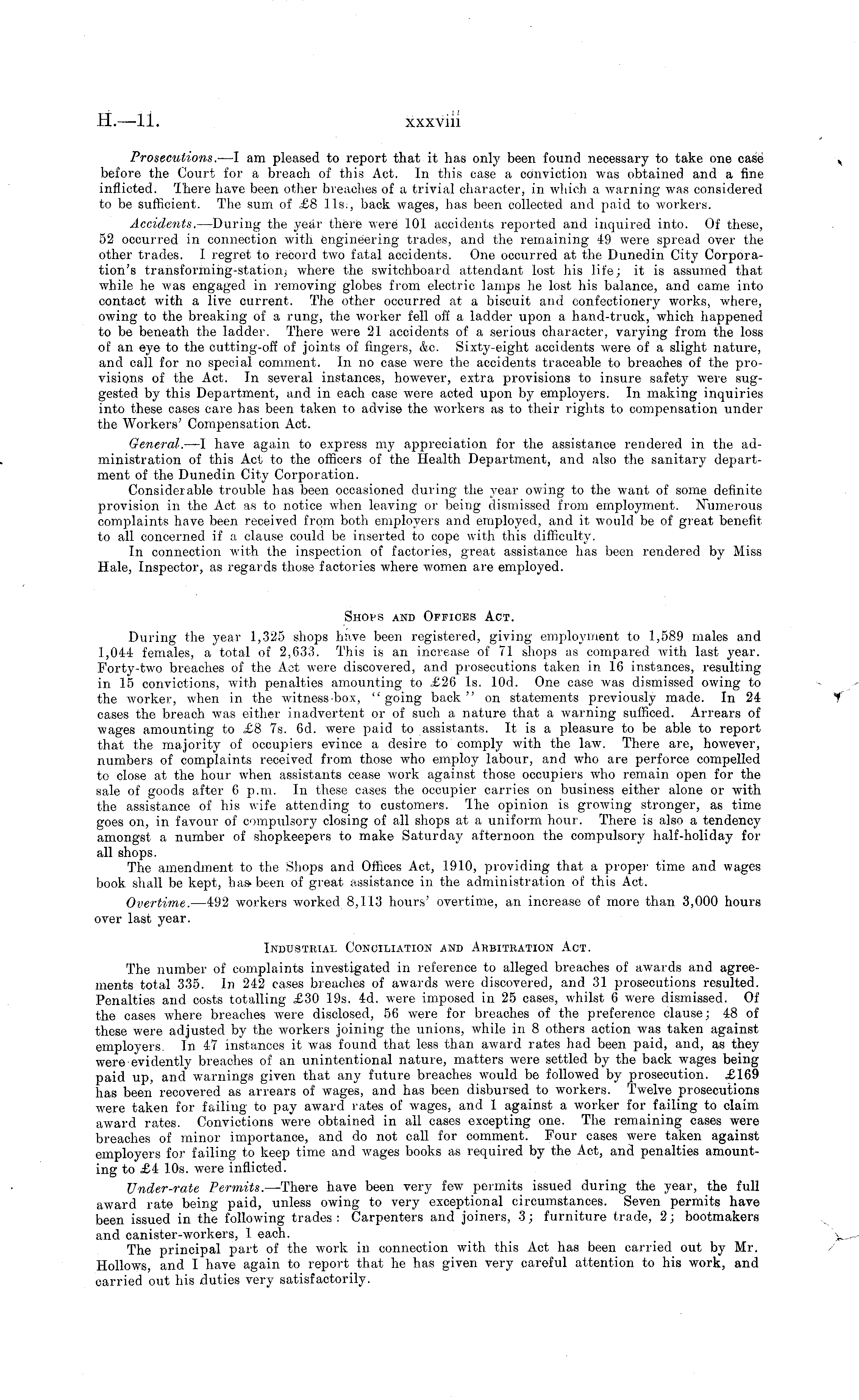 Prosecutions. —I am pleased to report that it has only been found necessary to take one case before the Court for a breach of this Act. In this case a conviction was obtained and a fine inflicted. There have been other breaches of a trivial character, in which a warning was considered to be sufficient. The sum of £8 lis., back wages, has been collected and paid to workers. Accidents. —During the year there were 101 accidents reported and inquired into. Of these, 52 occurred in connection with engineering trades, and the remaining 49 were spread over the other trades. I regret to record two fatal accidents. One occurred at the Dunedin City Corporation's transforming-statioiij where the switchboard attendant lost his life; it is assumed that while he w-as engaged in removing globes from electric lamps he lost his balance, and came into contact with a live current. The other occurred at a biscuit and confectionery works, where, owing to the breaking of a rung, the worker fell off a ladder upon a hand-truck, which happened to be beneath the ladder. There were 21 accidents of a serious character, varying from the loss of an eye to the cutting-off of joints of fingers, &c. Sixty-eight accidents were of a slight nature, and call for no special comment. In no case were the accidents traceable to breaches of the provisions of the Act. In several instances, however, extra provisions to insure safety were suggested by this Department, and in each case were acted upon by employers. In making inquiries into these cases care has been taken to advise the w-orkers as to their rights to compensation under the Workers' Compensation Act. General. —I have again to express my appreciation for the assistance rendered in the administration of this Act to the officers of the Health Department, and also the sanitary department of the Dunedin City Corporation. Considerable trouble has been occasioned during the ye&r owing to the want of some definite provision in the Act as to notice when leaving or being dismissed from employment. Numerous complaints have been received from both employers and employed, and it would be of great benefit to all concerned if a clause could be inserted to cope with this difficulty. In connection with the inspection of factories, great assistance has been rendered by Miss Hale, Inspector, as regards those factories where women are employed. Shops and Offices Act. During the year 1,325 shops have been registered, giving employment to 1,589 males and 1,044 females, a total of 2,633. This is an increase of 71 shops as compared with last year. Forty-two breaches of the Act were discovered, and prosecutions taken in 16 instances, resulting in 15 convictions, with penalties amounting to £26 Is. lOd. One case was dismissed owing to the worker, when in the w-itness-box, "going back" on statements previously made. In 24 cases the breach was either inadvertent or of such a nature that a warning sufficed. Arrears of wages amounting to £8 7s. 6d. were paid to assistants. It is a pleasure to be able to report that the majority of occupiers evince a desire to comply with the law. There are, how-ever, numbers of complaints received from those who employ labour, and who are perforce compelled to close at the hour when assistants cease work against those occupiers who remain open for the sale of goods after 6 p.m. In these cases the occupier carries on business either alone or with the assistance of his wife attending to customers. The opinion is growing stronger, as time goes on, in favour of compulsory closing of all shops at a uniform hour. There is also a tendency amongst a number of shopkeepers to make afternoon the compulsory half-holiday for all shops. The amendment to the Shops and Offices Act, 1910, providing that a proper time and wages book shall be kept, has- been of great assistance in the administration of this Act. Overtime. —492 workers worked 8,113 hours' overtime, an increase of more than 3,000 hours over last year. Industrial Conciliation and Arbitration Act. The number of complaints investigated in reference to alleged breaches of awards and agreements total 335. In 242 cases breaches of awards were discovered, and 31 prosecutions resulted. Penalties and costs totalling £30 19s. 4d. were imposed in 25 cases, whilst 6 were dismissed. Of the cases where breaches were disclosed, 56 were for breaches of the preference clause; 48 of these were adjusted by the workers joining the unions, while in 8 others action was taken against employers. In 47 instances it was found that less than award rates had been paid, and, as they were evidently breaches of an unintentional nature, matters were settled by the back wages being paid up, and warnings given that any future breaches w-ould be followed by prosecution. £169 has been recovered as arrears of wages, and has been disbursed to workers. Twelve prosecutions were taken for failing to pay award rates of wages, and 1 against a worker for failing to claim award rates. Convictions were obtained in all cases excepting one. The remaining cases were breaches of minor importance, and do not call for comment. Four cases were taken against employers for failing to keep time and wages books as required by the Act, and penalties amounting to £4 10s. were inflicted. Under-rate Permits. —There have been very few permits issued during the year, the full award rate being paid, unless owing to very exceptional circumstances. Seven permits have been issued in the following trades: Carpenters and joiners, 3; furniture trade, 2; bootmakers and canister-workers, 1 each. The principal part of the work in connection with this Act has been carried out by Mr. Hollows, and I have again to report that he has given very careful attention to his work, and carried out his duties very satisfactorily.