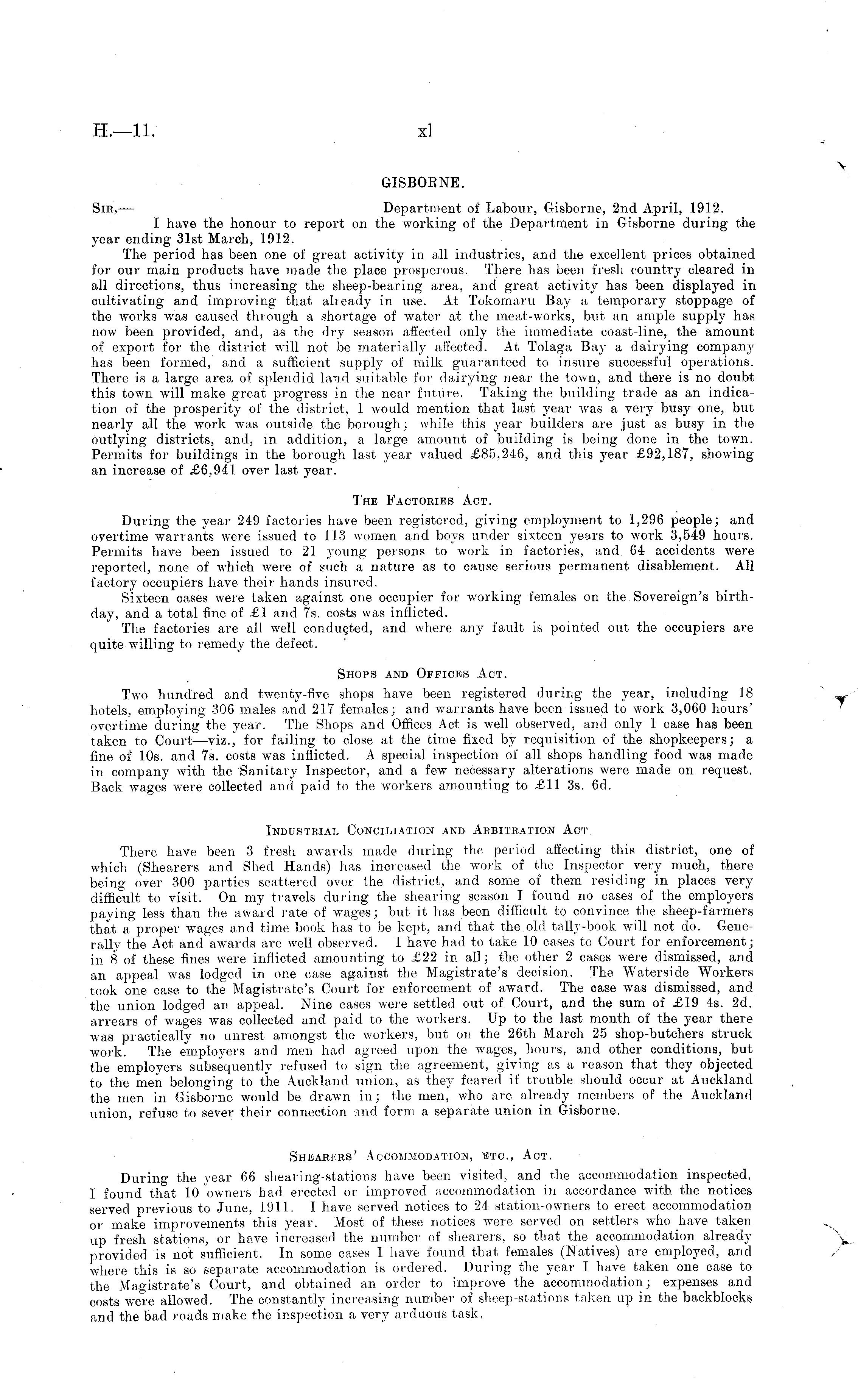 GISBORNE. Sir, —- Department of Labour, Gisborne, 2nd April, 1912. I have the honour to report on the working of the Department in Gisborne during the year ending 31st March, 1912. The period has been one of great activity in all industries, and the excellent prices obtained for our main products have made the place prosperous. There has been fresh country cleared in all directions, thus increasing the sheep-bearing area, and great activity has been displayed in cultivating and improving that already in use. At Tokomaru Bay a temporary stoppage of the works was caused through a shortage of water at the meat-works, but an ample supply has now been provided, and, as the dry season affected only the immediate coast-line, the amount of export for the district w-ill not be materially affected. At Tolaga Bay a dairying company has been formed, and a sufficient supply of milk guaranteed to insure successful operations. There is a large area of splendid land suitable for dairying near the town, and there is no doubt this town will make great progress in the near future. Taking the building trade as an indication of the prosperity of the district, I would mention that last year was a very busy one, but nearly all the work was outside the borough; while this year builders are just as busy in the outlying districts, and, in addition, a large amount of building is being done in the town. Permits for buildings in the borough last year valued £85,246, and this year £92,187, showing an increase of £6,941 over last year. The Factories Act. During the year 249 factories have been registered, giving employment to 1,296 people; and overtime warrants were issued to 113 women and boys under sixteen years to work 3,549 hours. Permits have been issued to 21 young persons to work in factories, and 64 accidents were reported, none of which were of such a nature as to cause serious permanent disablement. All factory occupiers have their hands insured. Sixteen cases w-ere taken against one occupier for working females on the Sovereign's birthday, and a total fine of £1 and 7s. costs was inflicted. The factories are all well condugted, and where any fault is pointed out the occupiers are quite willing to remedy the defect. Shops and Offices Act. Two hundred and twenty-five shops have been registered during the year, including 18 hotels, employing 306 males and 217 females; and warrants have been issued to work 3,060 hours' overtime during the year. The Shops and Offices Act is well observed, and only 1 case has been taken to Court —viz., for failing to close at the time fixed by requisition of the shopkeepers; a fine of 10s. and 7s. costs was inflicted. A special inspection of all shops handling food was made in company with the Sanitaty Inspector, and a few necessary alterations w-ere made on request. Back wages were collected and paid to the workers amounting to £11 3s. 6d. Industrial Conciliation and Arbitration Act. There have been 3 fresh awards made during the period affecting this district, one of which (Shearers and Sited Hands) has increased the work of the Inspector very much, there being over 300 parties scattered over the district, and some of them residing in places very difficult to visit. On my travels during the shearing season 1 found no cases of the employers paying less than the award rate of wages; but it has been difficult to convince the sheep-farmers that a proper wages and time book has to be kept, and that the old tally-book will not do. Generally the Act and awards are well observed. I have had to take 10 cases to Court for enforcement; in 8 of these fines were inflicted amounting to £22 in. all; the other 2 cases w-ere dismissed, and an appeal was lodged in one case against the Magistrate's decision. The Waterside Workers took one case to the Magistrate's Court for enforcement of award. The case was dismissed, and the union lodged an appeal. Nine cases were settled out of Court, and the sum of £19 4s. 2d. arrears of wages was collected and paid to the workers. Up to the last month of the year there w-as practically no unrest amongst the workers, but on the 26th March 25 shop-butchers struck work. The employers and men had agreed upon the wages, hours, and other conditions, but the employers subsequently refused to sign the agreement, giving as a reason that they objected to the men belonging to the Auckland union, as they feared if trouble should occur at Auckland the men in Gisborne would be drawn in; the men, who are already members of the Auckland union, refuse to sever their connection and form a separate union in Gisborne. Shearers' Accommodation, etc., Act. During the year 66 shearing-stations have been visited, and the accommodation inspected. I found that 10 owners had erected or improved accommodation in accordance with the notices served previous to June, 1911. I have served notices to 24 station-owners to erect accommodation or make improvements this year. Most of these notices were served on settlers who have taken up fresh stations, or have increased the number of shearers, so that the accommodation already provided is not sufficient. In some cases I have found that females (Natives) are emploj-ed, and where this is so separate accommodation is ordered. During the year I have taken one case to the Magistrate's Court, and obtained an order to improve the accommodation; expenses and costs were allowed. The constantly increasing number of sheep-stations taken up in the backblocks and the bad roads make the inspection a very arduous task.