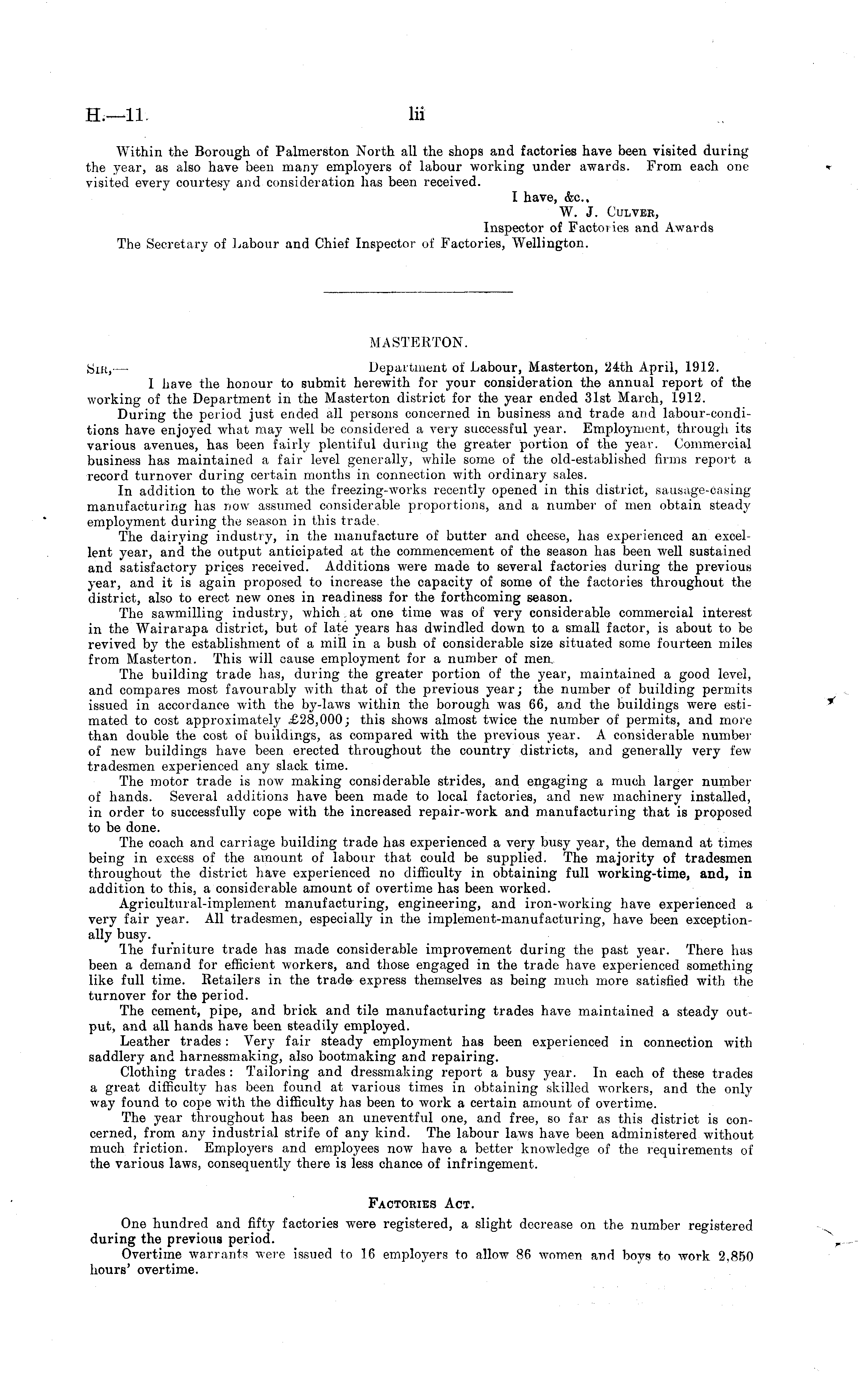 MASTERTON. Sir, — Department of Labour, Masterton, 24th April, 1912. I have the honour to submit herewith for your consideration the annual report of the working of the Department in the Masterton district for the year ended 31st March, 1912. During the period just ended all persons concerned in business and trade and labour-condi-tions have enjoyed w-hat may well be considered a very successful year. Employment, through its various avenues, has been fairly plentiful during the greater portion of the year. Commercial business has maintained a fair level generally, while some of the old-established firms report a record turnover during certain months in connection with ordinary sales. In addition to the work at the freezing-works recently opened in this district, sausage-casing manufacturing has now assumed considerable proportions, and a number of men obtain steady employment during the season in this trade. The dairying industry, in the manufacture of butter and cheese, has experienced an excellent year, and the output anticipated at the commencement of the season has been well sustained and satisfactory prices received. Additions were made to several factories during the previous year, and it is again proposed to increase the capacity of some of the factories throughout the district, also to erect new ones in readiness for the forthcoming season. The sawmilling industry, which at one time was of very considerable commercial interest in the Wairarapa district, but of late years has dwindled down to a small factor, is about to be revived by the establishment of a mill in a bush of considerable size situated some fourteen miles from Masterton. This will cause employment for a number of men The building trade has, during the greater portion of the year, maintained a good level, and compares most favourably with that of the previous year; the number of building permits issued in accordance with the by-laws within the borough was 66, and the buildings were estimated to cost approximately £28,000; this show-s almost twice the number of permits, and more than double the cost of buildings, as compared with the previous year. A considerable number of new buildings have been erected throughout the country districts, and generally very fewtradesmen experienced any slack time. The motor trade is now making considerable strides, and engaging a much larger number of hands. Several additions have been made to local factories, and new machinery installed, in order to successfully cope with the increased repair-work and manufacturing that is proposed to be done. The coach and carriage building trade has experienced a very busy year, the demand at times being in excess of the amount of labour that could be supplied. The majority of tradesmen throughout the district have experienced no difficulty in obtaining full working-time, and, in addition to this, a considerable amount of overtime has been worked. Agricultural-implement manufacturing, engineering, and iron-working have experienced a very fair year. All tradesmen, especially in the implement-manufacturing, have been exceptionally busy. The furniture trade has made considerable improvement during the past year. There has been a demand for efficient workers, and those engaged in the trade have experienced something like full time. Retailers in the trade express themselves as being much more satisfied with the turnover for the period. The cement, pipe, and brick and tile manufacturing trades have maintained a steady output, and all hands have been steadily employed. Leather trades: Very fair steady employment has been experienced in connection with saddlery and harnessmaking, also bootmaking and repairing. Clothing trades : Tailoring and dressmaking report a busy year. In each of these trades a great difficulty has been found at various times in obtaining skilled workers, and the only way found to cope with the difficulty has been to work a certain amount of overtime. The year tliroughout has been an uneventful one, and free, so far as this district is concerned, from any industrial strife of any kind. The labour laws have been administered without much friction. Employers and employees now have a better knowledge of the requirements of the various laws, consequently there is less chance of infringement. Factories Act. One hundred and fifty factories were registered, a slight decrease on the number registered during the previous period. Overtime warrants were issued to 16 employers to allow 86 women and boys to work 2,850 hours' overtime.