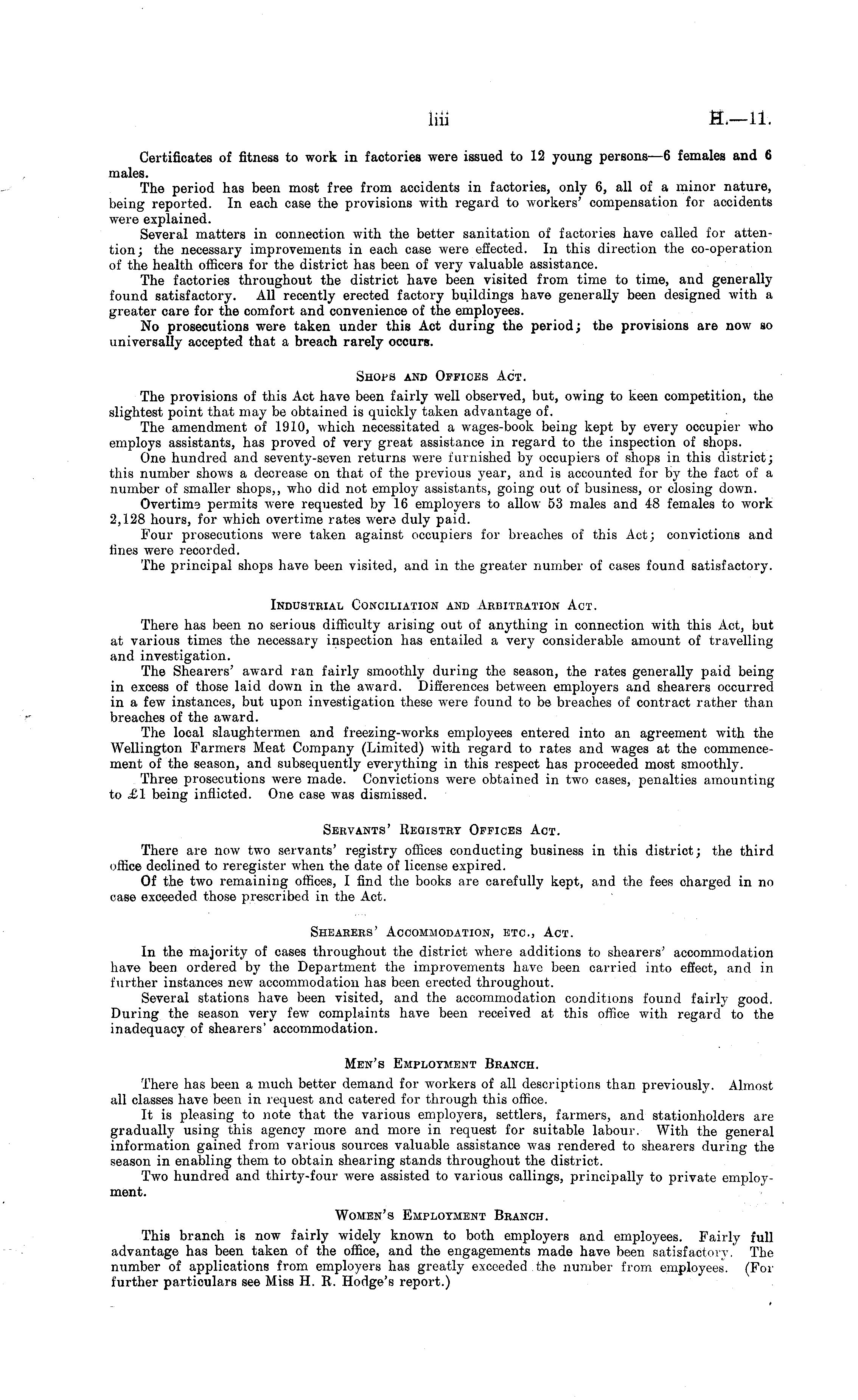 Certificates of fitness to work in factories were issued to 12 young persons —6 females and 6 males. The period has been most free from accidents in factories, only 6, all of a minor nature, being reported. In each case the provisions with regard to workers' compensation for accidents were explained. Several matters in connection with the better sanitation of factories have called for attention; the necessary improvements in each case were effected. In this direction the co-operation of the health officers for the district has been of very valuable assistance. The factories throughout the district have been visited from time to time, and generally found satisfactory. All recently erected factory buildings have generally been designed with a greater care for the comfort and convenience of the employees. No prosecutions were taken under this Act during the period; the provisions are now so universally accepted that a breach rarely occurs. Shops and Offices Act. The provisions of this Act have been fairly well observed, but, owing to keen competition, the slightest point that may be obtained is quickly taken advantage of. The amendment of 1910, which necessitated a wages-book being kept by every occupier who employs assistants, has proved of very great assistance in regard to the inspection of shops. One hundred and seventy-seven returns were furnished by occupiers of shops in this district; this number shows a decrease on that of the previous year, and is accounted for by the fact of a number of smaller shops,, who did not employ assistants, going out of business, or closing down. Overtime permits were requested by 16 employers to allow 53 males and 48 females to work 2,128 hours, for which overtime rates were duly paid. Four prosecutions were taken against occupiers for breaches of this Act; convictions and fines were recorded. The principal shops have been visited, and in the greater number of cases found satisfactory. Industrial Conciliation and Arbitration Act. There has been no serious difficulty arising out of anything in connection with this Act, but at various times the necessary inspection has entailed a very considerable amount of travelling and investigation. The Shearers' award ran fairly smoothly during the season, the rates generally paid being in excess of those laid down in the award. Differences between employers and shearers occurred in a few instances, but upon investigation these were found to be breaches of contract rather than breaches of the award. The local slaughtermen and freezing-works employees entered into an agreement with the Wellington Farmers Meat Company (Limited) with regard to rates and wages at the commencement of the season, and subsequently everything in this respect has proceeded most smoothly. Three prosecutions were made. Convictions were obtained in two cases, penalties amounting to £1 being inflicted. One case was dismissed. Servants' Registry Offices Act. There are now two servants' registry offices conducting business in this district; the third office declined to reregister when the date of license expired. Of the two remaining offices, I find the books are carefully kept, and the fees charged in no case exceeded those prescribed in the Act. Shearers' Accommodation, etc., Act. In the majority of cases throughout the district where additions to shearers' accommodation have been ordered by the Department the improvements have been carried into effect, and in further instances new accommodation has been erected throughout. Several stations have been visited, and the accommodation conditions found fairly good. During the season very few complaints have been received at this office with regard to the inadequacy of shearers' accommodation. Men's Employment Branch. There has been a much better demand for workers of all descriptions than previously. Almost all classes have been in request and catered for through this office. It is pleasing to note that the various employers, settlers, farmers, and stationholders are gradually using this agency more and more in request for suitable labour. With the general information gained from various sources valuable assistance was rendered to shearers during the season in enabling them to obtain shearing stands throughout the district. Two hundred and thirty-four were assisted to various callings, principally to private employment. Women's Employment Branch. This branch is now fairly widely known to both employers and employees. Fairly full advantage has been taken of the office, and the engagements made have been satisfactory. The number of applications from employers has greatly exceeded the number from employees. (For further particulars see Miss H. R. Hodge's report.)