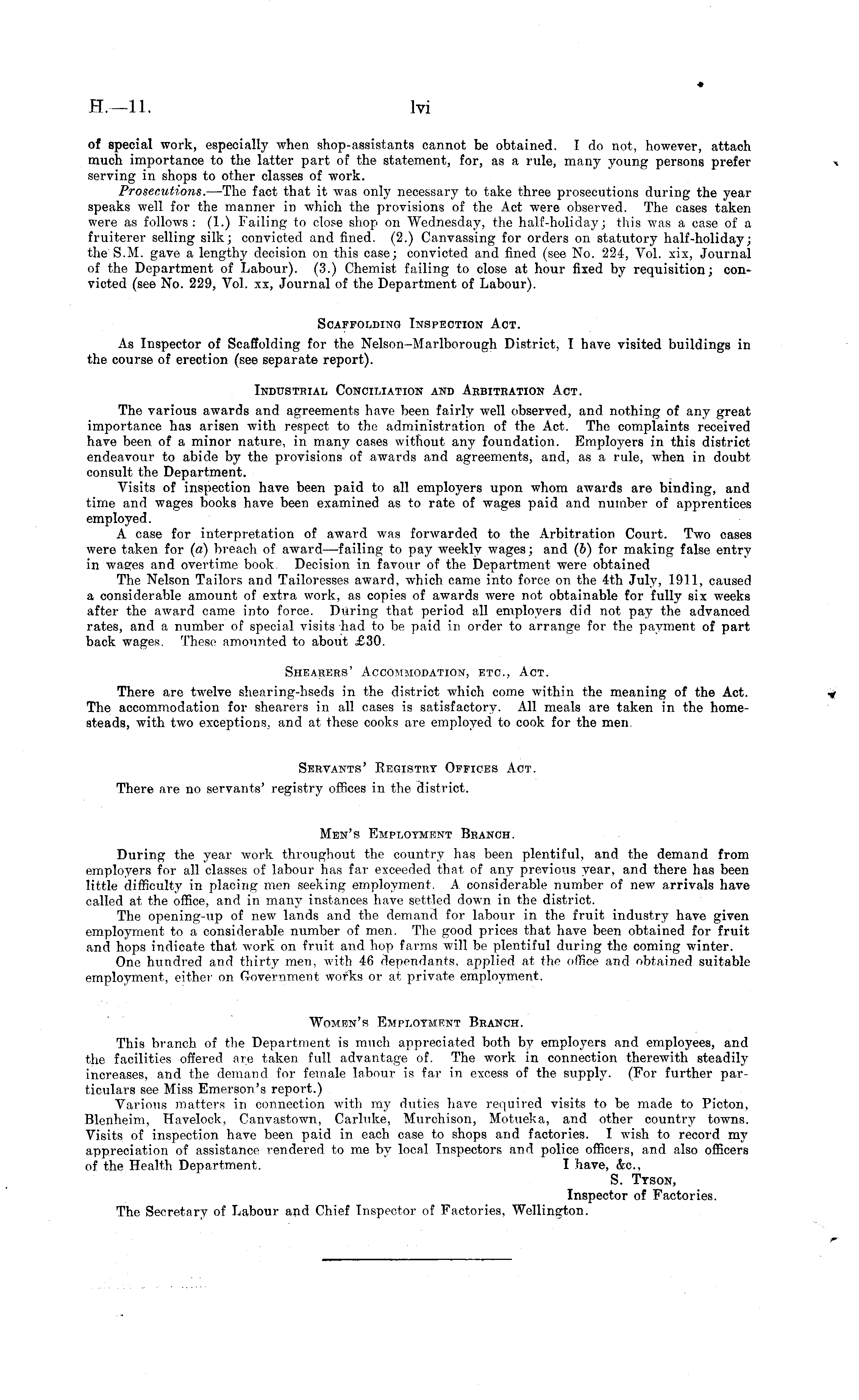 of special work, especially when shop-assistants cannot be obtained. I do not, however, attach much importance to the latter part of the statement, for, as a rule, many young persons prefer serving in shops to other classes of work. Prosecutions. —The fact that it was only necessary to take three prosecutions during the year speaks well for the manner in which the provisions of the Act were observed. The cases taken were as follows: (1.) Failing to close shop on Wednesday, the half-holiday; this was a case of a fruiterer selling silk; convicted and fined. (2.) Canvassing for orders on statutory half-holiday; the S.M. gave a lengthy decision on this case; convicted and fined (see No. 224, Vol. xix, Journal of the Department of Labour). (3.) Chemist failing to close at hour fixed by requisition; convicted (see No. 229, Vol. xx, Journal of the Department of Labour). Scaffolding Inspection Act. As Inspector of Scaffolding for the Nelson-Marlborough District, I have visited buildings in the course of erection (see separate report). Industrial Conciliation and Arbitration Act. The various awards and agreements have been fairly well observed, and nothing of any great importance has arisen with respect to the administration of the Act. The complaints received have been of a minor nature, in many cases without any foundation. Employers in this district endeavour to abide by the provisions of awards and agreements, and, as a rule, when in doubt consult the Department. Visits of inspection have been paid to all employers upon whom awards are binding, and time and wages books have been examined as to rate of wages paid and number of apprentices employed. A case for interpretation of award was forwarded to the Arbitration Court. Two cases were taken for (a) breach of award—failing to pay weekly wages; and (6) for making false entry in wages and overtime book. Decision in favour of the Department were obtained The Nelson Tailors and Tailoresses award, which came into force on the 4th July, 1911, caused a considerable amount of extra work, as copies of awards were not obtainable for fully six weeks after the award came into force. During that period all employers did not pay the advanced rates, and a number of special visits had to be paid in order to arrange for the payment of part back wages. These amounted to about £30. Shearers' Accommodation, etc., Act. There are twelve shearing-hseds in the district which come within the meaning of the Act. The accommodation for shearers in all cases is satisfactory. All meals are taken in the homesteads, with two exceptions, and at these cooks are employed to cook for the men Servants' Registry Offices Act. There are no servants' registry offices in the district. Men's Employment Branch. During the year work throughout the country has been plentiful, and the demand from employers for all classes of labour has far exceeded that of any previous year, and there has been little difficulty in placing men seeking employment. A considerable number of new arrivals have called at the office, and in many instances have settled down in the district. The opening-up of new lands and the demand for labour in the fruit industry have given employment to a considerable number of men. The good prices that have been obtained for fruit and hops indicate that work on fruit and hop farms will be plentiful during the coming winter. One hundred and thirty men, with 46 dependants, applied at the office and obtained suitable employment, either on Government works or at private employment. Women's Employment Branch. This branch of the Department is much appreciated both by employers and employees, and the facilities offered are taken full advantage of. The work in connection therewith steadily increases, and the demand for female labour is far in excess of the supply. (For further particulars see Miss Emerson's report.) Various matters in connection with my duties have required visits to be made to Picton, Blenheim, Havelock, Canvastown, Carluke, Murchison, Motueka, and other country towns. Visits of inspection have been paid in each case to shops and factories. I wish to record my appreciation of assistance rendered to me by local Inspectors and police officers, and also officers of the Health Department. I have, &c, S. Tyson, Inspector of Factories. The Secretary of Labour and Chief Inspector of Factories, Wellington.