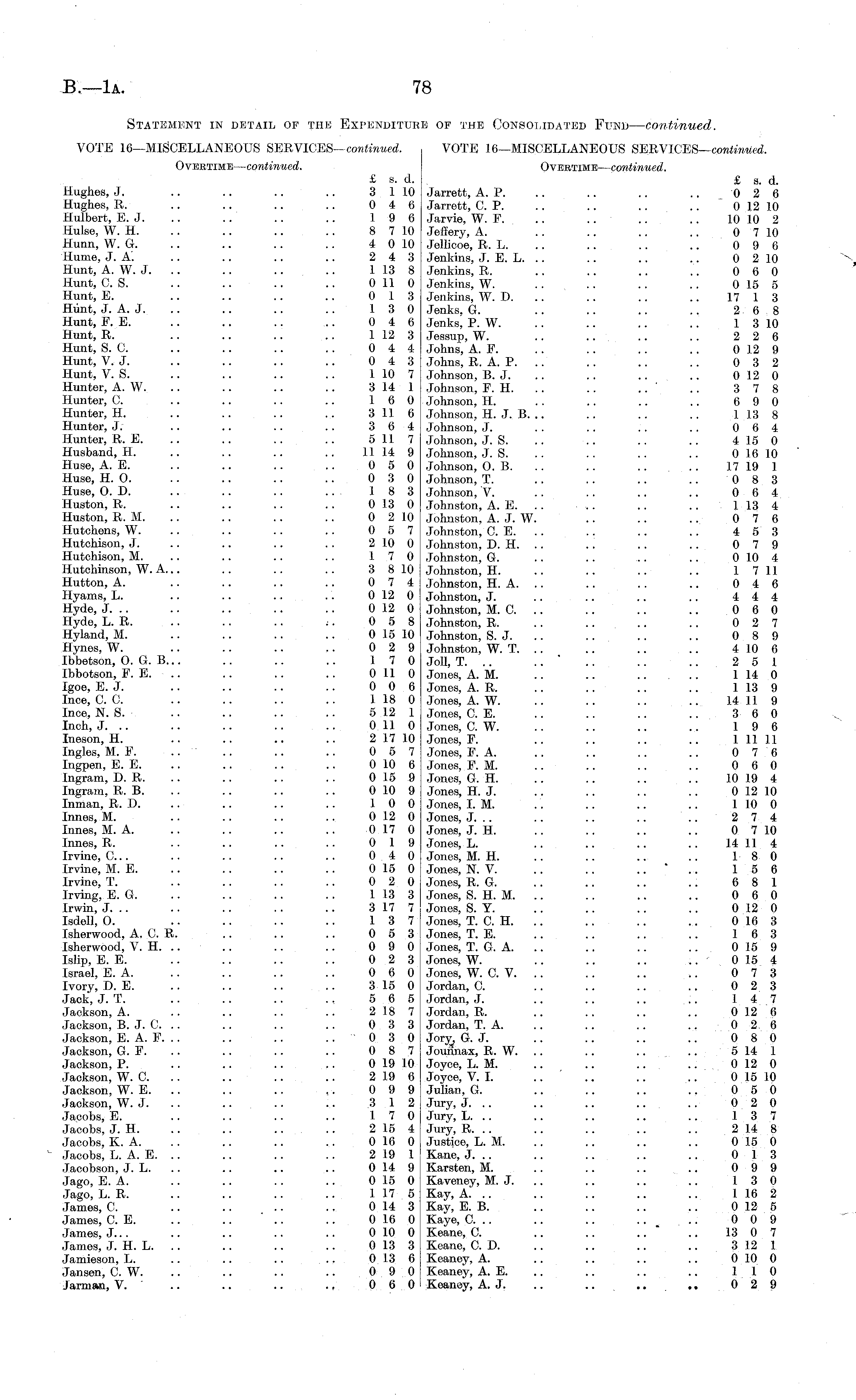 Statement in detail op the Expenditure of the Consolidated Fund— continued. VOTE 16—MISCELLANEOUS SERVlCES— continued. VOTE 16—MISCELLANEOUS SERVlCES— continued. Overtime— continued. Overtime— continued. £ s. d. £ s. d. Hughes, J. .. .. .. .. 3 110 Jarrett, A. P. .. .. .. .. 0 2 6 Hughes, R. .. .. .. .. 0 4 6 Jarrett, C. P. .. .. .. .. 012 10 Hulbert, E. J. .. .. .. .. 196 Jarvie, W. E. .. .. .. .. 10 10 2 Hulse, W. H. .. .. .. .. 8 710 Jeflery, A. .. .. .. .. 0 710 Hunn, W. G. .. .. .. .. 4 010 Jellicoe, R. L. .. .. .. .. 0 9 6 Hume, J. A. .. .. .. .. 2 4 3 Jenkins, J. E. L. .. .. .. .. 0 210 Hunt, A. W. J. .. .. .. .. 113 8 Jenkins, R. .. .. .. .. 0 6 0 Hunt, C. S. .. .. .. .. 0 11 0 Jenkins, W. .. .. .. .. 0 15 5 Hunt, E. .. .. .. .. 0 13 Jenkins, W. D. .. .. .. 17 1 3 Hiint, J. A. J. .. .. .. .. 13 0 Jenks, G. .. .. .. .. 2 6 8 Hunt, F. E. .. .. .. .. 0 4 6 Jenks, P. W. .. .. .... 1 310 Hunt, R. .. .. .. .. 112 3 Jessup, W. .. .. .. .. 2 2 6 Hunt, S. C. .. .. .. .. 0 4 4 Johns, A. F. . . .. .. .. 012 9 Hunt, V, J. .. .. .. .. 0 4 3 Johns, R. A. P. .. .. .. .. 0 3 2 Hunt, V. S. .. .. .. .. 1 10 7 Johnson, B. J. .. .. .. .. 0 12 0 Hunter, A. W. .. .. .. .. 314 1 Johnson, F. H. .. .. .. ' .. 3 7 8 Hunter, C. .. .. .. .. 16 0 Johnson, H. . . .. .. .. 6 9 0 Hunter, H. .. .. .. .. 3 11 6 Johnson, H. J. B. .. .. .. .. 113 8 Hunter, J. .. .. .. .. 3 6 4 Johnson, J. . . .. .. .. 0 6 4 Hunter, R. E. .. .. .. .. 5 11 7 Johnson, J. S. .. .. .. .. 4 IS 0 Husband, H. .. .. .. .. 11 14 9 Johnson, J. S. .. .. .. .. 0 16 10 Huse, A. E. .. .. .. .. 0 5 0 Johnson, O. B. .. .. .. .. 17 19 1 Huse, H. 0. .. .. .. ..030 Johnson, T. .. .. .. .. 083 Huse, O. D. .. .. .. ... 183 Johnson, V. .. .. .. .. 064 Huston, R. .. .. .. .. 013 0 Johnston, A. E. .. .. .. .. 113 4 Huston, R. M. .. .. . . .. 0 210 Johnston, A. J. W. .. .. .. 0 7 6 Hutchens, W. .. .. .. .. 0 5 7 Johnston, C. E. .. .. .. .. 4 5 3 Hutchison, J. .. .. .. . . 210 0 Johnston, D. H. .. .. .. .. 0 7 9 Hutchison, M. .. .. .. .. 17 0 Johnston, G. .. .. .. .. 010 4 Hutchinson, W. A... .. .. .. 3 8 10 Johnston, H. .. .. .. .. 1 7 11 Hutton, A. .. .. .. .. 0 7 4 Johnston, H. A. .. .. . . .. 0 4 6 Hyams, L. .. .. .. .. 012 0 Johnston, J. .. .. .. .. 4 4 4 Hyde, J. .. .. .. .. .. 012 0 Johnston, M. C. .. .. .. .. 0 6 0 Hyde, L. R. .. .. .. .•. 0 5 8 Johnston, R. .. .. .. .. 0 2 7 Hyland, M. .. .. .. .. 015 10 Johnston, S. J. .. .. .. .. 0 8 9 Hynes, W. .. .. .. .. 0 2 9 Johnston, W. T. .. .. .. .. 410 6 Ibbetson, O. G. 8... .. .. .. 17 0 Joll, T. .. .. .. .. .. 251 Ibbotson, F. E. .. .. .. .. 011 0 Jones, A. M. .. .. .. .. 114 0 Igoe, E. J. .. .. .. .. 0 0 6 Jones, A. R. .. .. .. .. 113 9 Ince, C. C. .. .. .. .. 1 18 0 Jones, A. W. .. .. .. .. 14 11 9 Ince, N. S. .. .. .. .. 512 1 Jones, C. E. .. .. .. .. 3 6 0 Inch, J. .. .. .. .. .. 0 11 0 Jones, C. W. .. .. .. .. 19 6 Ineson, H. .. .. .. .. 2 17 10 Jones, F. .. .. .. .. 1 11 11 Ingles, M. F. .. .. .. .. 0 5 7 Jones, F. A. .. .. .. .. 0 7 6 Ingpen, E. E. .. .. . . .. 010 6 Jones, E. M. .. .. .. .. 0 6 0 Ingram, D. R. .. .. .. . . 015 9 Jones, G. H. .. .. .. .. 10 19 4 Ingram, R. B. .. .. .. .. 010 9 Jones, H. J. .. .. .. .. 012 10 Inman, R. D. .. .. .. .. 10 0 Jones, I. M. .. .. .. .. 110 0 Innes, M. .. .. .. .. 0 12 0 Jones, J. .. .. .. .. .. 2 7 4 Innes, M. A. .. .. .. .. 0 17 0 Jones, J. H. .. .. .. .. 0 7 10 Innes, R. .. .. .. .. 0 19 Jones, L. .. .. .. .. 14 11 4 Irvine, C... .. .. .. .. 040 Jones, M. H. .. .. .. .. 18 0 Irvine, M. E. .. .. .. .. 015 0 Jones, N. V. .. .. .. .. 15 6 Irvine, T. .. .. .. .. 0 2 0 Jones, R. G. .. .. .. .. 6 8 1 Irving, E. G. .. .. .. .. 113 3 Jones, S. H. M. .. .. .. .. 0 6 0 Irwin, J. .. .. .. .. .. 3 17 7 Jones, S. Y. .. .. .. .. 0 12 0 Isdell, O. .. .. .. .. 13 7 Jones, T. C. H. .. .. .. .. 016 3 Isherwood, A. C. R. .. .. .. 0 5 3 Jones, T. E. .. .. .. .. 16 3 Isherwood, V. H. .. .. .. .. 0 9 0 Jones, T. G. A. .. .. .. .. 015 9 Islip, E. E. .. .. .. .. 0 2 3 Jones, W. .. .. .. .. 015 4 Israel, E. A. .. .. .. .. 0 6 0 Jones, W. C. V. .. .. .. .. 0 7 3 Ivory, D. E. .. .. .. .. 315 0 Jordan, C. .. .. .. .. 0 2 3 Jack, J. T. .. .. .. ~ 5 6 5 Jordan, J. .. .. .. .. 14 7 Jackson, A. .. .. .. .. 2 18 7 Jordan, R. .. .. .. .. 0 12 6 Jackson, B. J. C. .. .. .. .. 0 3 3 Jordan, T. A. .. .. .. .. 0 2 6 Jackson, E. A. F. .. .. .. ..030 Jory, G. J. .. .. .. .. 080 Jackson, G. F. .. .. .. .. 0 8 7 Jourinax, R. W. .. .. .. .. 514 1 Jackson, P. .. .. .. .. 019 10 Joyce, L. M. .. .. .. .. 012 0 Jackson, W. C. .. .. .. .. 219 6 Joyce, V. I. .. .. .. .. 015 10 Jackson, W. E. .. .. .. .. 0 9 9 Julian, G. .. .. .. .. 0 5 0 Jackson, W. J. . . .. .. .. 3 12 Jury, J. .. .. .. .. .. 0 2 0 Jacobs, E. .. .. .. .. 17 0 Jury, L. .. .. .. .. .. 13 7 Jacobs, J. H. .. .. 215 4 Jury, R. .. .. .. .. .. 214 8 Jacobs, K. A. .. .. . . .. 016 0 Justice, L. M. .. .. .. .. 015 0 Jacobs, L. A. E. .. .. .. .. 219 1 Kane, J. .. .. .. .. .. 0 13 Jacobson, J. L. .. .. .. .. 014 9 Karsten, M. .. .. .. .. 0 9 9 Jago, E. A. .. .. . . .. 015 0 Kaveney, M. J. .. .. .. 13 0 Jago, L. R. .. .. .. .. 117 5 Kay, A. .. .. .. .. .. 116 2 James, C. .. .. .. .. 014 3 Kay, E. B. .. .. .. .. 012 5 James, C. E. .. .. ' .. .. 016 0 Kaye, C. .. .. .. .. .. 0 0 9 James, J... .. .. .. .. 0 10 0 Keane, C. .. .. .. .. 13 0 7 James, J. H. L. . . .. .. .. 013 3 Keane, CD. .. .. .. .. 312 1 Jamieson, L. .. .. .. .. 013 6 Keaney, A. .. .. .. .. 010 0 Jansen, C. W. .. .. .. .. 0 9 0 Keaney, A. E. .. .. .. .. 110 Jarman, V. .. .. .. ~ 0 6 0 Keaney, A. J. .. .. .. .. 0 2 9