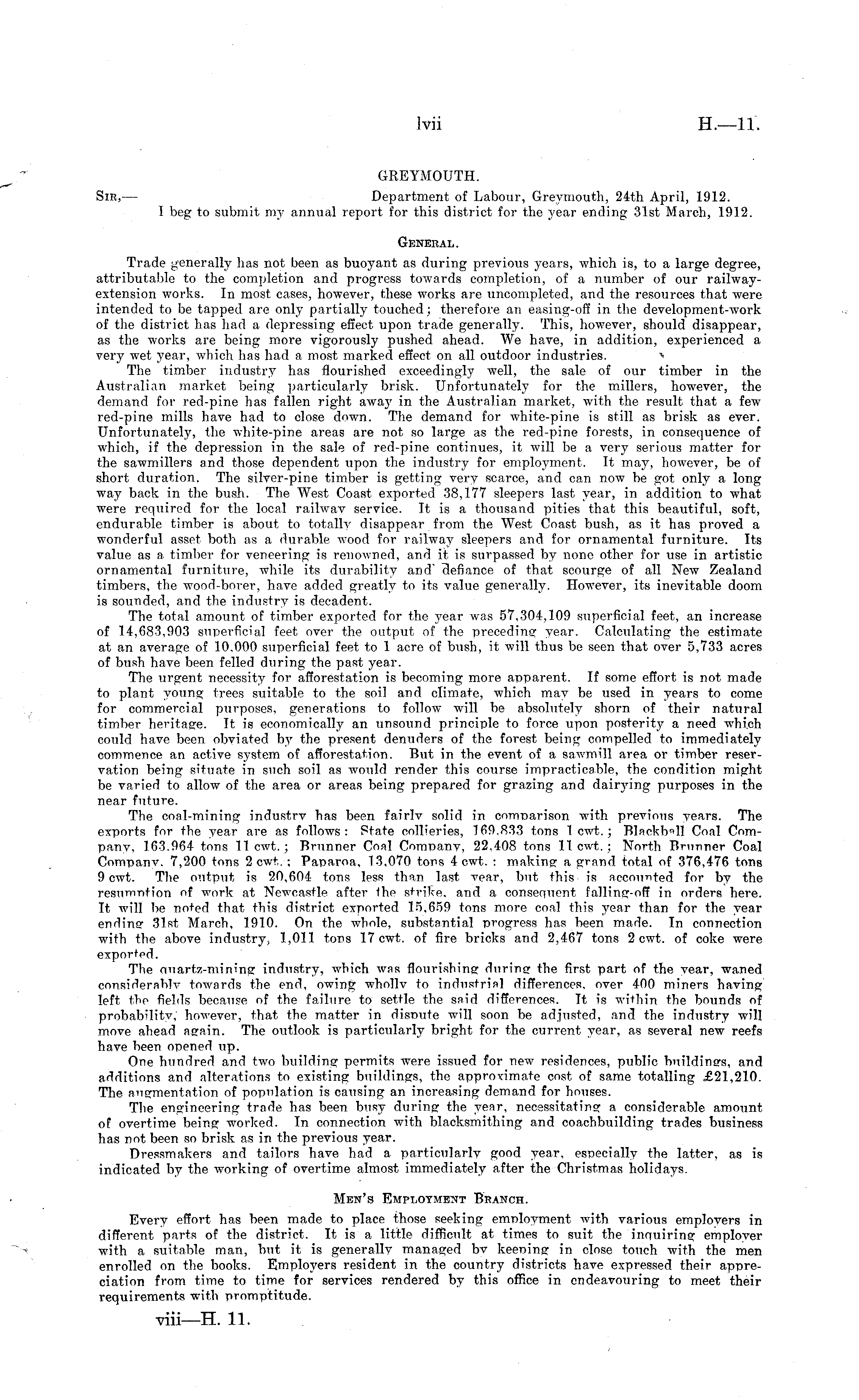 GREYMOUTH. Sir, — Department of Labour, Greymouth, 24th April, 1912. I beg to submit my annual report for this district for the year ending 31st March, 1912. General. Trade generally has not been as buoyant as during previous years, which is, to a large degree, attributable to the completion and progress towards completion, of a number of our railwayextension works. In most cases, however, these works are uncompleted, and the resources that were intended to be tapped are only partially touched; therefore an easing-off in the development-work of the district has had a depressing effect upon trade generally. This, however, should disappear, as the works are being more vigorously pushed ahead. We have, in addition, experienced a very wet year, which has had a most marked effect on all outdoor industries. ■» The timber industry has flourished exceedingly well, the sale of our timber in the Australian market being particularly brisk. Unfortunately for the millers, however, the demand for red-pine has fallen right away in the Australian market, with the result that a few red-pine mills have had to close down. The demand for w-hite-pine is still as brisk as ever. Unfortunately, the white-pine areas are not so large as the red-pine forests, in consequence of which, if the depression in the sale of red-pine continues, it will be a very serious matter for the sawmillers and those dependent upon the industry for employment. It may, however, be of short duration. The silver-pine timber is getting very scarce, and can now be got only a long way back in the bush. The West Coast exported 38,177 sleepers last year, in addition to what were required for the local railway service. It is a thousand pities that this beautiful, soft, endurable timber is about to totally disappear from the West Coast bush, as it has proved a wonderful asset both as a durable wood for railway sleepers and for ornamental furniture. Its value as a timber for veneering is renowned, and it is surpassed by none other for use in artistic ornamental furniture, while its durability and" clefiance of that scourge of all New Zealand timbers, the wood-borer, have added greatly to its value generally. However, its inevitable doom is sounded, and the industry is decadent. The total amount of timber exported for the year was 57,304,109 superficial feet, an increase of 14,683,903 superficial feet over the output of the preceding year. Calculating the estimate at an average of 10,000 superficial feet to 1 acre of bush, it will thus be seen that over 5,733 acres of bush have been felled dtiring the past year. The urgent necessity for afforestation is becoming more apparent. If some effort is not made to plant young trees suitable to the soil and climate, which may be used in years to come for commercial purposes, generations to follow will be absolutely shorn of their natural timber heritage. It is economically an unsound principle to force upon posterity a need which could have been obviated by the present denuders of the forest being compelled to immediately commence an active system of afforestation. But in the event of a sawmill area or timber reservation being situate in such soil as would render this course impracticable, the condition might be varied to allow of the area or areas being prepared for grazing and dairying purposes in the near future. The coal-mining industry has been fairly solid in comparison with previous years. The exports for the year are as follows: State collieries, 169.833 tons 1 cwt.; Blackball Coal Company, 163.964 tons 11 cwt.; Brunner Coal Company, 22,408 tons 11 cwt.; North Brunner Coal Company. 7,200 tons 2 cwt. ; Paparoa, 13,070 tons 4 cwt. : making a grand total of 376,476 tons 9 cwt. The output is 20,604 tons less than last year, but this is accounted for by the resumrttion of work at New-castle after the strike, and a consequent falling-off in orders here. It will be noted that this district exported 15,659 tons more coal this year than for the year ending 31st March, 1910. On the whole, substantial progress has been made. In connection with the above industry, 1,011 tons 17 cwt. of fire bricks and 2,467 tons 2 cwt. of coke were exported. The onartz-mim'ng industry, which was flourishing during the first part of the year, waned considerable- towards the end, owing wholly to industrial differences, over 400 miners having left the fields because of the failure to settle the said differences. It is w-ithin the bounds of probability, how-ever, that the matter in dispute will soon be adjusted, and the industry will move ahead again. The outlook is particularly bright for the current year, as several new reefs have been opened up. One hundred and two building permits were issued for new residences, public buildings, and additions and alterations to existing buildings, the approximate cost of same totalling £21,210. The augmentation of population is causing an increasing demand for houses. The engineering trade has been busy during the year, necessitating a considerable amount of overtime being worked. In connection with blacksmithing and coachbuilding trades business has not been so brisk as in the previous year. Dressmakers and tailors have had a particularly good year, especially the latter, as is indicated by the working of overtime almost immediately after the Christmas holidays. Men's Employment Branch. Every effort has been made to place those seeking employment with various employers in different parts of the district. It is a little difficult at times to suit the inquiring employer w-ith a suitable man, but it is generally managed by keening in close touch with the men enrolled on the books. Employers resident in the country districts have expressed their appreciation from time to time for services rendered by this office in endeavouring to meet their requirements with promptitude.