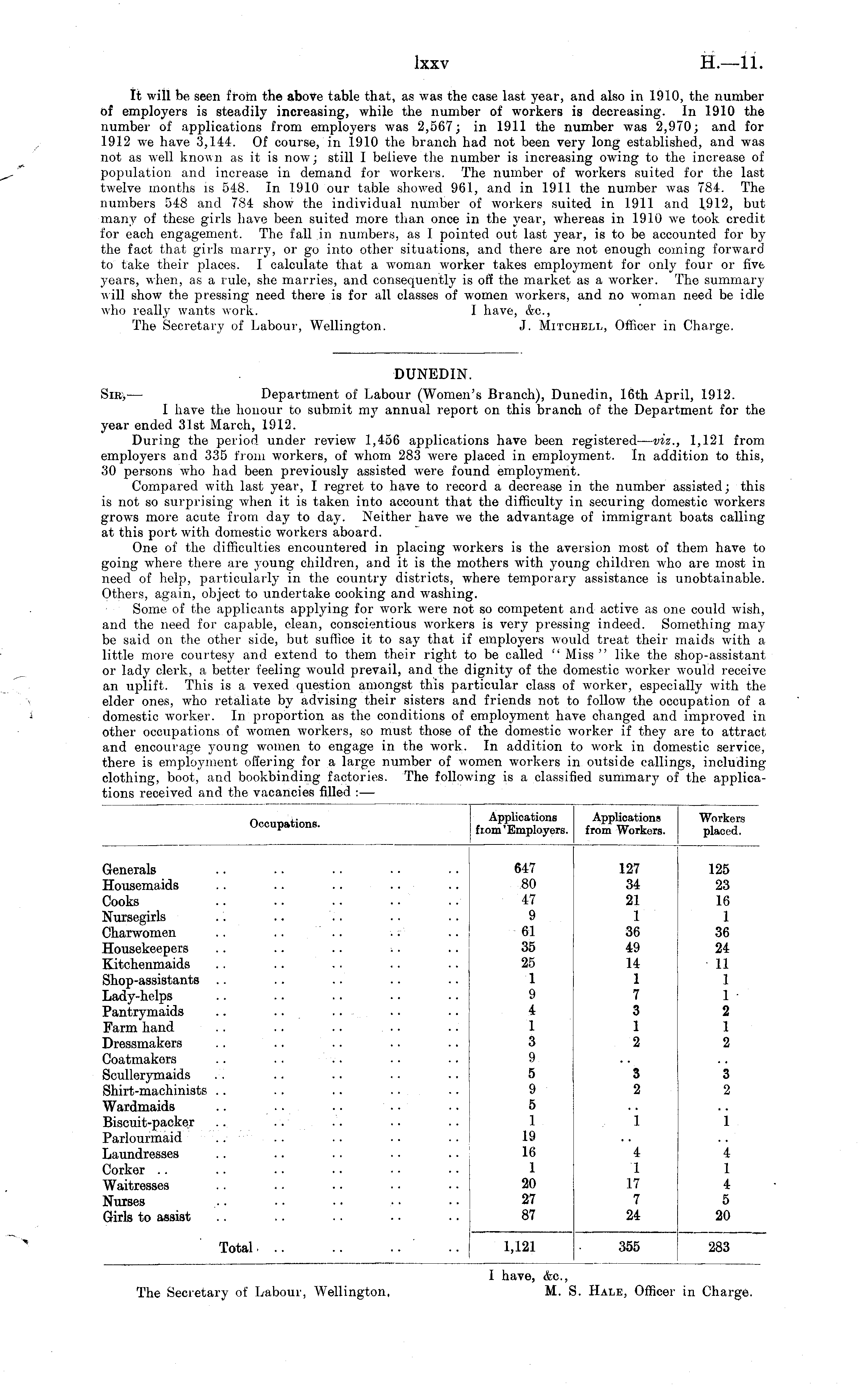 DUNEDIN. Sir, — Department of Labour (Women's Branch), Dunedin, 16th April, 1912. I have the honour to submit my annual report on this branch of the Department for the year ended 31st March, 1912. During the period under review 1,456 applications have been registered — viz., 1,121 from employers and 335 from workers, of whom 283 were placed in employment. In addition to this, 30 persons who had been previously assisted were found employment. Compared with last year, I regret to have to record a decrease in the number assisted; this is not so surprising when it is taken into account that the difficulty in securing domestic workers grows more acute from day to day. Neither have we the advantage of immigrant boats calling at this port with domestic workers aboard. One of the difficulties encountered in placing w-orkers is the aversion most of them have to going where there are young children, and it is the mothers with young children who are most in need of help, particularly in the country districts, where temporary assistance is unobtainable. Others, again, object to undertake cooking and washing. Some of the applicants applying for work were not so competent and active as one could wish, and the need for capable, clean, conscientious w-orkers is very pressing indeed. Something may be said on the other side, but suffice it to say that if employers would treat their maids with a little more courtesy and extend to them their right to be called " Miss " like the shop-assistant or lady clerk, a better feeling would prevail, and the dignity of the domestic w-orker would receive an uplift. This is a vexed question amongst this particular class of worker, especially with the elder ones, w-ho retaliate by advising their sisters and friends not to follow the occupation of a domestic worker. In proportion as the conditions of employment have changed and improved in other occupations of women workers, so must those of the domestic worker if they are to attract and encourage young women to engage in the work. In addition to work in domestic service, there is employment offering for a large number of women workers in outside callings, including clothing, boot, and bookbinding factories. The following is a classified summary of the applications received and the vacancies filled :—