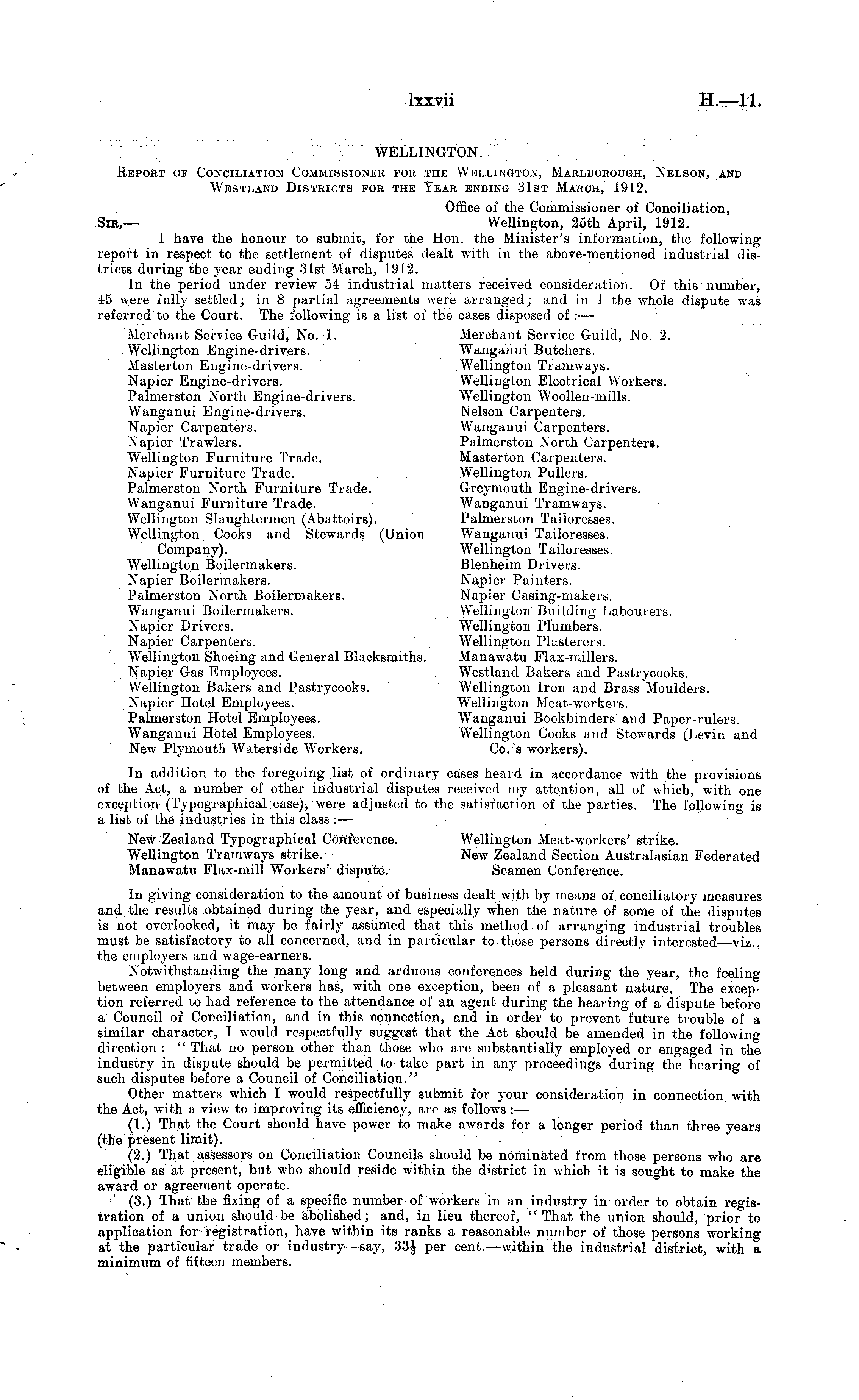 WELLINGTON. Report op Conciliation Commissioner for the Wellington, Marlborough, Nelson, and Westland Districts for the Year ending 31st March, 1912. Office of the Commissioner of Conciliation, Sm,— Wellington, 25th April, 1912. I have the honour to submit, for the Hon. the Minister's information, the following report in respect to the settlement of disputes dealt with in the above-mentioned industrial districts during the year ending 31st March, 1912. In the period under review 54 industrial matters received consideration. Of this number, 45 were fully settled; in 8 partial agreements were arranged; and in 1 the whole dispute was referred to the Court. The following is a list of the cases disposed of : — Merchant Service Guild, No. 1. Merchant Service Guild, No. 2. Wellington Engine-drivers. Wanganui Butchers. Masterton Engine-drivers. Wellington Tramways. Napier Engine-drivers. Wellington Electrical Workers. Palmerston North Engine-drivers. Wellington Woollen-mills. Wanganui Engine-drivers. Nelson Carpenters. Napier Carpenters. Wanganui Carpenters. Napier Trawlers. Palmerston North Carpenters. Wellington Furniture Trade. Masterton Carpenters. Napier Furniture Trade. Wellington Pullers. Palmerston North Furniture Trade. Greymouth Engine-drivers. Wanganui Furniture Trade. Wanganui Tramways. Wellington Slaughtermen (Abattoirs). Palmerston Tailoresses. Wellington Cooks and Stewards (Union Wanganui Tailoresses. Company). Wellington Tailoresses. Wellington Boilermakers. Blenheim Drivers. Napier Boilermakers. Napier Painters. Palmerston North Boilermakers. Napier Casing-makers. Wanganui Boilermakers. Wellington Building Labourers. Napier Drivers. Wellington Plumbers. Napier Carpenters. Wellington Plasterers. Wellington Shoeing and General Blacksmiths. Manawatu Flax-millers. Napier Gas Employees. . Westland Bakers and Pastrycooks. Wellington Bakers and Pastrycooks. Wellington Iron and Brass Moulders. Napier Hotel Employees. Wellington Meat-workers. Palmerston Hotel Employees. Wanganui Bookbinders and Paper-rulers. Wanganui Hotel Employees. Wellington Cooks and Stewards (Levin and New Plymouth Waterside Workers. Co.'s workers). In addition to the foregoing list of ordinary cases heard in accordance with the provisions of the Act, a number of other industrial disputes received my attention, all of which, with one exception (Typographical case), were adjusted to the satisfaction of the parties. The following is a list of the industries in this class :— 1 New Zealand Typographical Conference. Wellington Meat-workers' strike. Wellington Tramways strike. New Zealand Section Australasian Federated Manawatu Flax-mill Workers' dispute. Seamen Conference. In giving consideration to the amount of business dealt with by means of. conciliatory measures and the results obtained during the year, and especially when the nature of some of the disputes is not overlooked, it may be fairly assumed that this method of arranging industrial troubles must be satisfactory to all concerned, and in particular to those persons directly interested—viz., the employers and wage-earners. Notwithstanding the many long and arduous conferences held during the year, the feeling between employers and workers has, with one exception, been of a pleasant nature. The exception referred to had reference to the attendance of an agent during the hearing of a dispute before a Council of Conciliation, and in this connection, and in order to prevent future trouble of a similar character, I would respectfully suggest that the Act should be amended in the following direction : " That no person other than those who are substantially employed or engaged in the industry in dispute should be permitted to take part in any proceedings during the hearing of such disputes before a Council of Conciliation." Other matters which I would respectfully submit for your consideration in connection with the Act, w-ith a view to improving its efficiency, are as follows : — (1.) That the Court should have power to make awards for a longer period than three years (the present limit). (2.) That assessors on Conciliation Councils should be nominated from those persons who are eligible as at present, but who should reside within the district in which it is sought to make the award or agreement operate. (3.) That the fixing of a specific number of workers in an industry in order to obtain registration of a union should be abolished; and, in lieu thereof, " That the union should, prior to application for registration, have within its ranks a reasonable number of those persons working at the particular trade or industry —say, 33J per cent.—within the industrial district, with a minimum of fifteen members.