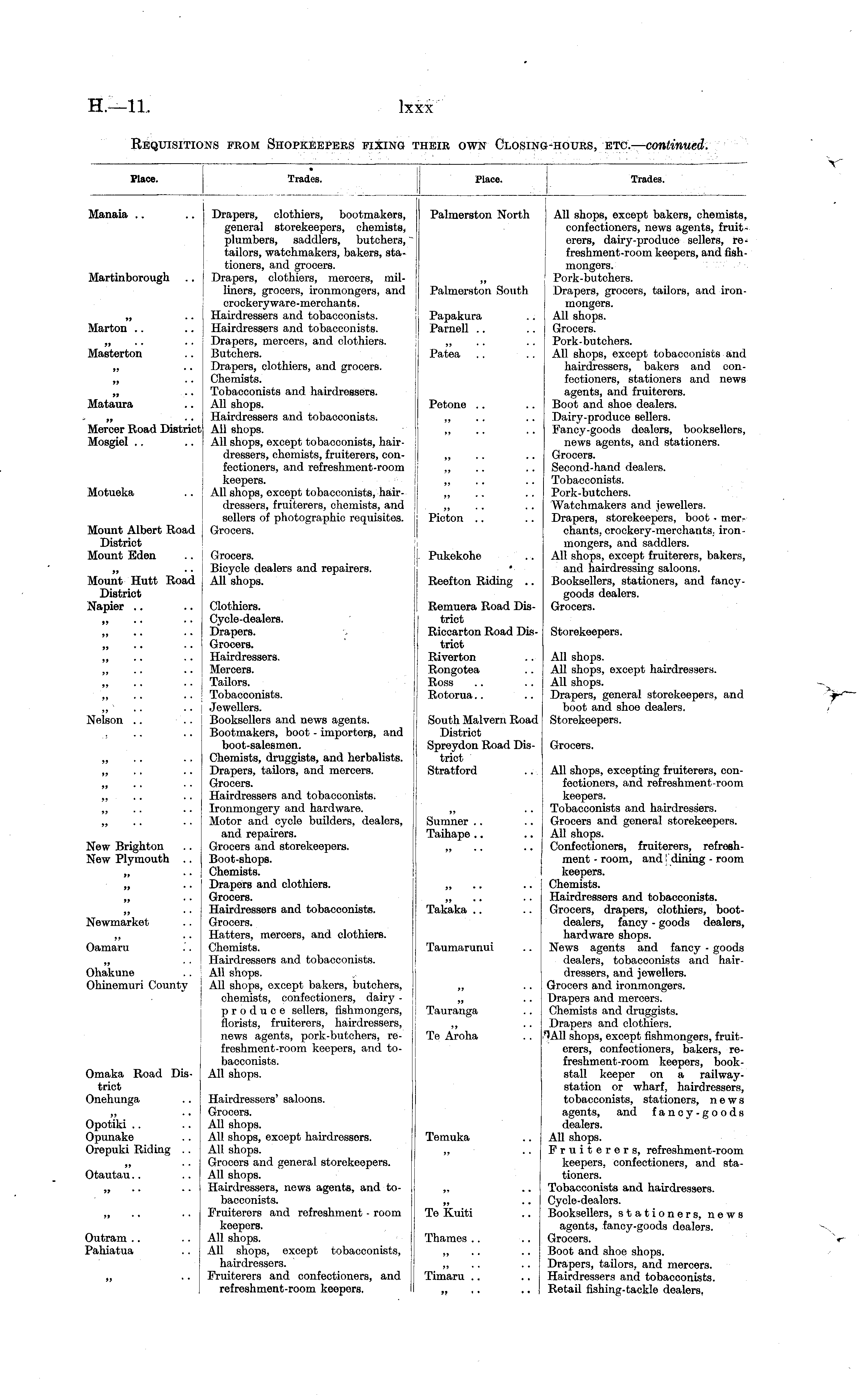 Trades. Place. Place. Trades. Manaia Drapers, clothiers, bootmakers, general storekeepers, chemists, plumbers, saddlers, butchers, tailors, watchmakers, bakers, stationers, and grocers. Drapers, clothiers, mercers, milliners, grocers, ironmongers, and crockery ware- merchants. Hairdressers and tobacconists. Hairdressers and tobacconists. Drapers, mercers, and clothiers. Butchers. Drapers, clothiers, and grocers. Chemists. Tobacconists and hairdressers. All shops. Hairdressers and tobacconists. All shops. All shops, except tobacconists, hairdressers, chemists, fruiterers, confectioners, and refreshment-room keepers. All shops, except tobacconists, hairdressers, fruiterers, chemists, and sellers of photographic requisites. Palmerston North All shops, except bakers, chemists, confectioners, news agents, fruiterers, dairy-produce sellers, re-freshment-room keepers, and fishmongers. ; Pork-butchers. Drapers, grocers, tailors, and ironmongers. All shops. Grocers. Pork-butehers. All shops, except tobacconists and hairdressers, bakers and confectioners, stationers and news agents, and fruiterers. Boot and shoe dealers. Dairy-produce sellers. Fancy-goods dealers, booksellers, news agents, and stationers. Grocers. Second-hand dealers. Tobacconists. Pork-butchers. Watchmakers and jewellers. Drapers, storekeepers, boot - merchants, crockery-merchants, ironmongers, and saddlers. All shops, except fruiterers, bakers, and hairdressing saloons. Booksellers, stationers, and fancygoods dealers. Grocers. Martinborough Palmerston South Marton .. .. I Papakura Parnell Masterton Patea »> • • »» • • Petone Mataura Mereer Road District Mosgiel .. „ Motueka Mount Albert Road District Mount Eden I Picton Grocers. i! Grocers. Bicycle dealers and repairers. All shops. Pukekohe Mount Hutt Road District Napier .. Reef ton Riding .. ,, .. ,, .. ,, .. Nelson .. .. ,, New Brighton New Plymouth .. Clothiers. Cycle-dealers. Drapers. Grocers. Hairdressers. Mercers. Tailors. Tobacconists. Jewellers. Booksellers and news agents. Bootmakers, boot - importers, and boot-salesmen. Chemists, druggists, and herbalists. Drapers, tailors, and mercers. Grocers. Hairdressers and tobacconists. Ironmongery and hardware. Motor and cycle builders, dealers, and repairers. Grocers and storekeepers. Boot-shops. Chemists. Drapers and clothiers. Grocers. Hairdressers and tobacconists. Grocers. Hatters, mercers, and clothiers. Chemists. Hairdressers and tobacconists. All shops. All shops, except bakers, butchers, chemists, confectioners, dairy - produce sellers, fishmongers, florists, fruiterers, hairdressers, news agents, pork-butchers, re-freshment-room keepers, and tobacconists. All shops. Remuera Road District Riccarton Road District Riverton Rongotea Ross Rotorua South Malvern Road District Spreydon Road District Stratford Sumner Taihape Storekeepers. All shops. All shops, except hairdressers. All shops. Drapers, general storekeepers, and boot and shoe dealers. Storekeepers. Grocers. All shops, excepting fruiterers, confectioners, and refreshment-room keepers. Tobacconists and hairdressers. Grocers and general storekeepers. All shops. Confectioners, fruiterers, refreshment - room, and i dining - room I keepers. Chemists. Hairdressers and tobacconists. Grocers, drapers, clothiers, bootdealers, fancy - goods dealers, hardware shops. News agents and fancy - goods dealers, tobacconists and hairdressers, and jewellers. Grocers and ironmongers. Drapers and mercers. Chemists and druggists. Drapers and clothiers. f 'All shops, except fishmongers, fruiterers, confectioners, bakers, re-freshment-room keepers, bookstall keeper on a railwaystation or wharf, hairdressers, tobacconists, stationers, news agents, and fancy-goods dealers. All shops. Fruiterers, refreshment-room keepers, confectioners, and stationers. Tobacconists and hairdressers. Cycle-dealers. Booksellers, stationers, news agents, fancy-goods dealers. Grocers. Boot and shoe shops. Drapers, tailors, and mercers. Hairdressers and tobacconists. Retail fishing-tackle dealers. t. • • » ■ • Newmarket Takaka Oamaru Taumarunui Ohakune Ohinemuri County \ » ■ - Tauranga Omaka Road District Onehunga Te Aroha Opotiki Opunake Orepuki Riding .. Hairdressers' saloons. Grocers. All shops. All shops, except hairdressers. All shops. Grocers and general storekeepers. All shops. Hairdressers, news agents, and tobacconists. Fruiterers and refreshment - room keepers. All shops. All shops, except tobacconists, hairdressers. Fruiterers and confectioners, and jl refreshment-room keepers. Temuka Otautau.. ,, . . . . Te Kuiti Outram Pahiatua Thames >> • • Timaru .. » • • . •