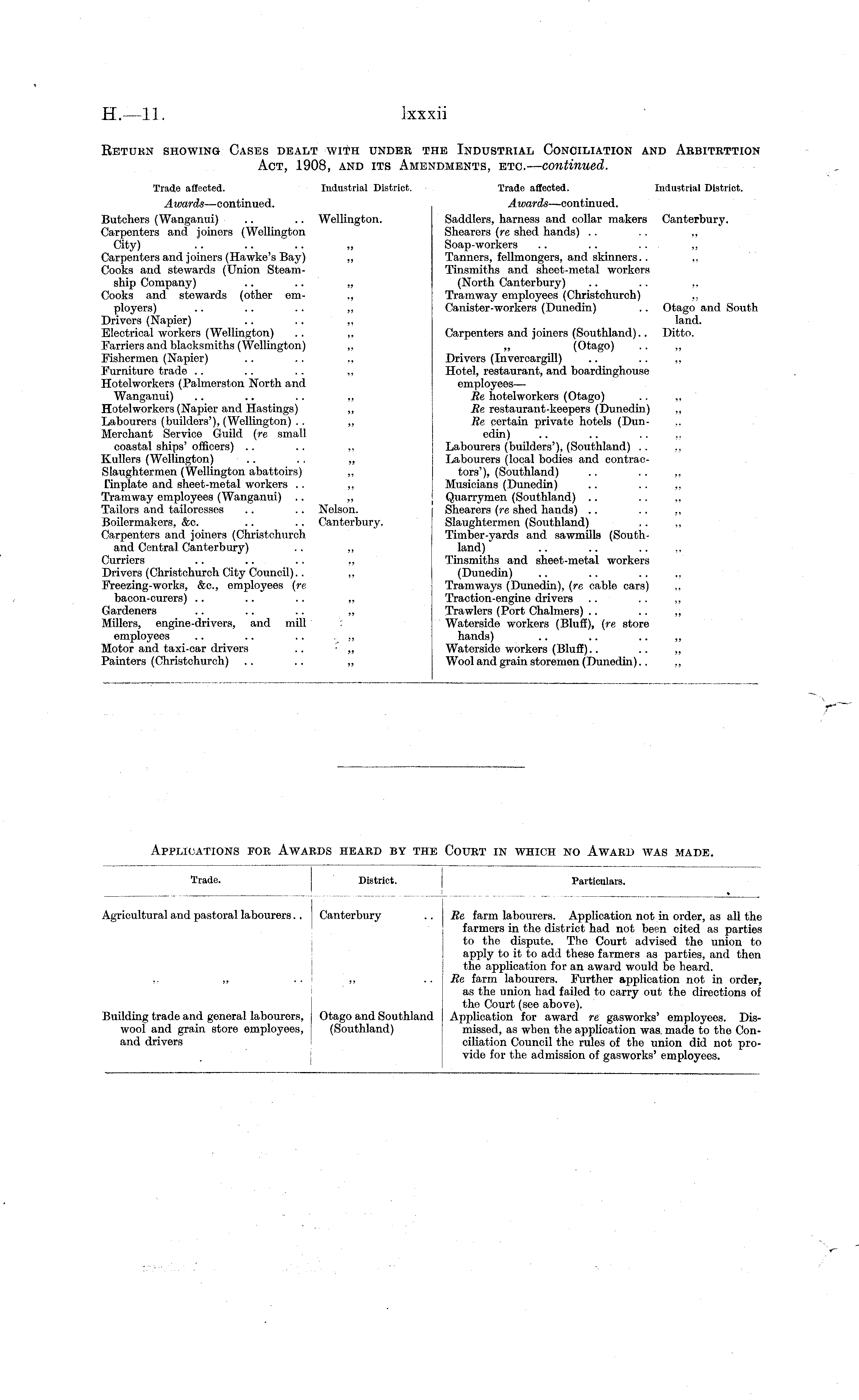 Trade. District. Particulars. Agricultural and pastoral labourers.. Canterbury Be farm labourers. Application not in order, as all the farmers in the district had not been cited as parties to the dispute. The Court advised the union to apply to it to add these farmers as parties, and then the application for an award would be heard. Be farm labourers. Further application not in order, as the union had failed to carry out the directions of the Court (see above). Application for award re gasworks' employees. Dismissed, as when the application was. made to the Conciliation Council the rules of the union did not provide for the admission of gasworks' employees. Building trade and general labourers, wool and grain store employees, and drivers Otago and Southland (Southland)