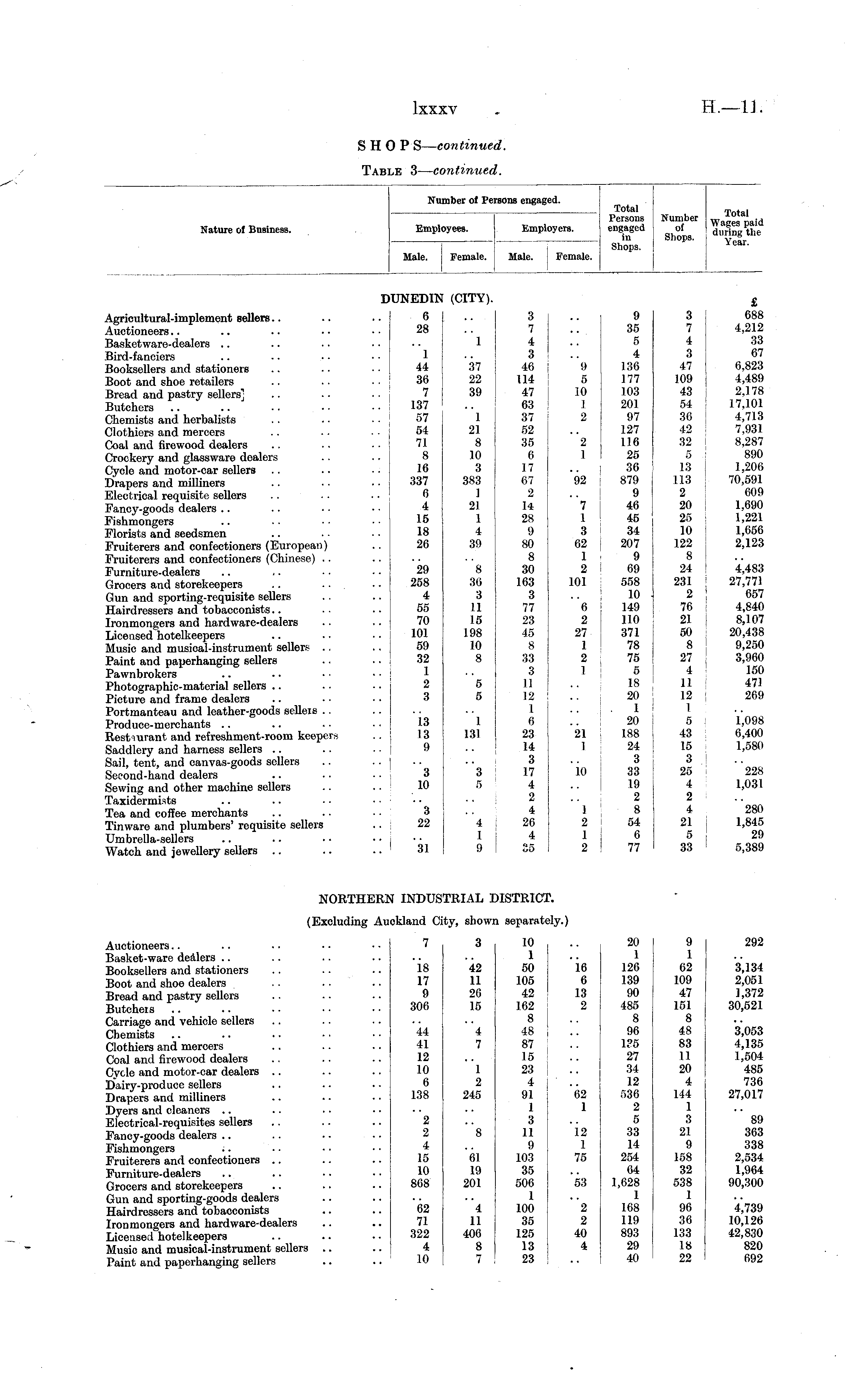 Number of Persons engaged. Total Nature of Business. Employees. Employers. Persons engaged in Number of Shops. Wages paid during the Male. Female. Male. Female. Shops. ; •UNEDIN (CITY). 9 35 5 4 136 177 103 201 97 127 116 25 36 879 9 46 45 34 207 9 69 558 10 ■ 149 110 371 78 75 5 18 20 ; 1 20 188 - 24 3 33 : 19 2 8 54 6 77 3 7 4 3 47 109 43 54 1 36 42 32 ' 5 ; 13 j 113 2 20 25 : 10 : 122 8 24 1 231 2 76 : 21 I 50 8 27 4 11 12 j I 5 43 15 3 25 4 2 4 21 5 I 33 £ 688 4,212 33 67 6,823 4,489 2,178 17,101 4,713 7,931 8,287 890 1,206 70,591 609 1,690 1,221 1,656 2,123 4,483 27,771 657 4,840 8,107 20,438 9,250 3,960 150 471 269 1,098 6,400 1,580 "228 1,031 "280 1,845 29 5,389 Agricultural-implement sellers Auctioneers Basketware-dealers Bird-fanciers Booksellers and stationers Boot and shoe retailers Bread and pastry sellers' Butchers .. .. .. Chemists and herbalists Clothiers and mercers Coal and firewood dealers Crockery and glassware dealers Cycle and motor-car sellers Drapers and milliners Electrical requisite sellers Fancy-goods dealers Fishmongers Florists and seedsmen Fruiterers and confectioners (European) Fruiterers and confectioners (Chinese) Furniture-dealers Grocers and storekeepers .. Gun and sporting-requisite sellers Hairdressers and tobacconists Ironmongers and hardware-dealers Licensed hotelkeepers Music and musical-instrument sellers Paint and paperhanging sellers Pawnbrokers Photographic-material sellers Picture and frame dealers Portmanteau and leather-goods sellers Produce-merchants .. Restmrant and refreshment-room keepers Saddlery and harness sellers Sail, tent, and canvas-goods sellers Second-hand dealers Sewing and other machine sellers Taxidermists Tea and coffee merchants Tinware and plumbers' requisite sellers Umbrella-sellers .. .. • • Watch and jewellery sellers 6 .. 3 28 7 14 1 .. 3 44 37 46 36 22 114 7 39 47 137 .. 63 57 1 37 54 21 52 71 8 35 8 10 6 16 3 17 337 383 67 6 12, 4 21 14 15 1 28 18 4 9 26 39 80 8 29 8 30 258 36 163 4 3 3 55 II 77 70 15 23 101 198 45 59 10 8 32 8 33 1 .. 3 2 5 11 3 5 12 1 13 1 6 13 131 23 9 .. 14 3 3 3 17 10 5 4 2 3 .. 4 22 4 26 1 } 4 I 31 9 I 35 9 5 10 1 2 2 1 92 "7 1 3 62 1 2 101 6 2 27 1 2 1 21 1 10 1 2 1 2 NORTHERS ST INDUSTRIAL DISTRICT. (Excluding Au< ickland City, shown separately.) 20 1 126 139 90 485 8 96 135 27 34 12 536 2 5 33 14 254 64 1,628 1 168 119 893 29 40 9 1 62 109 47 151 8 48 83 11 20 4 144 1 3 21 9 158 32 538 1 96 36 133 18 22 292 3,134 2,051 1,372 30,521 3,053 4,135 1,504 485 736 27,017 89 363 338 2,534 1,964 90,300 4,739 10,126 42,830 820 692 Auctioneers Basket-ware detllers Booksellers and stationers Boot and shoe dealers Bread and pastry sellers Butchers Carriage and vehicle sellers Chemists Clothiers and mercers Coal and firewood dealers Cycle and motor-car dealers Dairy-produce sellers Drapers and milliners Dyers and cleaners Electrical-requisites sellers Fancy-goods dealers Fishmongers Fruiterers and confectioners Furniture-dealers Grocers and storekeepers Gun and sporting-goods dealers Hairdressers and tobacconists Ironmongers and hardware-dealers Licensed hotelkeepers Music and musical-instrument sellers Paint and paperhanging sellers .. 7 3 10 .... 1 , 18 42 50 17 11 105 9 26 42 306 15 162 8 44 4 48 I . 41 7 87 12 .. 15 1 , 10 1 23 6 2 4 , 138 245 91 1 2 .. 3 2 8 11 4 .. 9 15 61 103 10 19 35 868 201 506 .... 1 62 4 100 71 11 35 322 406 125 4 8 13 10 7 23 16 6 13 2 62 1 12 1 75 53 "2 2 40 4