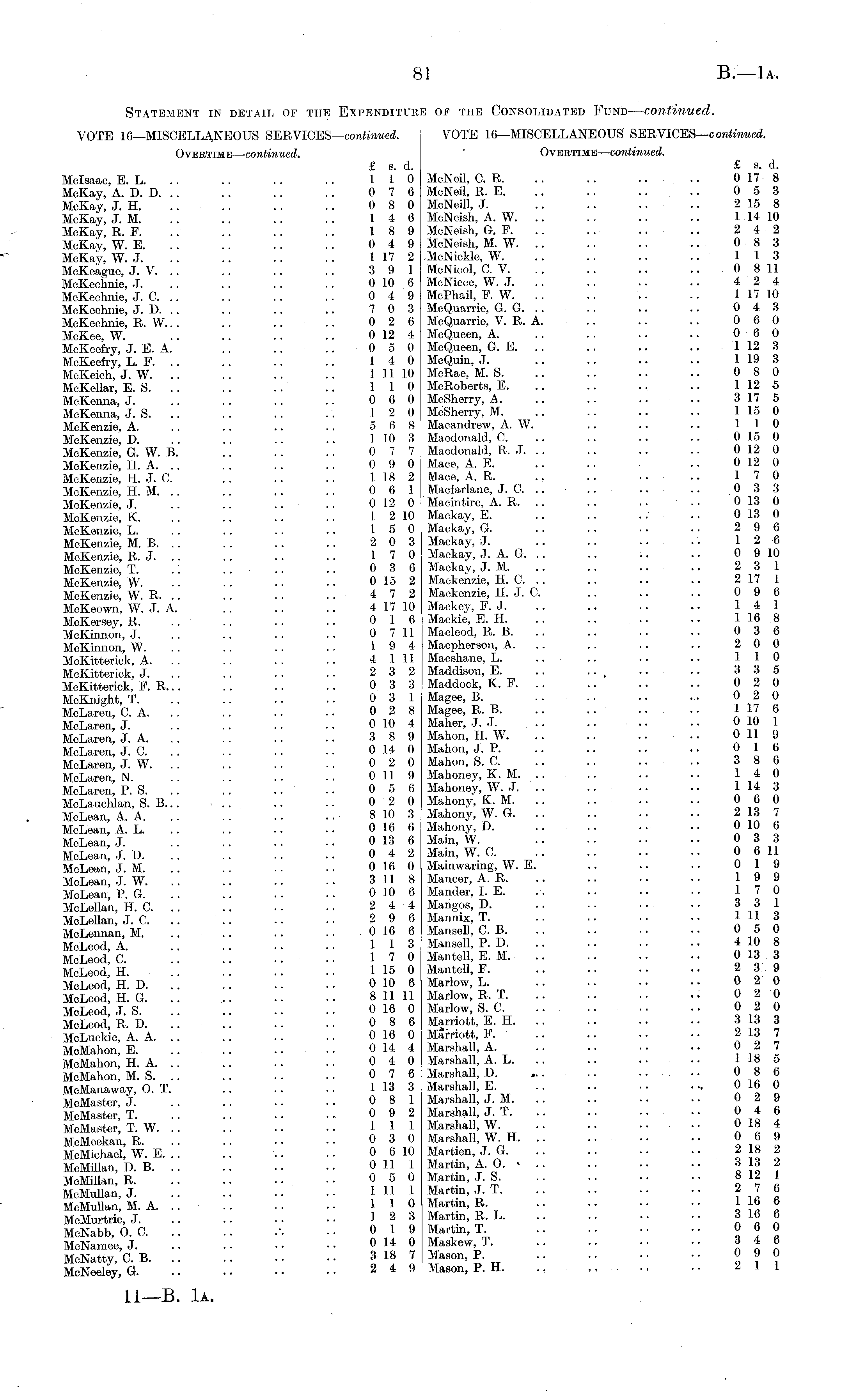 Statement in detail of the Expenditure of the Consolidated Fund — continued. VOTE 16—MISCELLANEOUS SERVlCES—continued. VOTE 16—MISCELLANEOUS SERVICES—c ontinued. Overtime — continued. Ovebtime — continued. £ a d. £ s. d. Mclsaac, E. L. .. .. .. .. 110 McNeil, C. R. .. .. .. .. 017 8 McKay, A. D. D. .. .. .. .. 0 7 6 McNeil, R. E. .. .. .. .. 0 5 3 McKay, J. H. .. .. .. .. 0 8 0 McNeill, J. .. .. .. .. 215 8 McKay, J. M. .. .. .. .. 14 6 McNeish, A. W. .. .. .. .. 114 10 McKay, R. F. . . .. .. .. 18 9 McNeish, G. F. .. .. .. 2 4 2 McKay W. E. . . .. .. 0 4 9 McNeish, M. W. .. .. .. .. 0 8 3 McKay W. J. .. .. .. .. 117 2 McNicklo, W. .. .. .. .. 113 McKeague, J. V. .. .. .. .. 3 9 1 McNiool, C. V. .. .. .. .. 0 811 McKechnie, J. .. .. .. .. 010 6 McNiece, W. J. .. .. .. .. 4 2 4 McKechnie, J. C. .. .. .. .. 0 4 9 McPhail, F. W. .. .. .. .. 117 10 McKechnie, J. D. .. .. .. .. 7 0 3 McQuarrie, G. G. .. .. .. .. 0 4 3 McKechnie, R. W... .. .. .. 0 2 6 McQuarrie, V. R. A. .. .. .. 0 6 0 McKee, W. .. .. .. .. 012 4 McQueen, A. .. .. .. .. 0 6 0 McKeefry, J. E. A. .. .. .. 0 5 0 McQueen, G. E. .. .. .. .. 112 3 McKeefry, L. F. .. . . .. .. 14 0 McQuin, J. .. .. .. .. 119 3 McKeich, J. W. .. .. .. .. 111 10 Mcßae, M. S. .. .. .. .. 0 8 0 McKellar, E. S. .. .. .. .. 110 Mcßoberts, E. .. .. .. .. 112 5 McKenna, J. .. .. .. .. 0 6 0 McSherry, A. .. .. .. .. 317 5 McKenna, J. S. .. .. .. .'. 12 0 McSherry, M. .. .. .. .. 115 0 McKenzie, A. .. .. 5 6 8 Macandrew, A. W. .. .. .. 110 McKenzie, D. .. .. .. .. 110 3 Macdonald, C. .. .. .. .. 015 0 McKenzie, G. W. B. .. .. .. 0 7 7 Macdonald, R. J. .. .. .. .. 012 0 McKenzie, H. A. .. . . .. .. 0 9 0 Mace, A. E. .. .. .. 012 0 McKenzie, H. J. C. . . .. .. 118 2 Mace, A. R. .. .. .. .. 17 0 McKenzie, H. M. .. .. .. .. 0 6 1 Macf arlane, J. C. .. .. .. .. 0 3 3 McKenzie, J. .. .. .. .. 0120 Macintire, A. R. .. .. .. .. 0 13 0 McKenzie, K. .. .. .. .. 1 2 10 Mackay, E. .. .. .. .. 0 13 0 McKenzie, L. .. .. .. .. 15 0 Mackay, G. .. .. .. .. 2 9 6 McKenzie, M. B. .. .. .. .. 2 0 3 Mackay, J. .. .. .. .. 12 6 McKenzie, R. J 17 0 Mackay, J. A. G 0 9 10 McKenzie, T. .. . . .. .. 0 3 6 Mackay, J. M. .. .. .. .. 2 3 1 McKenzie, W. .. . . .. .. 0 15 2 Mackenzie, H. O ___._. .. .. .. 2 17 1 McKenzie, W. R. . . . . .. .. 4 7 2 Mackenzie, H. J. C. .. .. .. 0 9 6 McKeown, W. J. A. .. .. .. 417 10 Mackey, F. J. .. .. .. .. 14 1 McKersey, R. .. .. . . .. 0 1 6 I Mackie, E. H. .. .. .. .. 116 8 McKinnon, J. .. .. .. 0 711 Macleod, R. B. .. .. .. .. 0 3 6 McKinnon, W. .. .. . . .. 19 4 Macpherson, A. .. .. .. 2 0 0 McKitterick, A. .. .. .. .. 4 111 Macshane, L. .. .. .. .. 110 McKitterick, J. .. . . .. .. 2 3 2 Maddison, E. .. ... .. .. 335 McKitterick, F. R... .. .. .. 0 3 3 Maddock, K. F. .. .. .. .. 0 2 0 McKnight, T. .. .. .. .. 0 3 1 Magee, B. .. .. .. ... 0 2 0 McLaren, C. A 0 2 8 Magee, R. B 1 17 6 McLaren, J 0 10 4 Maher, J. J 0 10 1 McLaren, J. A 3 8 9 Mahon, H. W 0 11 9 McLaren, J. C 0 14 0 Mahon, J. P 0 16 McLaren, J. W. .. .. .. • • 02 0 Mahon, S. C. .. .. .. .. 3 8 6 McLaren, N. .. .. .. .. 0 11 9 Mahoney, K. M. .. .. .. .. 14 0 McLaren, P. S. .. .. .. .. 0 5 6 Mahoney, W. J. .. .. • • • • 1 14 3 McLauchlan, S. 8... 0 2 0 Mahony, K. M 0 6 0 McLean, A. A 8 10 3 Mahony, W. G 2 13 7 McLean, A. L 0 16 6 Mahony, D 0 10 6 McLean, J 0 13 6 Main, W. 0 3 3 McLean, J. D 0 4 2 Main, W. C 0 6 11 McLean, J. M 0 16 0 Mainwaring, W. E. 0 19 McLean, J. W 3 11 8 Mancer, A. R 19 9 McLean, P. G 010 6 Mander, I. E. , 17 0 McLellan, H. C. .. .. .. .. 2 4 4 Mangos, D. .. .. .. .. 3 3 1 McLellan, J. C .. .. 296 Mannix, T. 1 11 3 McLennan, M 0 16 6 Mansell, C. B 0 5 0 McLeod, A 113 Mansell, P. D 4 10 8 McLeod C 17 0 Mantell, E. M 0 13 3 McLeod, H 1 15 0 Mantell, F 2 3.9 McLeod, H. D 0 10 6 Marlow, L 0 2 0 McLeod, H. G 8 1111 Marlow, R. T : 0 2 0 McLeod, J. S 0 16 0 Marlow, S. C 0 2 0 McLeod, R. D 0 8 6 Marriott, E. H 3 13 3 McLuckie, A. A 0 16 0 Marriott, F 2 13 7 McMahon, E. .. .. .. .. 014 4 Marshall, A. .. .. •• •■ 02 7 McMahon, H. A. .. .. .. •. 0 4 0 Marshall, A. L. .. .. .. .. flB 5 McMahon, M. S 0 7 6 Marshall, D. 0 8 6 McManaway, O. T. 1 13 3 Marshall, E 0 16 0 McMaster, J 0 8 1 Marshall, J. M 0 2 9 McMaster, T 0 9 2 Marshall, J. T 2 ,£ ? McMaster, T. W 11l Marshall, W 0 18 4 McMeekan, R 0 3 0 Marshall, W.H 0 6 9 McMichael, W. E .. 0 6 10 Martien, J. G 2 18 2 McMillan, D. B. .. .. .. •• 011 1 Martin, A. O. ■ .. .. •• •• 313 2 McMillan, R 0 5 0 Martin, J. S 8 12 1 McMuUan, J 11l 1 Martin, J. T 27 6 McMullan, M. A 110 Martin, R 1 16 6 McMurtrie, J 12 3 Martin, R. L 3 16 6 McNabb, O. C •• •• 0 19 Martin, T 0 6 0 McNamee, J 0 14 0 Maskew, T 3 4 6 McNatty,C.B 318 7 Mason, P 0 9 0 McNeeley, G 2 4 9 Mason, P. H 2 11