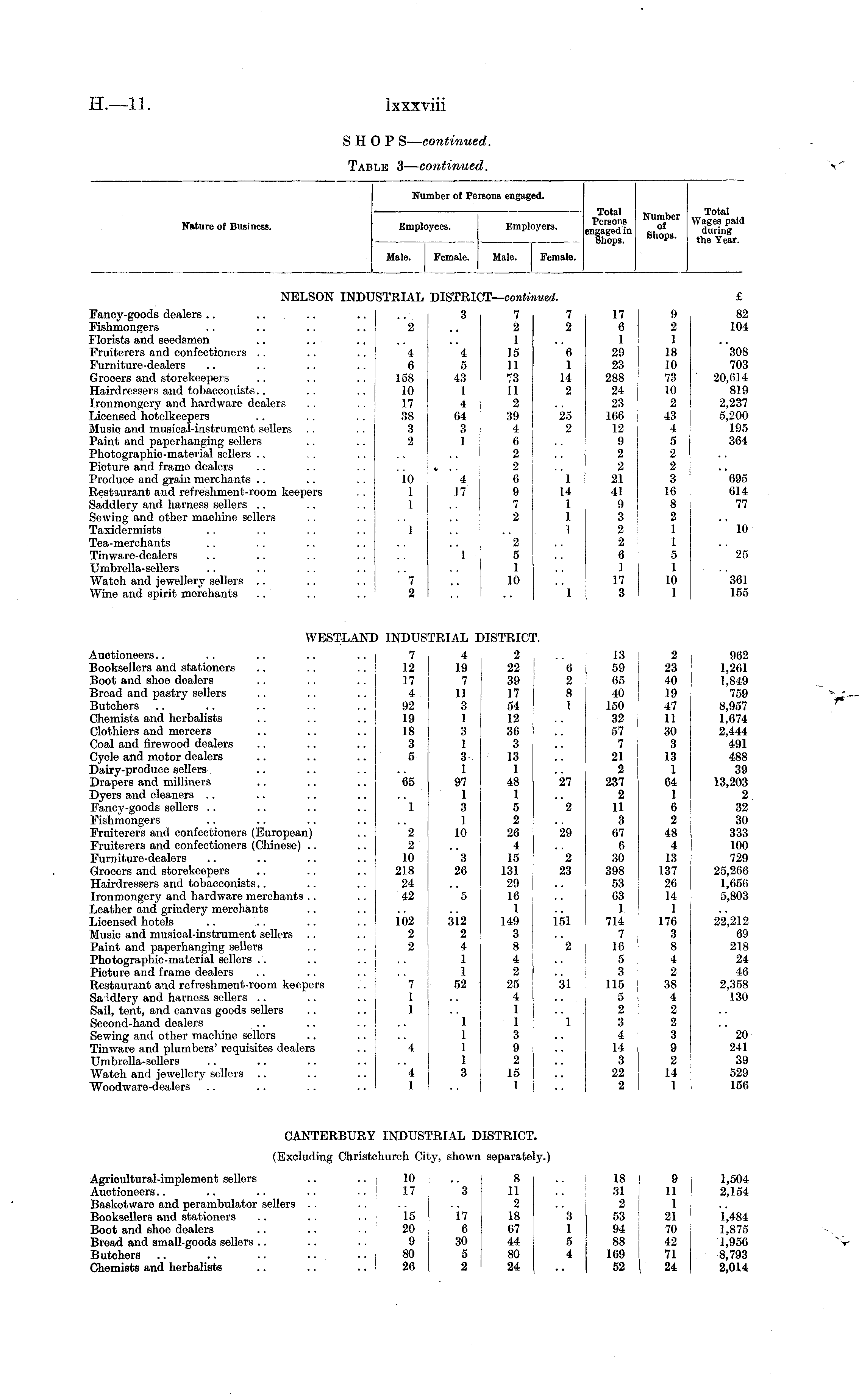 Nature of Business. Employees. Number of Persons engaged. ms engaged. " Perils Number ~ n 8h 0f s Male. Female. Total Wages paid during the Year. Male. Female. NELSON INDUSTRIAL DISTRK oT—conti7 med. £ Fancy-goods dealers .. .. j ... Fishmongers .. .. .. .. 2 Florists and seedsmen .. .. Fruiterers and confectioners .. .. .. 4 Furniture-dealers .. .. .. .. 6 Grocers and storekeepers .. .. .. 158 Hairdressers and tobacconists.. .. .. 10 Ironmongery and hardware dealers .. .. : 17 Licensed hotelkeepers .. .. .. 1 38 Music and musical-instrument sellers . . . . 3 Paint and paperhanging sellers .. .. 2 Photographic-material sellers Picture and frame dealers Produce and grain merchants .. .. . . 10 Restaurant and refreshment-room keepers . . 1 Saddlery and harness sellers .. .. .. 1 Sewing and other machine sellers Taxidermists .. .. .. .. I Tea-merchants Tinware-dealers Umbrella-sellers Watch and jewellery sellers .. .. .. 7 Wine and spirit merchants .. .. .. 2 3 4 5 43 1 4 64 3 1 7 2 1 15 11 73 11 2 39 4 6 2 2 6 9 7 2 7 2 6 1 14 2 25 2 7 2 "6 1 14 2 25 2 1 14 1 1 1 1 17 6 1 29 23 288 24 23 166 12 9 2 2 21 41 9 3 2 2 6 1 17 3 9 2 1 18 10 73 10 2 43 4 5 2 2 3 16 8 2 1 1 5 1 10 1 82 104 308 703 20,614 819 2,237 5,200 195 364 ■ ■ 4 17 1 14 1 1 1 695 614 77 2 5 1 10 10 1 25 1 361 155 WESTLAND INDUS 1 TRIAL 1 MSTRICT 1 : 6 2 8 I 27 2 29 2 23 151 "2 31 1 13 59 65 40 150 32 57 7 21 2 237 2 11 3 67 6 30 398 53 63 1 714 7 16 5 I 3 I 115 j 5 2 3 4 14 3 22 2 2 23 40 19 47 11 30 3 13 1 64 1 6 2 48 4 13 137 26 14 1 176 3 8 4 2 38 4 2 2 3 9 2 14 1 Auctioneers.. .. .. .. .. 7 Booksellers and stationers .. .. .. 12 Boot and shoe dealers .. .. .. 17 Bread and pastry sellers .. .. .. 4 Butchers .. .. .. .. .. 92 Chemists and herbalists .. .. .. 19 Clothiers and mercers .. .. .. 18 Coal and firewood dealers .. .. .. 3 Cycle and motor dealers .. .. .. 5 Dairy-produce sellers Drapers and milliners .. .. .. 65 Dyers and cleaners Fancy-goods sellers .. .. .. .. 1 Fishmongers Fruiterers and confectioners (European) .. 2 Fruiterers and confectioners (Chinese) .. .. 2 Furniture-dealers .. .. .. .. 10 Grocers and storekeepers .. .. .. 218 Hairdressers and tobacconists.. .. .. 24 Ironmongery and hardware merchants .. .. 42 Leather and grindery merchants Licensed hotels .. .. .. .. 102 Music and musical-instrument sellers .. .. 2 Paint and paperhanging sellers .. .. 2 Photographic-material sellers Picture and frame dealers Restaurant and refreshment-room keepers . . 7 Saidlery and harness sellers .. .. .. 1 Sail, tent, and canvas goods sellers .. .. 1 Second-hand dealers Sewing and other machine sellers Tinware and plumbers' requisites dealers .. 4 Umbrella-sellers Watch and jewellery sellers .. .. .. 4 Woodware-dealers .. .. .. .. 1 4 19 7 11 3 1 3 1 3 1 97 1 3 1 10 3 26 2 22 39 17 54 12 36 3 13 1 48 1 5 2 26 4 15 131 29 16 1 149 3 8 4 2 25 4 1 1 3 9 2 15 I 6 2 8 I 27 2 29 2 23 962 1,261 1,849 759 8,957 1,674 2,444 491 488 39 13,203 2 32 30 333 100 729 25,266 1,656 5,803 "5 312 2 4 1 1 52 151 22,212 69 218 24 46 2,358 130 "2 31 1 1 1 1 3 1 20 241 39 529 156 CANTERBURY INDUS'] ["RIAL I USTRICT ly-) (Excluding Christchurch Cii ty, showr . separate! Agricultural-implement sellers .. .. 1 10 Auctioneers.. .. .. .. .. 17 Basketware and perambulator sellers Booksellers and stationers .. .. .. 15 Boot and shoe dealers .. .. .. 20 Bread and small-goods sellers .. .. .. 9 Butchers .. .. .. .. .. 80 Chemists and herbalists .. .. .. 26 3 17 6 30 5 2 8 11 2 18 67 44 80 24 3 1 5 4 18 31 2 53 94 88 169 52 9 11 1 21 70 42 71 24 1,504 2,154 1,484 1,875 1,956 8,793 2,014