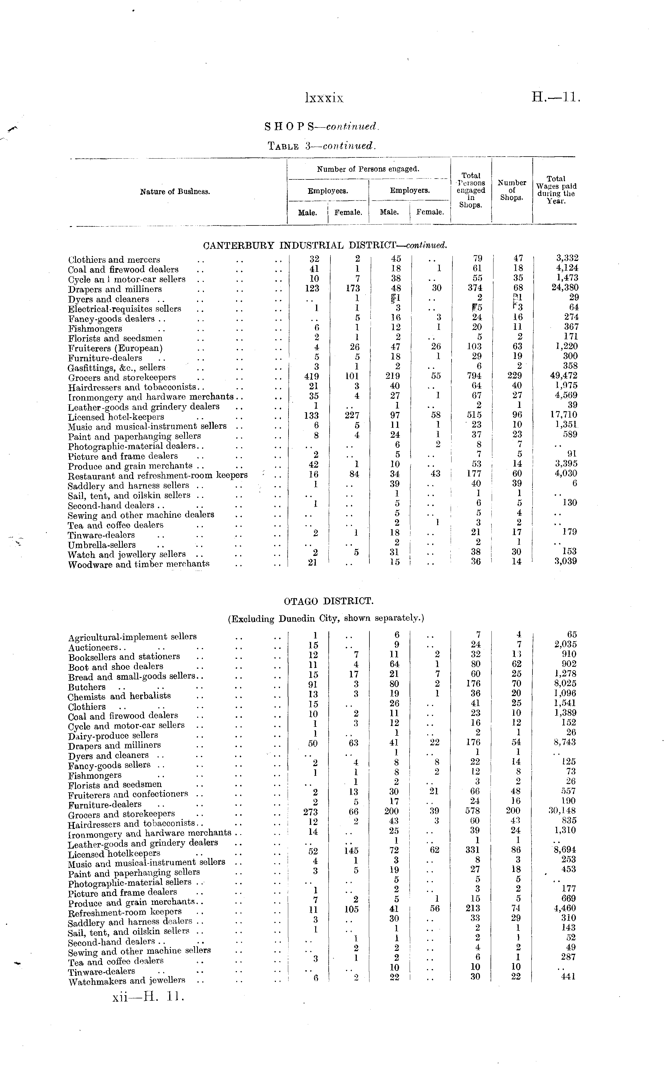 Nature of Business. Number of Pe] Employees. Male, j Female. :sons engaged. Total T t I Persons Number w .„ _ .. aid Employers. engaged of ZingUe _ in Shops. Y " Shops. "*"■ Male. Female. CANTERBURY IN sTDUSTRI AL DISTRICT— continued. Clothiers and mercers Coal and firewood dealers Cycle an I motor-car sellers Drapers and milliners Dyers and cleaners Electrical-requisites sellers Fancy-goods dealers Fishmongers Florists and seedsmen Fruiterers (European) Furniture-dealers Gasfittings, &c, sellers Grocers and storekeepers Hairdressers and tobacconists Ironmongery and hardware merchants Leather-goods and grindery dealers Licensed hotel-keepers Music and musical-instrument sellers Paint and paperhanging sellers Photographic-material dealers Picture and frame dealers Produce and grain merchants .. .. Restaurant and refreshment-room keepers : .. Saddlery and harness sellers Sail, tent, and oilskin sellers Second-hand dealors Sewing and other machine dealers Tea and coffee dealers Tinware-dealers Umbrella-sellers Watch and jewellery sellers Woodware and timber merchants 32 41 10 123 1 6 2 4 5 3 419 21 35 1 133 6 8 2 42 16 1 I 2 2 21 2 45 1 18 1 7 38 173 I 48 30 I f 1 1 3 5 ' 16 3 I 12 : 1 1 2 .. 26 47 ! 26 5 18 ! 1 1 2 1.. 101 219 i 55 3 40 4 27 1 1 227 97 58 5 11 1 4 24 1 6 2 5 1 10 84 34 43 39 1 :: ' I : 2 1 i is : 2 , .. 5 31.. 15 ! .. 79 61 55 374 2 F5 24 20 5 103 29 6 794 64 1 67 2 515 23 37 8 ! 7 : 53 , 177 40 1 6 5 3 21 2 38 36 47 18 35 68 Bl h 16 11 2 63 19 2 229 40 27 1 96 10 23 7 5 14 60 39 1 5 4 2 17 1 30 14 3,332 4,124 1,473 24,380 29 64 274 367 171 1,220 300 358 49,472 1,975 4,569 39 17,710 1,351 589 91 3,395 4,030 6 130 "l79 153 3,039 O 1 1TAGO D dSTRICT. (Excluding Du unedin Cit ty, shown separately.) Agricultural-implement sellers Auctioneers Booksellers and stationers Boot and shoe dealers Bread and small-goods sellers.. Butchers Chemists and herbalists Clothiers Coal and firewood dealers Cycle and motor-car sellers Dairy-produce sellers Drapers and milliners Dyers and cleaners Fancy-goods sellers Fishmongers Florists and seedsmen Fruiterers and confectioners .. .. Furniture-dealers Grocers and storekeepers .. .. Hairdressers and tobacconists.. Ironmongery and hardware merchants .. Leather-goods and grindery dealers Licensed hotelkeepers .. .. Music and musical-instrument sellers .. Paint and paperhanging sellers .. Photographic-material sellers Picture and frame dealers Produce and grain merchants Refreshment-room keepers Saddlery and harness dealers Sail, tent, and oilskin sellers Second-hand dealers Sewing and other machine sellers .. .. j Tea and coffee dealers .. .. • • j Tinware-dealers .. .. • ■ • • ! Watchmakers and jewellers .. 1 15 12 11 15 91 13 15 10 1 1 50 "2 1 2 2 273 12 14 52 4 3 "l 7 II 3 1 "3 "ft 6 9 7 11 2 4 64 1 17 21 7 3 80 2 3 19 1 26 2 11 3 12 1 63 41 22 1 4 8 8 1 8 2 1 2 : .. 13 30 : 21 5 17 .. 66 200 : 39 2 43 ' 3 25 1 145 72 62 1 3 .. 5 19 .. 5 .. 2 .. 2 5 1 105 41 56 30 1 1 1 2 2 .. 1 2 10 .. 2 22 7 24 32 80 60 176 36 41 23 16 2 176 ] 22 12 3 66 24 578 00 39 1 331 8 27 5 3 15 213 33 2 2 4 6 10 30 4 7 1! 62 25 70 20 25 10 12 1 54 1 14 8 2 48 16 200 43 24 1 86 3 18 5 2 5 74 29 1 1 2 1 10 22 4 7 1! 62 25 70 20 25 10 12 1 54 1 14 8 2 48 16 200 43 24 1 86 3 18 5 2 5 74 29 1 1 2 1 10 22 65 2,035 910 902 1,278 8,025 1,096 1,541 1,389 152 26 8,743 125 73 26 557 190 30.148 835 1,310 8,694 253 453 177 669 4,460 310 143 52 49 287 441