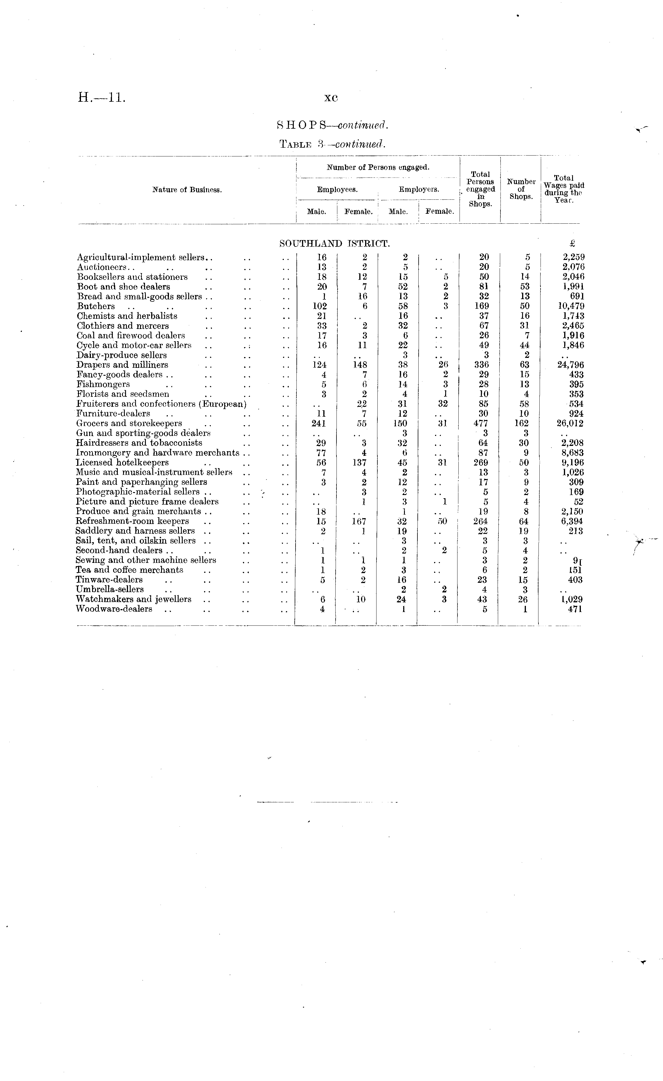 Nature of Business. Number of Pe Employees. Number of Persons engaged. Total rp , , Persons Number „. ' .. Employees. Employers. ., engaged of ! ?„?" K!' : in Shops. aU Y7fr Shops. xeal - Male. 1 Female. Male. Female. :■ ! Male. ! Female. SOUTHLAND ISTRI 1 HLAND ISTRICT. £ Agricultural-implement sellers Auctioneers.. Booksellers and stationers Boot and shoe dealers Bread and small-goods sellers .. Butchers Chemists and herbalists Clothiers and mercers Coal and firewood dealers Cycle and motor-car sellers .. .: Dairy-produce sellers Drapers and milliners Fa,ncy-goods dealers Fishmongers Florists and seedsmen Fruiterers and confectioners (European) Furniture-dealers Grocers and storekeepers Gun and sporting-goods dealers Hairdressers and tobacconists Ironmongery and hardware merchants . . Licensed hotelkeepers Music and musical-instrument sellers .. Paint and paperhanging sellers Photographic-material sellers Picture and picture frame dealers Produce and grain merchants Refreshment-room keepers Saddlery and harness sellers Sail, tent, and oilskin sellers Second-hand dealers Sewing and other machine sellers Tea and coffee merchants Tinware-dealers Umbrella-sellers Watchmakers and jewellers Woodware-dealers 16 2 13 2 18 12 20 7 1 16 102 6 21 33 i 2 17 3 16 11 124 148 4 7 5 (5 3 2 22 11 7 241 55 29 3 77 4 56 137 7 4 3 ; 2 3 1 .18 j 15 ! 167 2 1 1 1 1 1 2 5 2 6 10 4 .. 16 2 2 .. 20 5 1 2,259 13 2 5 .. 20 5 2,076 18 12 15 5 50 14 2,046 20 7 52 2 81 53 1,991 1 16 13 2 32 13 691. 102 6 58 3 169 50 10,479 21 .. 16 .. 37 16 1,743 33 i 2 32 .. 67 31 2,465 17 3 6 . . 26 7 1,916 16 11 22 .. 49 44 1,846 3 3 2 124 148 38 26 336 63 24,796 4 7 16 2 29 15 433 5 fi 14 3 28 13 395 3 2 4 1 10 4 353 22 31 32 85 58 534 11 7 12 30 10 924 241 55 150 31 477 162 20,012 3 3 3 29 3 32 .. 64 30 2,208 77 4 (i .. 87 9 8,683 56 137 45 31 269 50 9,196 7 4 2 .. 13 3 1,026 3!2 12 17 9 309 3 2 .. 5 2 1.69 13 15 4 52 .18 j 1 .. 19 8 2,150 15 ! 167 32 50 : 264 64 6,394 2 I 19 .. 22 19 213 3 .. 3 3 1 .. 2 2 5 4 1 1 1 .. 3 2 9 V 1 2 3 .. 6 2 151 5 2 16 .. 23 ' 15 403 2 2 4 3.. 6 10 24 3 43 : 26 1,029 4 .. 1 .. 5 J 471 1 2 2 10 2 3