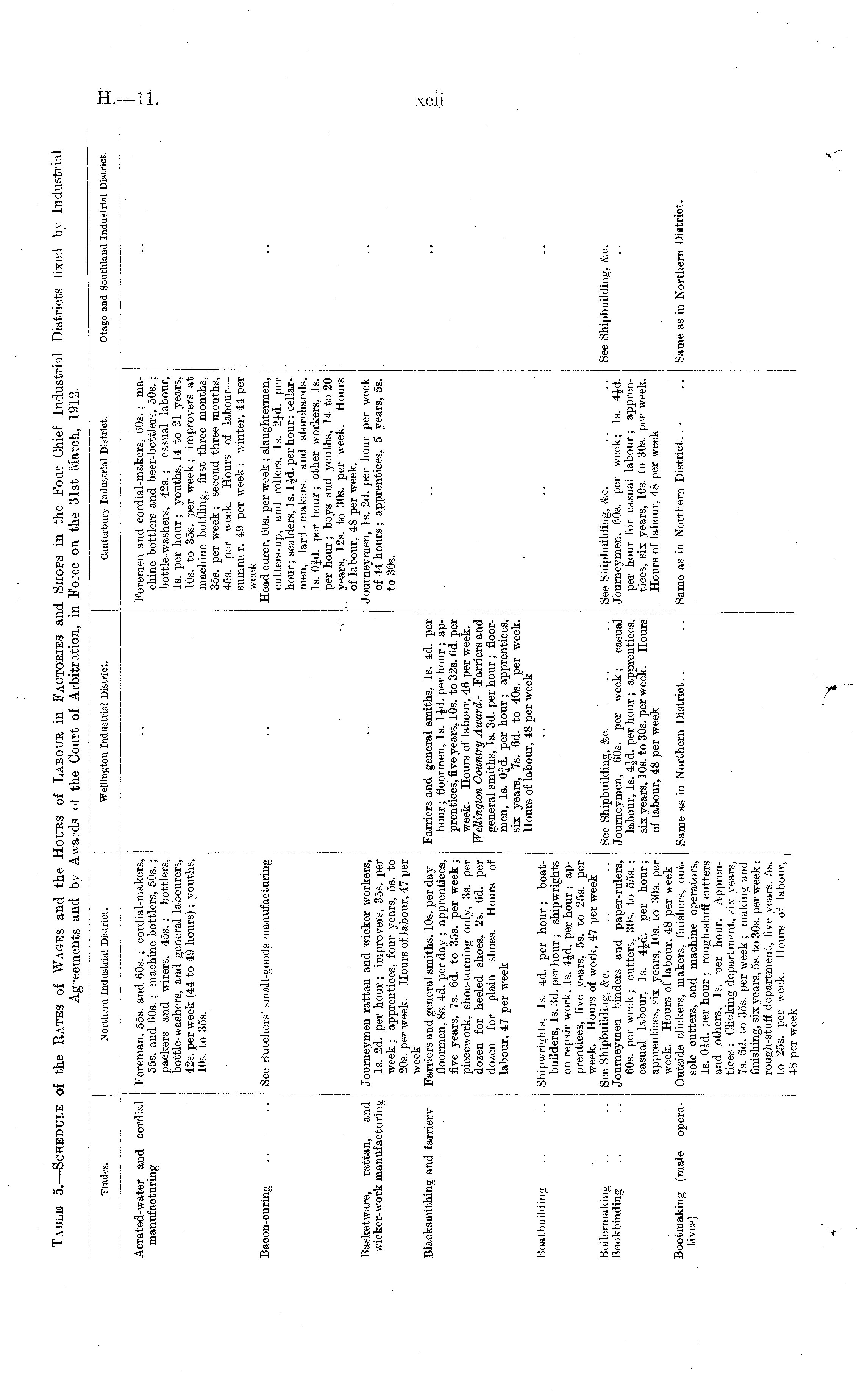 Trades. Northern Industrial District. Wellington Industrial District. Canterbury Industrial District. Otago and Southland Industria Otago and Southland Industrial District. "I I Aerated-water and cordial Foreman, 55s. and 60s. ; cordial-makers, 1 manufacturing 55s. and 00s. ; machine bottlers, 50s. ; | packers and wirers, 45s. ; bottlers, bottle-washers, and general labourers, 42s. per week (44 to 49 hours); youths, 10s. to 35s. Bacon-curing .. .. See Butchers' small-goods manufacturing Foremen and cordial-makers, 60s. ; machine bottlers and beer-bottlers, 50s. ; bottle-washers, 42s. ; casual labour, Is. per hour; youths, 14 to 21 years, 10s. to 35s. per week ; improvers at machine bottling, first three months, 35s. per week ; second three months, 45s. per week. Hours of labour — summer. 49 per week : winter, 44 per week Head curer, 60s. per week ; slaughtermen, cutters-up, and rollers, Is. 2Jd. per hour; soalders, Is. 1 Jd. per hour; cellarmen, lard - makers, and storehands, Is. 0|d. per hour ; other workers, Is. per hour; boys arid youths, 14 to 20 years, 12s. to 30s. per week. Hours of labour, 48 per week. Journeymen, Is. 2d. per hour per week of 44 hours; apprentices, 5 years, 5s. to 30s. I Basketware, rattan, and j Journeymen rattan and wicker workers, j wicker-work manufacturing ! Is. 2d. per hour ; improvers, 35s. per week : apprentices, four years, 5s. to 20s. per week. Hours of labour, 47 per week Blacksmithing and farriery Farriers and general smiths, 10s. per day 1 Farriers and general smiths, Is. 4d. per floormen, 8s. 4d. per day ; apprentices, hour; floormen, Is. 1 Jd. per hour ; apfive years, 7s. 6d. to 35s. per week; prentices, five years, 10s. to 32s. 6d. per piecework, shoe-turning only, 3s. per week. Hours of labour, 46 per week, dozen for heeled shoes, 2s. 6d. per Wellington Country Award. —Farriers and dozen for plain shoes. Hours of general smiths, Is. 3d. per hour; floorlabour, 47 per week men, Is. Ofd. per hour; apprentices, six years, 7s. 6d. to 40s. per week. Hours of labour, 48 per week Boatbuilding .. . . Shipwrights, Is. 4d. per hour; boat- I builders, Is. 3d. per hour ; shipwrights 1 on repair work, Is. 4jd. per hour ; apprentices, five years, 5s. to 25s. per week. Hours of work, 47 per week Boilermaking .. .. See Shipbuilding, &c. .. .. See Shipbuilding, &e. Bookbinding .. . . Journeymen binders and paper-rulers, Journeymen, 60s. per week; casual 60s. per week ; cutters, 30s. to 55s. ; labour, Is. 4|d. per hour ; apprentices, casual labour, Is. 4Jd. per hour; six years, 10s. to 30s. per week. Hours apprentices, six years, 10s. to 30s. per of labour, 48 per week week. Hours of labour, 48 per week Bootmaking (male opera- Outside clickers, makers, finishers, out- Same as in Northern District.. tives) sole cutters, and machine operators, j Is. OJd. per hour; rough-stuff cutters and others, Is. per hour. Apprentices : Clicking department, six years, 7s. 6d. to 35s. per week; making and finishing, six years, 5s. to 30s. per week; rough-stuff department, five years, 5s. to 25s. per week. Hours of labour, . 48 per week See Shipbuilding, &c. .. .. See Shipbuilding, &c. Journeymen, 60s. per week; Is. 4|d. per hour for casual labour; apprentices, six years, 10s. to 30s. per week. Hours of labour, 48 per week Same as in Northern District.. - .. Same as in Northern District.