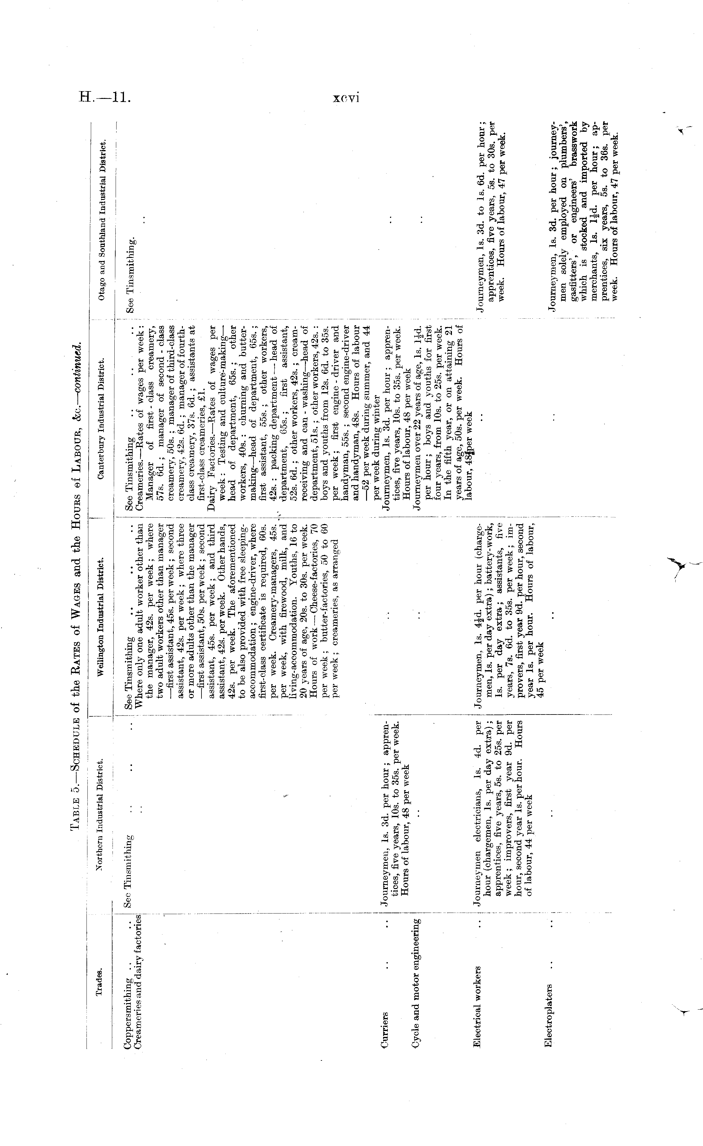 Trades. Northern Industrial District. Wellington Industrial District. Canterbury Industrial District. Otago and Southland Industrial District. Trades. Wellington Industrial District. Canterbury Industrial District. Otago and Southland Industrial District. Coppersmithing .. ._. J See Tinsmithing .. .. .. : See Tinsmithing .. .. .. See Tinsmithing .. .. .. See Tinsmithing. Creameries and dairy factories: .. Where only one adult worker other than Creameries. —Rates of wages per week : the manager, 42s. per week; where Manager of first - class creamery, two adult workers other than manager 57s. 6d. ; manager of second - class —first assistant, 45s. per week ; second creamery, 50s. ; manager of third-class assistant, 42s. per week ; where three creamery, 42s. 6d. ; manager of fourthor more adults other than the manager class creamery, 37s. 6d. ; assistants at —first assistant, 50s. per week ; second first-class creameries, £1. assistant, 45s. per week; and third Dairy Factories. —-Rates of wages per assistant, 42S. per week. Other hands, week : Testing and culture-making — ■ 42s. per week. The aforementioned head of department, 65s. ; other to be also provided with free sleeping- workers, 40s. : churning and butteraccommodation ; engine-driver, where i making —head of department, 65s. ; first-class certificate is required, 60s. 1 first assistant, 55s. ; other workers, per week. Creamery-managers, 45s. j . 42s. : packing department — head of h, per week, with firewood, milk, and T department, 65s. ; first assistant, living-accommodation. Youths, 16 to i 52s. 6d. ; other workers, 42s. ; cream20 years of age, 20s. to 30s. per week. I receiving and can - washing —head of Hours of work — Cheese-factories, 70 \ department, 51s. ; other workers, 42s. : per week ; butter-factories, 50 to 60 1 boys and youths from 12s. 6d. to 35s. per week ; creameries, as arranged per week ; first engine - driver and handyman, 55s.; second engine-driver and handyman, 48s. Hours of labour — 52 per week during summer, and 44 per week during winter Curriers .. .. Journeymen, Is. 3d. per hour; appren- .. Journeymen, Is. 3d. per hour; apprentices, five years, 10s. to 35s. per week. tices, five years, 10s. to 35s. per week. Hours of labour, 48 per week Hours of labour, 48 per week Cycle and motor engineering .. .. Journeymen over 22 years of age, Is. IJd. per hour; boys and youths for first four years, from 10s. to 25s. per week. In the fifth year, or on attaining 21 years of age, 50s. per week. Hours of labour, 48|per week Electrical workers .. | Journeymen electricians, Is. 4d. per Journeymen, Is. 4Jd. per hour (charge- .. Journeymen, Is. 3d. to Is. 6d per hour • hour (chargemen, Is. per day extra); men, Is. per day extra); battery-work, apprentices, five years, 5s. to 30s. per apprentices, five years, 5s. to 25s. per Is. per day extra; assistants, five week. Hours of labour, 47 per week, week; improvers, first year 9d. per years, 7s. 6d. to 35s. per week ; imhour, second year Is. per hour. Hours provers, first year 9d. per hour, second of labour, 44 per week year Is. per hour. Hours of labour, 1 45 per week Electroplate™ • ■ • •' - • .. . . Journeymen, Is. 3d. per hour j journeymen solely employed on plumbers', gasfitters', or engineers' brasswork which is stocked and imported by merchants, Is. IJd. per hour; apprentices, six years, 5s. to 36s. per '• week. Hours of labour, 47 per week.