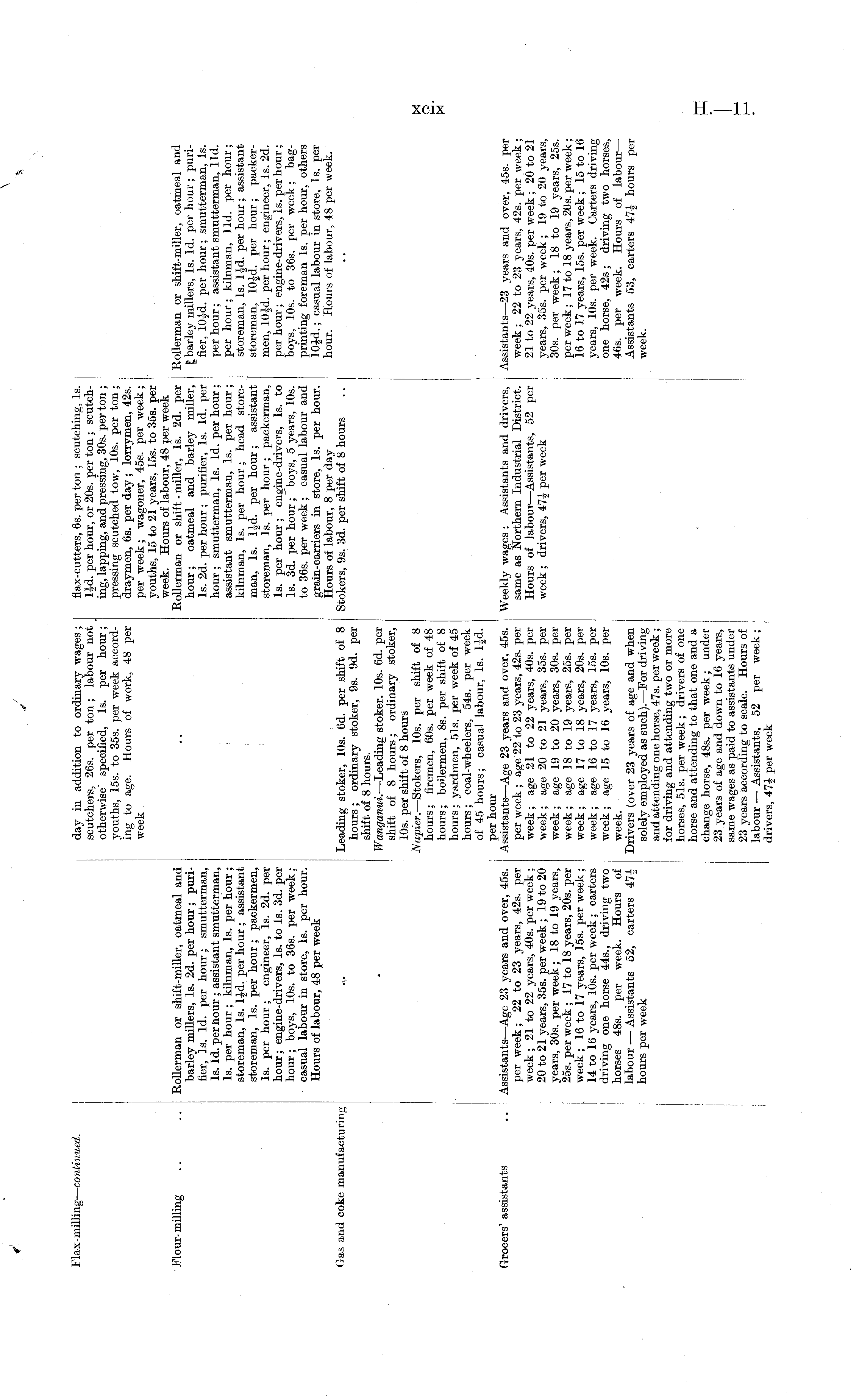 is lax-milling — continued. lax-mil day in addition to ordinarj 7 wages; scutchers, 26s. per ton; labour not otherwise' specified, Is. per hour; youths, 15s. to 35s. per week according to age. Hours of work, 48 per week flax-cutters, 6s. per ton ; scutching, Is. IJd. per hour, or 20s. per ton ; scutching, lapping, and pressing, 30s. per ton ; pressing scutched tow, 10s. per ton ; draymen, 6s. per day; lorrymen, 42s. per week; wagoner, 45s. per week; youths, 15 to 21 years, 15s. to 35s. per week. Hours of labour, 48 per week Rollerman or shift - miller, Is. 2d. per hour; oatmeal and barley miller, Is. 2d. per hour; purifier, Is. Id. per hour ; smutterman, Is. Id. per hour ; assistant smutterman, Is. per hour; kilnman, Is. per hour; head storeman, Is. IJd. per hour; assistant storeman, Is. per hour; packerman, Is. per hour; engine-drivers, Is. to Is. 3d. per hour; boys, 5 years, 10s. to 36s. per week; casual labour and grain-carriers in store, Is. per hour. Hours of labour, 8 per day Stokers, 9s. 3d. per shift of 8 hours Flour- miUing RoUerman or shift-miUer, oatmeal and barley miUers, Is. 2d. per hour ; purifier, Is. Id. per hour; smutterman, Is. Id. per hour ; assistant smutterman, Is. per hour ; kilnman, Is. per hour ; storeman, Is. IJd. per hour ; assistant storeman, Is. per hour; packermen, Is. per hour; engineer, Is. 2d. per hour; engine-drivers, Is. to Is. 3d. per hour; boys, 10s. to 36s. per week ; casual labour in store, Is. per hour. Hours of labour, 48 per week Rollerman or shift-miller, oatmeal and j*.barley millers, Is. Id. per hour; purifier, lOJd. per hour; smutterman, Is. per hour; assistant smutterman, lid. per hour; kilnman, lid. per hour; storeman, Is. IJd. per hour; assistant storeman, lOJd. per hour; packermen, 10Jd. per hour; engineer, Is. 2d. per hour; engine-drivers, Is. per hour; boys, 10s. to 36s. per week; bagprinting foreman Is. per hour, others lOJd.; casual labour in store, Is. per hour. Hours of labour, 48 per week. Gas and coke manufacturing Grocers' assistants Assistants —Age 23 years and over, 45s. per week; 22 to 23 years, 42s. per week ; 21 to 22 years, 40s. per week ; 20 to 21 years, 35s. per week ; 19 to 20 years, 30s. per week; 18 to 19 years, 25s. per week ; 17 to 18 years, 20s. per week ; 16 to 17 years, 15s. per week ; 14 to 16 years, 10s. per week; carters driving one horse 44s., driving two horses 48s. per week. Hours of labour ■— ■ Assistants 52, carters 47J hours per week Leading stoker, 10s. 6d. per shift of 8 hours; ordinary stoker, 9s. 9d. per shift of 8 hours. Wanganui. —Leading stoker. 10s. 6d. per shift of 8 hours; ordinary stoker, 10s. per shift of 8 hours Napier. —Stokers, 10s. per shift of 8 hours; firemen, 60s. per week of 48 hours; boilermen, 8s. per shift of 8 hours; yardmen, 51s. per week of 45 hours; coal-wheelers, 54s. per week of 45 hours; casual labour, Is. IJd. per hour Assistants —Age 23 years and over. 45s. per week ; age 22 to 23 years, 42s. per week; age 21 to 22 years, 40s. per week; age 20 to 21 years, 35s. per week; age 19 to 20 years, 30s. per week ; age 18 to 19 years, 25s. per week; age 17 to 18 years, 20s. per week; age 16 to 17 years, 15s. per week; age 15 to 16 years, 10s. per week. Drivers (over 23 years of age and when solely employed as such). —For driving and attending one horse, 47s. per week ; for driving and attending two or more horses, 51s. per week; drivers of one horse and attending to that one and a change horse, 48s. per week; under 23 years of age and down to 16 years, same wages as paid to assistants under 23 years according to scale. Hours of labour — Assistants, 52 per week; drivers, 47J per week Weekly wages : Assistants and drivers, same as Northern Industrial District. Hours of labour —Assistants, 52 per week ; drivers, 47J per week Assistants —23 years and over, 45s. per week ; 22 to 23 years, 42s. per week ; 21 to 22 years, 40s. per week ; 20 to 21 years, 35s. per week ; 19 to 20 years, 30s. per week; 18 to 19 years, 25s. per week; 17 to 18 years, 20s. per week; 16 to 17 years, 15s. per week; 15 to 16 years, 10s. per week. Carters driving one horse, 42s; driving two horses, 46s. per week. Hours of labour — Assistants 53, carters 47J hours per week. i