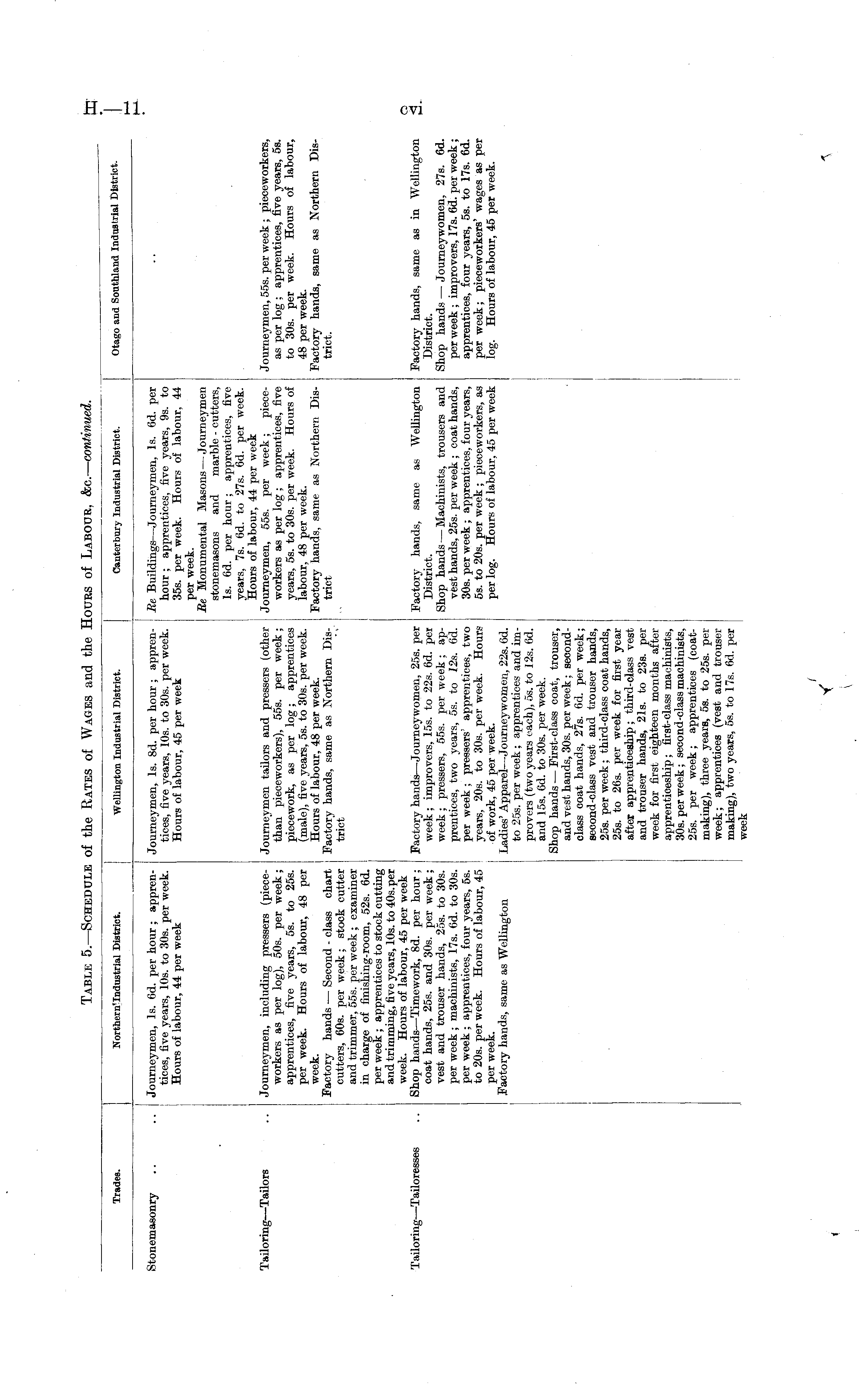 Trades. Northern* Industrial District. Wellington Industrial District. Canterbury Industrial District. Otago and Southland Industrial District. Stonemasonry Journeymen, Is. 6d. per hour ; apprentices, five years, 10s. to 30s. per week. Hours of labour, 44 per week Journeymen, Is. 8d. per hour ; apprentices, five j r ears, 10s. to 30s. per week. Hours of labour, 45 per week Be Buildings —Journeymen, Is. 6d. per hour; apprentices, five years, 9s. to 35s. per week. Hours of labour, 44 per week. Be Monumental Masons — Journeymen stonemasons and marble - cutters, Is. 6d. per hour; apprentices, five years, 7s. 6d. to 27s. 6d. per week. Hours of labour, 44 per week Journeymen, 55s. per week; pieceworkers as per log ; apprentices, five years, 5s. to 30s. per week. Hours of labour, 48 per week. Factory hands, same as Northern District Tailoring —Tailors Journeymen, including pressers (pieceworkers as per log), 50s. per week; apprentices, five years, 5s. to 25s. per week. Hours of labour, 48 per week. Factory hands — Second - class chart cutters, 60s. per week; stock cutter and trimmer, 55s. per week ; examiner in charge of finishing-room, 52s. 6d. per week ; apprentices to stock cutting and trimming, five years, 10s. to 40s. per week. Hours of labour, 45 per week Shop hands —Timework, 8d. per hour ; coat hands, 25s. and 30s. per week ; vest and trouser hands, 25s. to 30s. per week; machinists, 17s. 6d. to 30s. per week ; apprentices, four years, 5s. to 20s. per week. Hours of labour, 45 per week. Factory hands, same as Wellington Journeymen taUors and pressers (other than pieceworkers), 55s. per week; piecework, as per log; apprentices (male), five years, 5s. to 30s. per week. Hours of labour, 48 per week. Factory hands, same as Northern District Journeymen, 55s. per week ; pieceworkers, as per log ; apprentices, five years, 5s. to 30s. per week. Hours of labour, 48 per week. Factory hands, same as Northern District. Tailoring —-Tailoresses Factory hands —Journeywomen, 25s. per week ; improvers, 15s. to 22s. 6d. per week; pressers, 55s. per week; apprentices, two years, 5s. to I2s. 6d. per week; pressers' apprentices, two years, 20s. to 30s. per week. Hours of work, 45 per week. Ladies' Apparel —Journeywomen, 22s. 6d. to 25s. per week; apprentices and improvers (two years each), 5s. to 12s. 6d. and 15s. 6d. to 30s. per week. Shop hands — First-class coat, trouser, and vest hands, 30s. per week; secondclass coat hands, 27s. 6d. per week; second-class vest and trouser hands, 25s. per week; third-class coat hands, 25s. to 26s. per week for first year after apprenticeship; third-class vest and trouser hands, 21s. to 23s. per week for first eighteen months after apprenticeship; first-class machinists, 30s. per week; second-class machinists, 25s. per week; apprentices (coatmaking), three years, 5s. to 25s. per week; apprentices (vest and trouser making), two years, 5s. to 17s. 6d. per week Factory hands, same as WeUington District. Shop hands — Machinists, trousers and vest hands, 25s. per week ; coat hands, 30s. per week ; apprentices, four years, 5s. to 20s. per week ; pieceworkers, as per log. Hours of labour, 45 per week Factory hands, same as in Wellington District. Shop hands — Journeywomen, 27s. 6d. per week ; improvers, 17s. 6d. per week ; apprentices, four years, 5s. to 17s. 6d. per week; pieceworkers' wages as per log. Hours of labour, 45 per week. y i