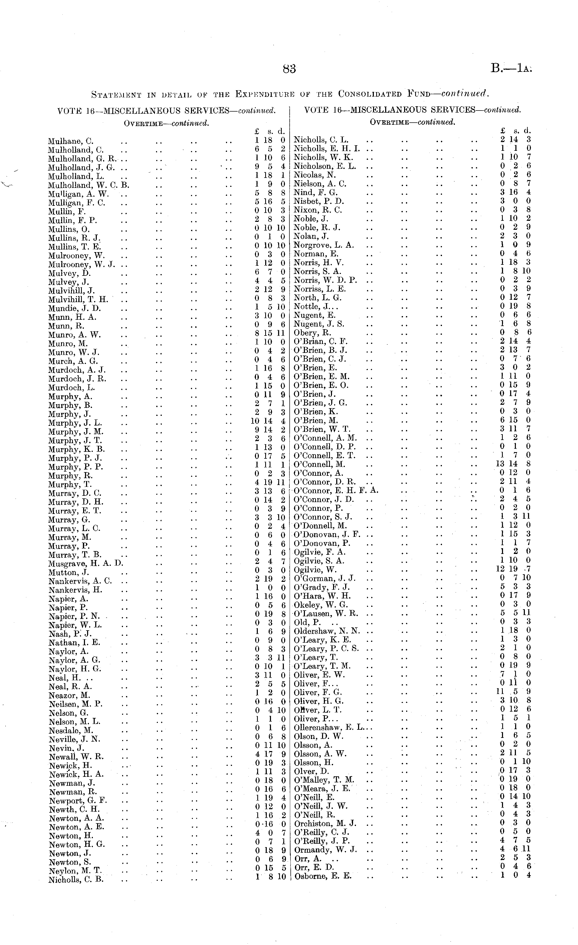Statement in detail of the Expenditure of the Consolidated Fund— continued. VOTE 16— MISCELLANEOUS SERVlCES— continued: VOTE 16—MISCELLANEOUS SERVlCES— continued. Overtime — continued. Overtime — continued. £ a. d. £ s. d. Mulhane, G. .. .. .. .. 118 0 Nicholls, C. L. .. .. .. .. 214 3 Mulholland, C. .. .. .. .. 6 5 2 Nicholls, E. H. I. .. .. .. .. 110 Mulholland, G. R. .. .. .. .. 110 6 Nicholls, W. K. .. .. .. .. 110 7 Mulholland, J. G. .. .. .. •.. 9 5 4 Nicholson, E. L. .. .. .. .. 0 2 6 Mulholland, L. .. .. .. .. 118 1 Nicolas, N. .. .. .. .. 0 2 6 Mulholland, W. C. B. .. .. .. 19 0 Nielson, A. C. ~ .. .. .. 0 8 7 Mulligan A. W. .. .. .. • • 5 8 8 Nind, F. G. .. .. .. .. 316 4 Mulligan P. C . .. ■• ■ ■ 516 5 Nisbet, P. D. .. .. .. .. 3 0 0 Mullin, F. .. .. • • 010 3 Nixon, R. C. .. .. .. .. 0 3 8 Mullin F P.. .. • • 2 8 3 Noble, J. .. .. .. .. 1 10 2 Mullins, O. 010 10 Noble, R. J. .. ~ .. .. 0 2 9 Mullins, R. J. .. .. .. • • 0 10 Nolan, J. .. .. .. .. 2 3 0 Mullins, T. E. .. .. ■■ ■■ 010 10 Norgrove, L. A. .. .. .. .. 10 9 Mulrooney, W. .. .• ■ • 0 3 0 Norman, E. .. .. .. .. 0 4 6 Mulrooney, W. J. .. .. •• • • 112 0 Norris, H. V. .. .. .. .. 118 3 Mulvey D .. .. .. -• 670 Norris, S. A. .. .. .. .. 1 810 Mulvey' J .. .. ■. •• 445 Norris, W. D. P. .. .. .. .. 02 2 Mulvihill, J. .. .. .. • • 212 9 Norriss, L. E. .. .. .. .. 0 3 9 Mulvihill, T. H. .. .. .. • • 0 8 3 North, L. G. .. .. .. .. 012 7 Mundie J. D. .. .. ■• •• 1 5 10 Nottle, J... .. .. .. .. 0 19 8 Munn, H. A 3 10 0 Nugent, E 0 6 6 Munn, R. .. .. •• • ■ 0 9 6 Nugent, J. S. .. .. .. .. 16 8 Munro, A. W 8 15 11 Obery, R. 0 8 6 Munro M .. ■ • • • 1 10 0 O'Brian, C. F. ..... .. .. 2 14 4 Munro' W J .. ■ ■ • • • • 0 4 2 O'Brien, B. J. .. .. .. .. 213 7 Murch'A G .. •• •■ 0 4 6 O'Brien, C. J. .. .. .. .. 076 Murdoch," A.'J 1 16 8 O'Brien, E 3 0 2 Murdoch, J. R 0 4 6 O'Brien, E. M 1 11 0 Murdoch, L 1 15 0 O'Brien, E. O .. .. 0 15 9 Murphy A .- •• ■• 0 11 9 O'Brien, J. .. .. .. .. 0 17 4 Murphy b' 2 7 1 O'Brien, J. G 2 7 9 Murphy' J.' 2 9 3 O'Brien, X 0 3 0 Murphy, J. L 10 14 4 O'Brien, M 6 15 0 Murphy, J. M 9 14 2 O'Brien, W. T 3 11 7 Murphy J T • • ..236 O'Connell, A. M. .. .. .. .. 12b Murphy! K. B 1 13 0 O'Connell, D. P 0 10 Murphy P J ■ 0 17 5 O'Connell, E. T 17 0 Murphy PP 1 11 1 O'Connell, M 13 14 8 Murphy R. 0 2 3 O'Connor, A 0 12 0 Murphy T 419 11 O'Connor, D. R 2 11 4 WurravVc .. ■■ 3 13 6 O'Connor, E. H. F. A 0 16 Murray! D. H 014 2 O'Connor, J. D .'. 24 5 Murray E T •• 0 3 9 O'Connor, P 0 2 0 MurravG 3 3 10 O'Connor, S. J 1 3 11 Murray! XC. '.'. 02 4 O'Donnell, M 112 0 Murray M . • ■■ • • 06 0 O'Donovan, J. F. .. .. .. .. 115 3 Mnrrav P • • ..046 O'Donovan, P. .. . - .. 117 '.'. 0 16 Ogilvie, F. A. .. .. 12 0 Musgrave, H. A. D 2 4 7 OgUvie, S. A 1 0 0 Mutton, J 0 3 0 OgJvie,W 12 19-7 Nankervis, A. C 2 19 2 O'Gorman, J. J 0 7 10 Nankervis H 10 0 O'Orady, F. J 5 3 3 Naoior A •• •• 1 16 0 O'Hara, W. H 0 17 9 Ser'p " 0 5 6 Okeley, W. G 0 3 0 Nap er' P N " 0 19 8 O'Lausen, W. R 5 5 1.1 S'wi " .. •• 03 0 Old,P 03 3 Nash P J 16 9 Oldershaw, N. N 1 18 0 Kin :: ::■■ •• •• o9 0 130 Naylor A 0 8 3 O'Leary, P. C. S 2 10 2° AG 3 3 11 O'Leary, T 0 8 0 NavorHG V. 0 10 1 O'Leary, T. M 0 19 9 Neil H •• •• 3 U 0 Oliver, E.W 7 10 NealßA " 2 5 5 Oliver, F 0 11 0 NeazorM '.'. 12 0 Oliver, P. G 11-5 9 NeQsen M P " 016 0 Oliver, H. G 310 8 Nion,'" ' 0 4 10 Oliver, L.T 0 12 6 Nelson M. L 10 Oliver.P... Nesdale,M ° l 6 O lerenshaw L. L 110 Neville J N ■ • • • • 0 6 8 Olson, D. W. . . .. • • • • 16 5 NevUeJ.N. .. Q Q A 02 Q NewTll W R " 417 9 01sson,A. W. .. 211 5 NewfckH ■• •• 019 3 Ols S on,H 01 10 ShA '■ 111 3 Olver,D. 017 3 Newman J " 0 18 0 O'MaUey, T. M 0 19 0 New San R • • • • 016 6 O'Meara, J. E 018 0 Newport GF '.'. 119 4 O'Neill, E 014 10 NewthCH " •• •■ 0.12.0 O'Neill, J. W 143 N«wton A A ■ ■• 1 16 2 O'Neill, R 0 4 3 New on'A E '.'. '.'. ■■ ■■ 0-16 0 Orchiston, M. J 03 0 NewonH '.. 4 0 7 O'Reilly, C. J 0 5 0 KiO 07 1 O'Reilly, J w P .. 47 5 Newton! J 018 9 Ormandy, W. J. .. .. .. 46 11 SllVc.B. I: 1 810 Osborne,E.E 104