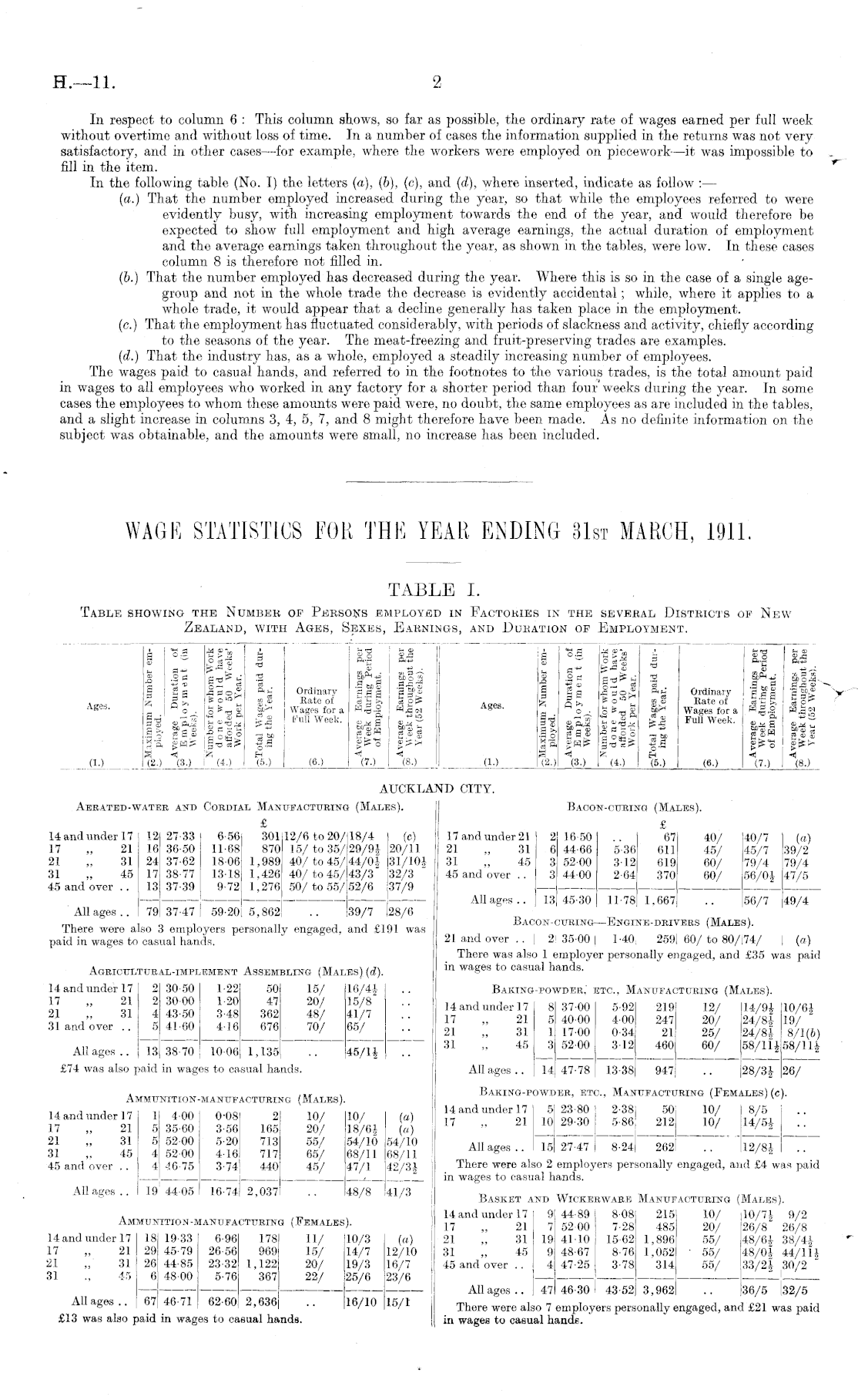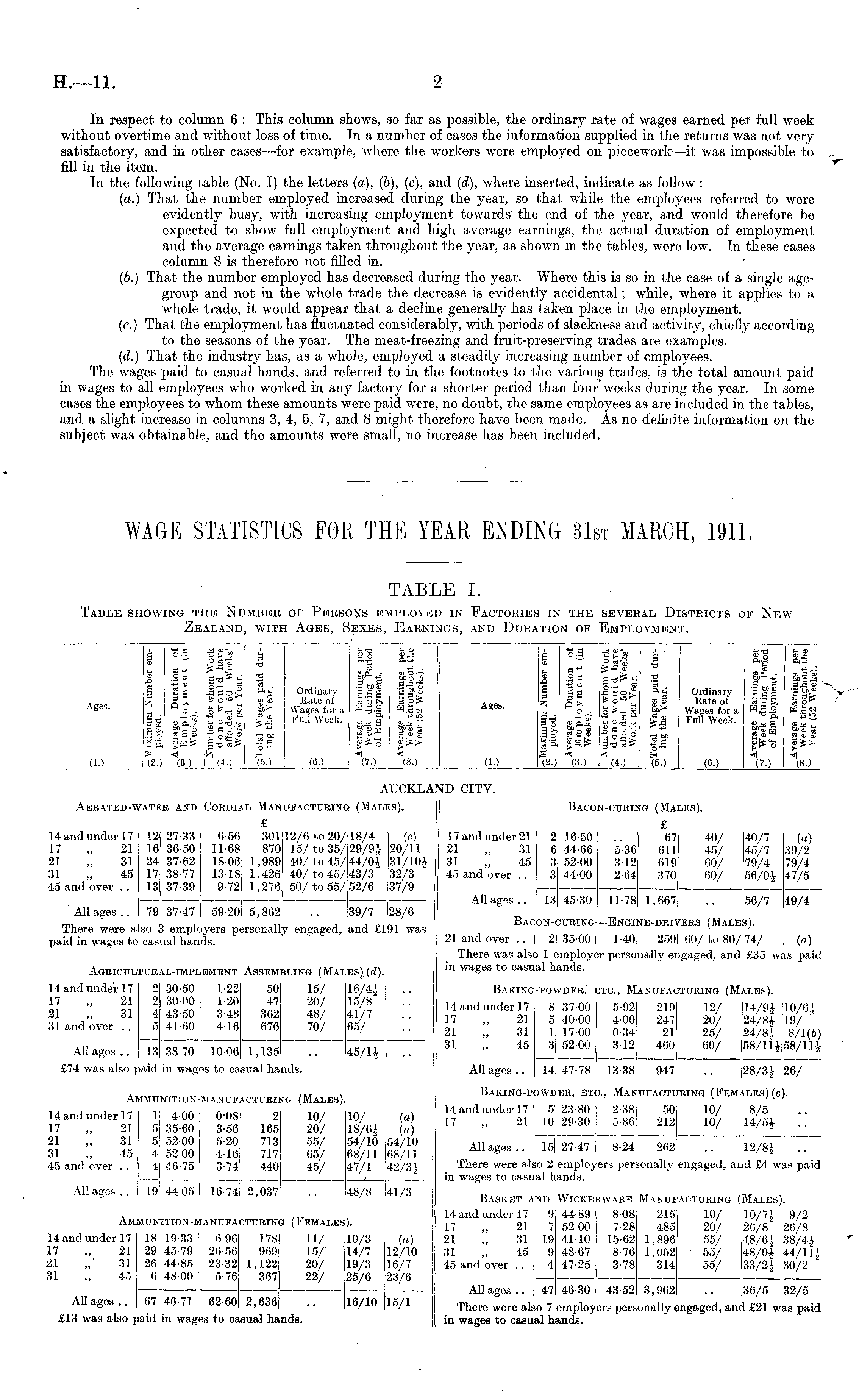 In respect to column 6 : This column shows, so far as possible, the ordinary rate of wages earned per full week without overtime and without loss of time. In a number of cases the information supplied in the returns was not very satisfactory, and in other cases—for example, where the workers were employed on piecework—it was impossible to fill in the item. In the following table (No. I) the letters (a), (b), (c), and (d), where inserted, indicate as follow : — (a.) That the number employed increased during the year, so that while the employees referred to were evidently busy, with increasing employment towards the end of the year, and would therefore be expected to show full employment and high average earnings, the actual duration of employment and the average earnings taken throughout the year, as shown in the tables, were low. In these cases column 8 is therefore not filled in. (&.) That the number employed has decreased during the year. Where this is so in the case of a single agegroup and not in the whole trade the decrease is evidently accidental; while, where it applies to a whole trade, it would appear that a decline generally has taken place in the employment, (c.) That the employment has fluctuated considerably, with periods of slackness and activity, chiefly according to the seasons of the year. The meat-freezing and fruit-preserving trades are examples. (d.) That the industry has, as a whole, employed a steadily increasing number of employees. The wages paid to casual hands, and referred to in the footnotes to the various trades, is the total amount paid in wages to all employees who worked in any factory for a shorter period than four weeks during the year. In some cases the employees to whom these amounts were paid were, no doubt, the same employees as are included in the tables, and a slight increase in columns 3, 4, 5, 7, and 8 might therefore have been made. As no definite information on the subject was obtainable, and the amounts were small, no increase has been included.