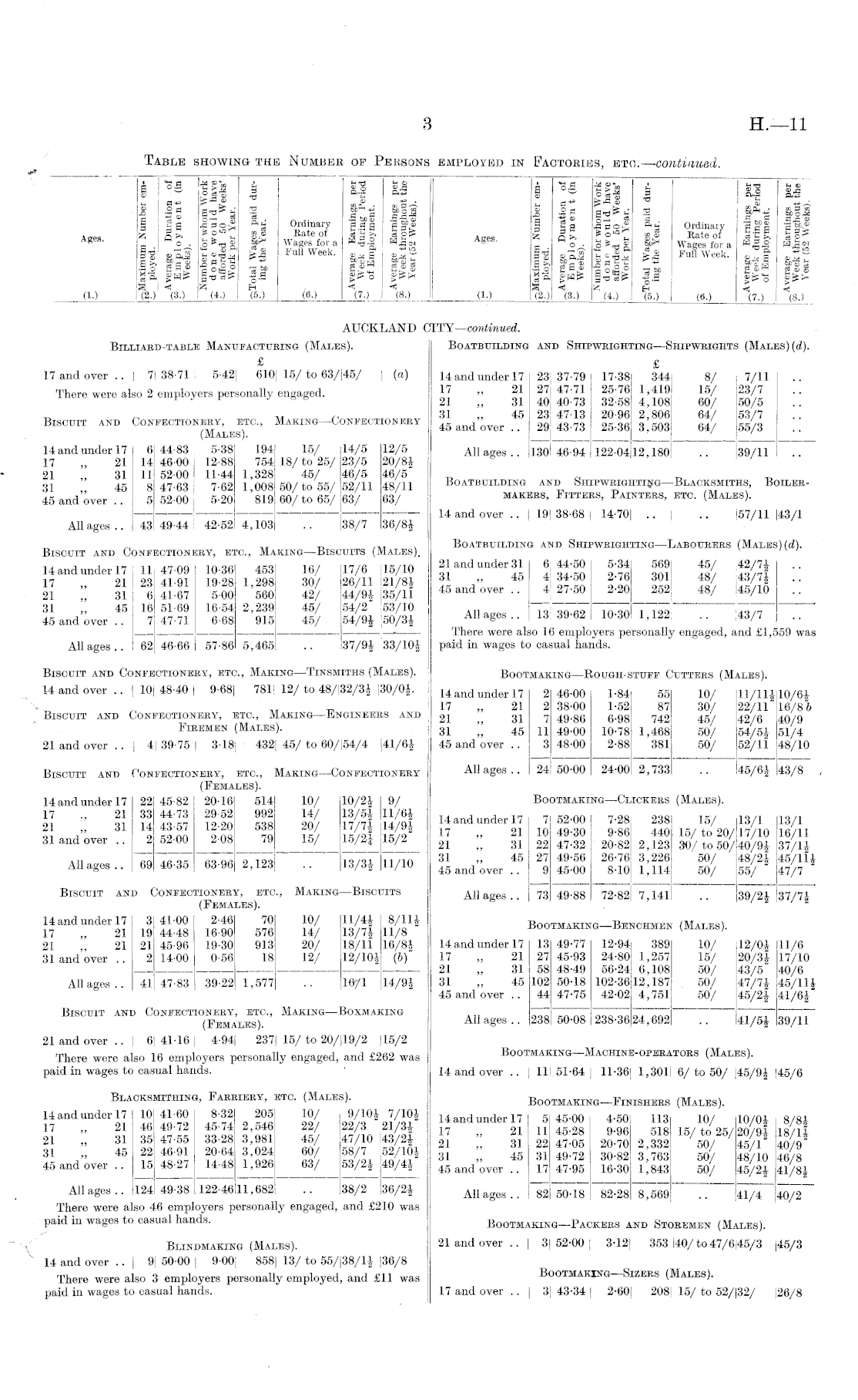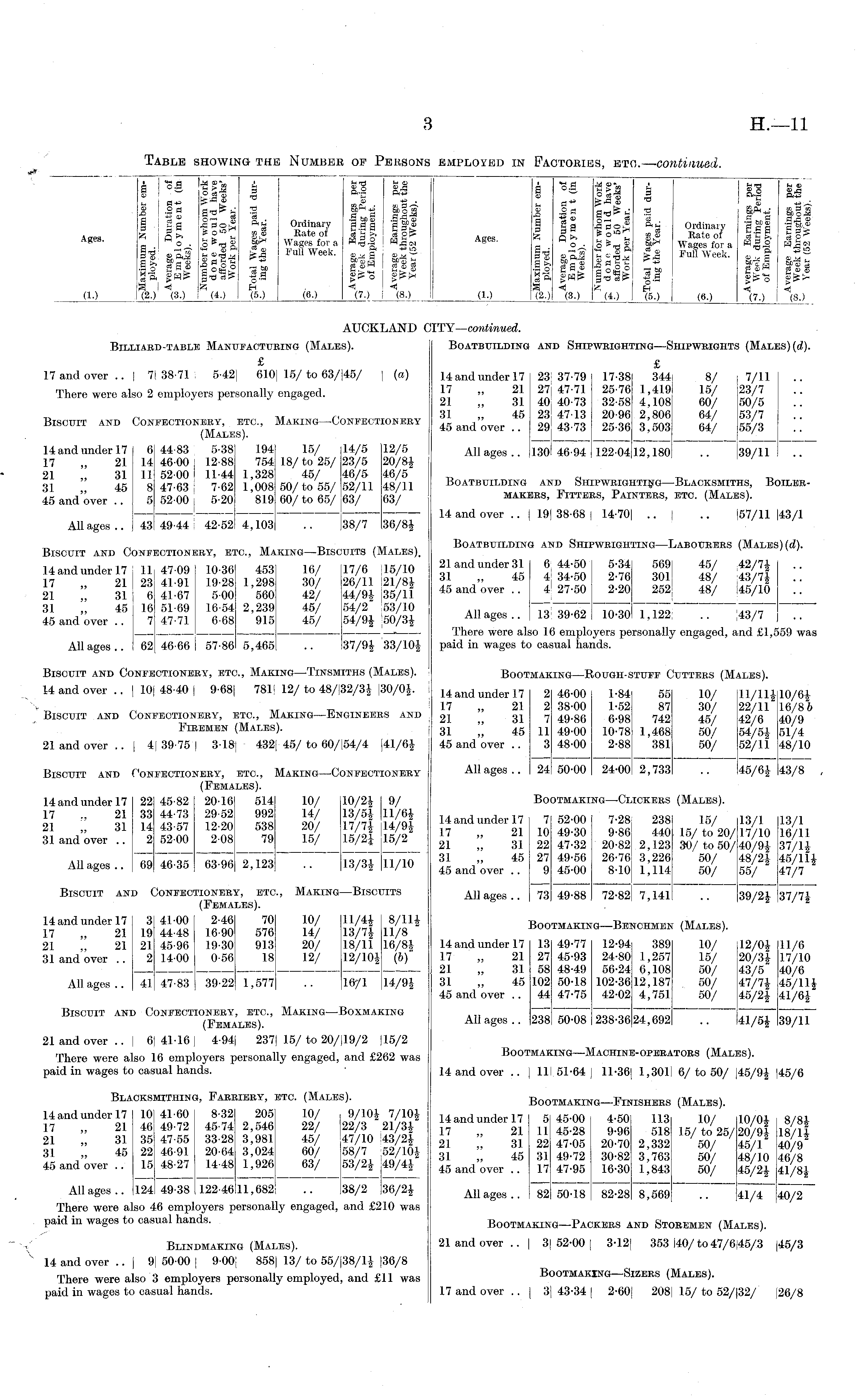 Ages. a \*& U'a s so : P 25 03 -5 U i H HH if^S so OH .- -9 so 'j§ 1 .1 g a -S'SoS °"** Ordinary I 3° iSo '"t, Si Rate of -, o . o *-a £ »•** Wages for a ii' agi isifl *s " ullWeek - So gSo sSo3p 93 cm d» S -g.S a I 4 ir, H (2.) (3.) (4.) (5.) (6.) iSTS ts 6C*-HH .9 »S S.SS =a '9 rhS 9 "a COS S 4 (7.) CD ° P--5 •fi"r50 Bfl'S ■a go 33 d Or-" +- IO 03 M w OB'S '1 eS 0 eS gp-rH 4 (8.) Ages. i S a ir. Sts s& p. _(2.) "S3 fl" .2 s sa «>> ° hO. AA 9,0S g a « 4 (3.) ■V «i- 1 fl i7 (O rH m $ %*** 1 2 -\ —. 03 -v .* \r V A-S-H-g-g r=g s°«| «|? ir, H (4.) (5.) 1 rH n-( Mf-HJ Ordinary '3 g>§ Hate of a XS sa. Wages for a « 3,3 Full Week. 0 , & aid («-) (7.) tn 91 C0J3 9.HA w SO'oi CMoOS S-o S •9 tr.,03 P SH10S S3 OH . OS 03 03 90AJ3.'H4 (8.) (1.) (10 AUCKLAND C !ITY — continued. Billiard-table Manufacturing (Males). Boatbuilding and Shipwrighting—Shipwrights (Males) (d). £ 17 and over .. j 71 38-71 5-42J 610 15/ to 63/145/ | (a) x 14andunderl7 23' 37-79 17-38 344: 8/ 7/11 17 „ 21 27:47-71 25-76 1,419 15/ 23/7 21 „ 31 40 40-73 32-58 4,108 60/ 50/5 31 „ 45 23 47-13 20-96 2,806 64/ 53/7 45 and over .. 29 43-73 25-36 3,503 64/ 55/3 Allages.. 130'46-94 122-0412,180 .. J39/11 There were also 2 employers personally engaged. Biscuit and Confectionery, etc., Making—Confectionery (Males). 14 and under 17 6 44-83 5-38 194 15/ 14/5 12/5 17 „ 21 14 4600 12-88 754 18/ to 25/ 23/5 20/8$ 21 „ 31 11 5200 : 11-44 1,328 45/ 46/5 46/5 31 „ 45 8 47-63 7-62 1,008 50/to 55/ 52/1.1 48/11 45 and over .. 5 5200 , 5-20 819 60/ to 65/ 63/ 63/ Allages.. 43 49-44 42-52 4,103 .. 38/7 36/81 Boatbuilding and Shipwrighting—Blacksmiths, Boilermakers, Fitters, Painters, etc. (Males). 14 and over.. | 19j 38-68 14-70| .. | .. |57/11 |43/1 Biscuit and Confectionery, etc., Making—Biscuits (Males). Boatbuilding and Shipwrighting—Labourers (Males) (d). ONFl 21 and under 31 6 44-50 5-34! 5691 45/ 42/71 31 „ 45 4] 34-50 2-76 301 48/ 43/71 45 and over .. 4 1 27-50 2-20 252; 48/ 145/10 Allages.. 13 39-62 10-30 1,122. .. (43/7 There were also 16 employers personally engaged, and £1,559 was paid in wages to casual hands. 14 and under 17 ! 11 4709 10-36 453 16/ 17/6 45/10 17 „ 21 I 23 41-91 19-28 1,298 30/ 26/11 121/8$ 21 „ 31 i 6 41-67 5-00 560 42/ 44/9$ 35/11 31 „ 45 16 51-69 16-54 2,239 45/ 54/2 53/10 45 and over .. 7 47-71 6-68 915 45/ 54/9$ ;50/3$ Allages.. 62 46-66 57-86 5,465 .. 37/9$ 33/10$ 11 23 i 6 16 7 62 Biscuit and Confectionery, etc., Making—Tinsmiths (Males). 14 and over .. | 10| 48-40 j 9-68J 781: 12/ to 48/32/3$ |30/0$. Bootmaking—Rough-stuff Cutters (Males). Biscuit and Confectionery, etc., Making—Engineers and Firemen (Males). 14andunder 17 2 46-00 1-84 55 10/ 11/11$10/6$ 17 „ 21 2 38-00 1-52 87 30/ 22/11 16/8 6 21. „ 31 7 49-86 6-98 742 45/ 42/6 40/9 31 „ 45 11 49-00 10-78 1,468 50/ 54/51 51/4 45 and over.. 3 48-00 2-88 381 50/ 52/11 48/10 Allages.. 24 50-00 24-00 2,733 .. 45/61 43/8 21 and over .. | 4| 39-75 j 3-18] 432[ 45/ to 60/154/4 (41/6$ Biscuit and Confectionery, etc., Making—Confectionery (Females). 14 and under 17 22 45-82 20-16 514 10/ 10/2$ 9/ 17 ., 21 33 44-73 29-52 992 14/ 13/5$ 11/6$ 21 „ 31 14 43-57 12-20 538 20/ 17/7$ 14/9$ 31 and over .. 2 5200 208 79 15/ 15/2J 15/2 Allages.. 69 46-35 63-96 2,123 .. 13/3$ 11/10 Bootmaking—-Clickers (Males). 14 and under 17 7 52-00 7-28 238 15/ 13/1 13/1 17 „ 21 10 49-30 9-86 440. 15/to 20/17/10 16/11 21 „ 31 22 47-32 20-82 2,123 30/to 50/40/9$ 37/1$ 31 „ 45 27 49-56 26-76 3,226 50/ 48/21 45/11) 45 and over .. 9 45-00 8-10 1,114 50/ 55/ 47/7 Allages.. 73 49-88 72-82 7,141 .. 39/21 37/71 Biscuit and Confectionery, etc., Making—Biscuits (Females). 14 and under 17 3 41-00 2-46 70 10/ 11/4$ 8/11$ 17 „ 21 19 44-48 16-90 576 14/ 13/7$ 11/8 21 „ 21 21 45-96 19-30 913 20/ 18/11 16/8$ 31 and over .. 2 14-00 0-56 18 12/ 12/10$ (6) Allages.. 4147-83 39-22 1,577 .. 16/1 14/9$ Bootmaking—Benchmen (Males). Boo14andunder 17 13 49-77 1.2-94 389 10/ 12/0$ 11/6 17 „ 21 27 45-93 24-80 1,257 15/ 20/31 17/10 21 „ 31 58 48-49 56-24 6,108 50/ 43/5 40/6 31 „ 45 102 50-18 102-3612,187 50/ 47/7$ 45/111 45 and over .. 44 47-75 42-02 4,751 50/ 45/2$ 41/6$' Allages.. 238 50-08 238-36 24,692 .. 141/5$ 39/11 13 27 58 102 44 Biscuit and Confectionery, etc., Making—Boxmaking (Females). 21 and over .. I 6| 41-16 j 4-94! 237) 15/ to 20/19/2 J15/2 There were also 16 employers personally engaged, and £262 was paid in wages to casual hands. Bootmaking—Machine-operators (Males). 238 'MAI 14 and over .. | 111 51-64 J 11-36| 1,3011 6/to 50/ |45/9$ |45/6 1 11 Blacksmithing, Farriery, etc. (Males). 14andunderl7 10 41-60 8-32 205 10/ , 9/10$ 7/10$ 17 „ 21 46 49-72 45-74 2,546 22/ J22/3 21/3$ 21 „ 31 35 47-55 33-28 3,981 45/ 47/10 43/2$ 31 „ 45 22 46-91 20-64 3,024 60/ 58/7 52/10$ 45 and over.. 15 48-27 14-48 1,926 63/ 53/2$ 49/4$ Allages.. 124 49-38 122-4611,682: .. 38/2 J36/2$ There were also 46 employers personally engaged, and £210 was paid in wages to casual hands. Bootmaking—Finishers (Males). 14andunder 17 5 45-00 4-50 113 10/ 10/0$ 8/8$ 17 „ 21 11 45-28 9-96 518 15/to 25/20/9$ 18/1$ 21 „ 31 22 47-05 20-70 2,332 50/ 45/1 40/9 31 „ 45 31 49-72 i 30-82 3,763 50/ 48/10 46/8 45 and over .. 17 47-95 16-30 1,843 50/ 45/2$ 41/8$ Allages.. 82 50-18 82-28 8,569 .. 41/4 40/2 5 11 22 31 17 Bootmaking—Packers and Storemen (Males). Blindmaking (Males). 14 and over .. | 9| 50-00 [ 9-00| 858| 13/ to 55/(38/1$ |36/8 There were also 3 employers personally employed, and £11 was paid in wages to casual hands. 21 and over.. I 3| 52-00 [ 3-12| 353 140/to 47/6(45/3 |45/3 |45/3 Bootmaking—Sizers (Males). Handover.. | 3| 43-34 j 2-60J 208| 15/to 52/|32/ |26/8 126/8