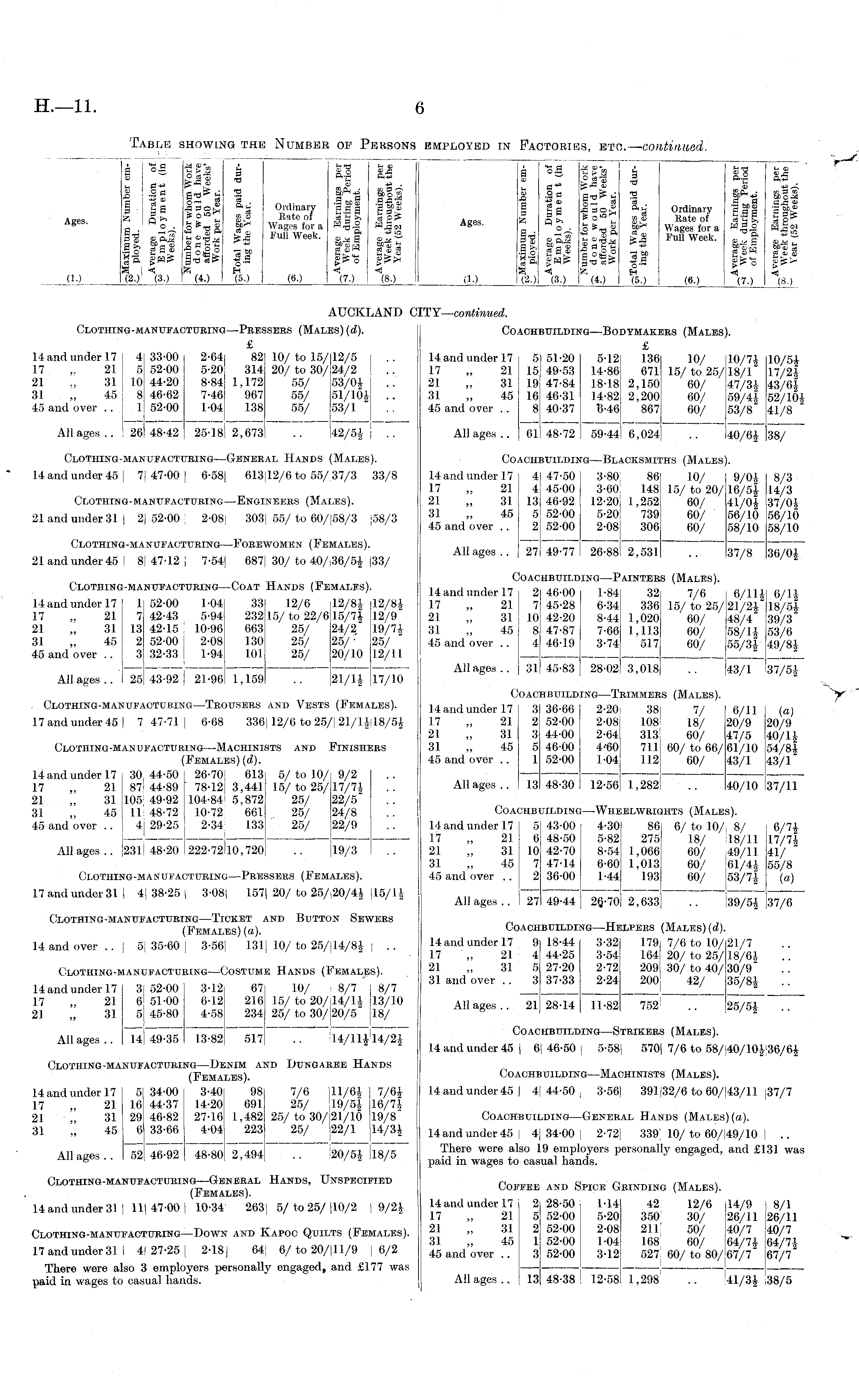 Ages. a *e t>s M sa g^i*s - a « ~ s I !•£ **° s '"" b ■ 5-4 a^S 3 © S3 tn 03 rH, aa ■-o gas ■es s 2.° gPi S W r= |5lgrt 3 : <! rn (2.) (3.) (4.) .2 'Ss ft sJ C3 a-S fi S3 ifS3 o9 cm £ a o — H (5.) Ordinary Kate of Wages for a Full Week. O..S S^HH.Sag s.ss « 9 >, 'S3 9 o (7.) tH CD 93 r, ShS HH §>5js .s-a» OS Or" 1 HH ir, an jh — gr-x 4 (8.) Ages. (1.) l §: -° 'S At 5 gfl 3 3 a rH flf, B. hH — in BY S. Oh.M fl >, M e o> .Bo ?s B so go, ?Hr 3 4 (2.) (3.) o loss tZ £ 03 SiO S3 91 H, O— °* is o^^ 3 % Ph is "-ga s|i! t_ T3 03 I-* ir. (4.) 3 T3 S3 '3 °h ih Ordinary g so Kate of ■»■* Wages for a &S Full Week. MS M ■8 s O—' (5.) j (6.) 03 *=■ K„« e.ss 13 H. A-, &3s •3-3, so .a a CM-Oa.-es oo hh !--•£ 4 (7.) 03 SZ &00-* Cjq oi St t&oi ° ££ 2.- L \* lJ (8.) (I.) (6.) AUCKLAND < TY— continued. Clothing-manufacturing—Pressers (Males) (d). x 14 and under 17 4 33-00 2-64| 82 10/to 15/12/5 17 ,. 21 5 52-00 5-20 314 20/to 30/24/2 21 ., 31(10 44-20 8-84 1,172 55/ 53/0$ 31 „ 45 j 8 46-62 7-46 967 55/ 51/10$ .. 45 and over .. . 1 52-00 1-04 138 55/ 53/1 All ages .. 26 48-42 25-18 2,673 .. 1-42/SJ j .. Coachbuilding—Bodymakers (Males). £ 14 and under 17 5 51-20 5-12 136 10/ 10/7$ 10/5$ 17 „ 21 15 49-53 14-86 671 15/ to 25/18/1 17/2$ 21 „ 31 19 47-84 18-18 2,150 60/ 47/3$ 43/6$ 31 „ 45 16 46-31 14-82 2,200 60/ 59/4$ 52/10$ 45 and over .. 8 40-37 6-46 867 60/ 53/8 41/8 Allages.. 61 48-72 59-44 6,024 .. !40/6$ 38/ lOh: Clothing-manufacturing—General Hands (Males). 14 and under 45 | 7 '■ 47-00 [ 6-58] 613(12/6 to 55/37/3 33/8 Coachbuilding—Blacksmiths (Males). Hand under 17 4 47-50 3-80; 86 10/ 9/0$ 8/3 17 „ 21 4 45-00 3-60! 148 15/ to 20/ 16/5$ 14/3 21 „ 31 13 46-92 12-20! 1,252 60/ 41/0$ 37/0$ 31 „ 45 5 52-00 5-20! 739 60/ 56/10 56/10 45 and over .. 2 52-00 2-08 306 60/ 58/10 58/10 Allages.. 27 49-77 26-88 2,531 .. 37/8 36/0$ Clothing-manufacturing—Engineers (Males). 21 and under 31 ! 2(52-00 2-08: 3031 55/ to 60/158/3 ;58/3 Clothing-manufacturing—Forewomen (Females). 21 and under 45 ! 8147-12! 7-54| 687| 30/ to 40/36/5$ (33/ Clothing-manufacturing—Coat Hands (Females). Hand under 17 i 1 52-00 1-04 33 12/6 12/8$ 12/8$ 17 ,. 21 7 42-43 5-94 23215/ to 22/615/7$ 12/9 21 „ 31 13 42-15 10-96 663 25/ 24/2 19/7$ 31 „ 45 2 52-00 2-08 130 25/ 25/' 25/ 45 and over .. 3 32-33 i 1-94 101 25/ 20/10 12/11 Allages.. 25 43-92 | 21-96 1,159 .. 21/1$ 17/10 Coachbuilding—Painters (Males). Hand under 17 2146-00 1-84 32 7/6 6/11$ 6/1$ 17 „ 21 7 45-28 6-34 336 15/to 25/21/2$ 18/5$ 21 „ 31 10 42-20 8-44 1,020 60/ 48/4 39/3 31 „ 45 8 47-87 7-66 1,113 60/ 58/1$ 53/6 45 and over .. 4 46-19 3-74 517 60/ 55/3$ 49/8$ Allages.. 31 45-83 28-02 3,018 .. 43/1 37/5$ Coachbuilding—Trimmers (Males). r Clothing-manufacturing—Trousers and Vests (Females). 17andunder45| 7 47-71 ( 6-68 336, 12/6 to25/! 21/l$:18/5$ Hand under 17 3 36-66 2-20: 38: 7/ 6/11 (a) 17 „ 21 2 52-00 2-08: 108 18/ 20/9 20/9 21 „ 31 3 44-00 2-64! 313 60/ 47/5 40/1$ 31 „ 45 5 46-00 4*60 71L 60/to 66/61/10 54/8$ 45 and over .. 1 52-00 1-04 112| 60/ 43/1 43/1 Allages.. 13 48-30 12-56 I.282 1 .. 40/10 37/11 Clothing-manufacturing—Machinists and Finishers (Females) (d). 14 and under 17 30 44-50! 26-70! 613 5/ to 10/ 9/2 17 „ 21 87 44-89 f 78-12! 3,441 15/to 25/17/7$ 21 „ 31 105 49-92 104-84 ! 5,872 25/ 22/5 31 „ 45 11 48-72 10-72 661 25/ 24/8 45 and over .. 4 29-25 | 2-34 133 25/ 22/9 Allages.. |23ll 48-20 !222-72ll0,720 .. 19/3 Coachbuilding —Wheelwrights (Males). 14 and under 17 j 5 43-00 4-30 86: 6/to 10/ 8/ 6/7$ 17 „ 21 ( 6 48-50 5-82 275 18/ 18/11 17/7$ 21. „ 31 10 42-70 8-54 1,066 60/ 49/11 41/ 31 „ 45 7 47-14 6-60 1,013 60/ ! 61/4$ 55/8 45 and over .. 2 36-00 1-44 193 60/ '53/7$ (a) Clothing-manufacturing—Pressers (Females). 17 and under 31 j 4| 38-25 | 3-08[ 157( 20/ to 25/20/4$ |15/1$ Allages.. 27 49-44 26/70 2,633 .. 39/5$ 37/6 Clothing-manufacturing—Ticket and Button Sewers (Females) (a). Handover..] 5| 35-60 3-56! 131[ 10/ to 25/(14/8$ f .. Coachbuilding—Helpers (Males) (d). Hand under 17 9 18-44 3-32 179: 7/6 to 10/21/7 17 „ 21 4 44-25 3-54 164! 20/ to 25/18/6$ 21 „ 31 5 27-20 2-72 209: 30/ to 40/ 30/9 31 and over .. 3 37-33 2-24 200( 42/ 35/8$ Allages.. 2128-14 11-82 752 ! .. 25/5$ Clothing-manufacturing—Costume Hands (Females). Hand under 17 3; 52-00 3-12 67 10/ 8/7 8/7 17 „ 21 6 51-00 6-12 216 15/to 20/14/1$ 13/10 21 „ 31 5 45-80 4-58 234 25/ to 30/20/5 18/ Allages.. 14! 49-35 13-82 517 .. 14/ll$ l 14/2$ Coachbuilding—Strikers (Males). 14 and under 45 [ 6| 46-50 j 5-58| 570| 7/6 to 58/j40/10$'36/6$ Clothing-manufacturing—Denim and Dungaree Hands (Females). Hand under 17 5 34-00 3-40 98: 7/6 (11/6$ 7/6$ 17 „ 21 16 44-37 14-20 691! 25/ .19/5$ 16/7$ 21 „ 31 29 46-82 27-16 1,482! 25/to 30/(21/10 19/8 31 „ 45 6 33-66 4-04 223( 25/ 22/1 14/3$ Allages.. 52[ 46-92 48-80 2,494| .. 20/5$ 18/5 Coachbuilding—Machinists (Males). 14andunder45| 4| 44-50 , 3-56| 391(32/6 to 60/(43/11 |37/7 Coachbuilding—General Hands (Males) (a). 14 and under 45] 4(34-00! 2-72J 339, 10/ to 60/149/10 | .. There were also 19 employers personally engaged, and £131 was paid in wages to casual hands. Clothing-manufacturing—General Hands, Unspecified (Females). 14 and under 31 1 11(47-00; 10-34 263( 5/ to 25/ [10/2 ! 9/2$ Coffee and Spice Grinding (Males). Clothing-manufacturing—Down and Kapoc Quilts (Females). 17andunder31 I 4127-25! 2-18) 64! 6/to 20/! 11/9 «/2 There were also 3 employers personally engaged, and £177 was paid in wages to casual hands. Hand under 17 2 28-50, 1-14 42 12/6 44/9 8/1 17 „ 21 5 52-00 5-20 350 30/ J26/11 26/11 21 „ 31 2 52-00 2-08 211 50/ 40/7 40/7 31 „ 45 1 52-00 1-04 168 60/ j64/7$ 64/7$ 45 and over .. 3 52-00 3-12 527 60/ to 80/67/7 67/7 Allages.. 13 48-38 ! 12-58 1,298 .. ! 41/3$ 38/5